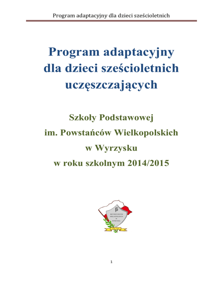 Program adaptacyjny dla dzieci sześcioletnich Program adaptacyjny dla dzieci sześcioletnich uczęszczających Szkoły Podstawowej im. Powstańców Wielkopolskich w Wyrzysku w roku szkolnym 2014/2015 1 Program adaptacyjny dla dzieci sześcioletnich I. WSTĘP „Z odrobiną sukcesu, zachęty, zaufania W środowisku sprzyjającym pracy Dziecko może dotrze do krańców świata”. Celestyn Freinet Fakt pójścia do szkoły stanowi bardzo ważny w życiu dziecka. Zapał do rozpoczęcia nauki w szkole jest dobrym wskaźnikiem osiągnięcia dojrzałości. Rozpoczynając edukację szkolną, sześciolatek wkracza w nowy nieznany etap w życiu. Przejście z przedszkola i adaptacja do nowych warunków szkolnych stanowią istotny i bardzo trudny przełom w sposobie dotychczasowego życia. Podjęcie nowej roli ucznia wymaga wielu umiejętności emocjonalnych, społecznych i poznawczych. Dlatego ważne jest, by dziecko poznawało nowe otoczenie w poczuciu bezpieczeństwa. Prezentowany program adaptacji do warunków szkolnych to propozycja działań pedagogicznych, które sprzyjają rozładowaniu negatywnych emocji dziecka, zapewniają mu poczucie bezpieczeństwa w szkole oraz zdobywanie umiejętności wykorzystywania nabywanych wiadomości podczas wykonywania zadań i rozwiązywania problemów. Koncepcja działań w zakresie łagodnej adaptacji sześciolatka w szkole dostosowana jest do założeń podstawy programowej kształcenia ogólnego dla szkół podstawowych – I etapu edukacyjnego obejmującego klasy I-III (Rozporządzenie MEN z dania 30 maja 2014r. zmieniające rozporządzenie w sprawie podstawy programowej wychowania przedszkolnego oraz kształcenia ogólnego w poszczególnych typach szkół). II. CELE OGÓLNE PROGRAMU 1. Nabywanie doświadczeń i poczucia bezpieczeństwa w środowisku szkolnym. 2. Umożliwienie uczniom adaptacji do warunków szkolnych. 3. Wspieranie dziecka oraz jego rodziny w nowej sytuacji. 2 Program adaptacyjny dla dzieci sześcioletnich III. CELE SZCZEGÓŁOWE PROGRAMU W stosunku do ucznia Wspomaganie w procesie przystosowania do funkcjonowania w nowych warunkach. Nawiązanie dobrych relacji nauczyciel – uczeń, wzajemne poznanie się. Zmniejszenie napięć emocjonalnych w pierwszych kontaktach ze szkołą. Kształcenie poczucia przynależności do grupy rówieśniczej oraz umiejętności podporządkowania się regułom ustalonym w klasie. Poznanie i akceptowanie zasad obowiązujących w klasie i szkole. W stosunku do rodziców: Wskazanie rodzicom mocnych stron, możliwości i sukcesów, jakie może odnieść dziecko w szkole. Zapoznanie z sytuacjami trudnymi, z którymi dziecko może spotkać się w szkole- udzielanie wsparcia i pomocy. Poznanie nauczyciela ich dziecka. Integracja rodziców między sobą. Zapoznanie rodziców z organizacją pracy szkoły, świetlicy, stołówki. Zaproszenie rodziców do współpracy z nauczycielem – budowanie wzajemnych relacji opartych na zaufaniu. IV. PRZEWIDYWANE EFEKTY Uczeń: Czuje się bezpiecznie w murach szkoły. Szanuje nauczyciela i kolegów w klasie. Potrafi pracować w zespole, nie ma uprzedzeń, porozumiewa się ze wszystkimi w grupie. Jest akceptowany. 3 Program adaptacyjny dla dzieci sześcioletnich Rodzic: Ma świadomość, że jego dziecko czuje się w szkole bezpiecznie. Zna nauczycieli oraz per solnej szkoły i pomieszczenia szkoły. Chętnie współpracy z nauczycielem. Uczestniczy w programie adaptacyjnym. Obserwuje swoje dziecko na tle rówieśników – dostrzega, jakie trudności musi pokonać jego dziecko, wie, w jaki sposób wspomóc jego rozwój i w jaki sposób organizowana jest pomoc szkole. Nauczyciel: Poznaje uczniów. Zna środowisko rodzinne. Planuje pracę w oparciu o wyniki obserwacji rozwoju dzieci. Zna oczekiwania rodziców. V. SPOSÓB REALIZACJI ZAMIERZEŃ Lp. Założone treści – podejmowane działania 1. Nawiązanie bliskiego i serdecznego kontaktu z nauczycielem i innym dziećmi 2. 3. Pomoc dziecku w odnajdywaniu miejsca w zespole klasowym i społeczności szkolnej Zapoznanie się z pomieszczeniami szkoły i pracownikami Forma realizacji Powitanie dzieci w pierwszym dniu w szkole, przedstawianie się poprzez zabawę integracyjną, rozmowy z uczniami i rodzicami Zabawy integrujące Wycieczka po szkole, poznanie pomieszczeń 4 Termin realizacji Pierwszy dzień zajęć szkolnych Kolejne dni w szkole, początek roku szkolnego Początek edukacji Uwagi Przedstawienie rodzicom programu adaptacyjnego, zachęcanie do jego wspólnej realizacji Program adaptacyjny dla dzieci sześcioletnich 4. 5. Zapoznanie z zasadami bezpiecznego poruszania się w drodze do i ze szkoły Zawarcie „kontraktu” – ustalenie norm i reguł obowiązujących w zespole klasowym i w szkole, przestrzeganie określonych zasad zachowania się w szkole, poznanie sposobów rozwiązywania konfliktów w grupie rówieśniczej 6. Organizowanie spotkań z rodzicami – drzwi otwarte klasy; stwarzanie sytuacji sprzyjających integracji rodziców między sobą, ze szkołą nauczycielem i pracowników szkoły (np. nauczyciela świetlicy, bibliotekarki, sekretarki szkoły, dyrektora itp.) Ćwiczenia praktyczne, pokaz multimedialny Rozmowa z dziećmi, zabawy („drama”, „drzewko decyzyjne”) - zabawy integrujące rodziców i dzieci z, nauczycielem - zajęcia warsztatowe dla rodziców i dzieci, - rozmowy na temat adaptacji dzieci, - wymiana adresów internetowychprzekazywanie informacji drogą e -mailową, - zapoznanie z Konwencją Praw Dziecka, - przekazywanie informacji o postępach rozwojowych 5 Wrzesień, początek roku szkolnego Wrzesień Wrzesień – każdy wtorek miesiąca w godzinach 16.00 – 17.00; Październik – raz na dwa tygodnie; Listopad i kolejne miesiące – raz w miesiącu Program adaptacyjny dla dzieci sześcioletnich uczniów w formie ustnej i pisemnej 7. 8. 9. 10. 11. Poznanie i nazywanie swoich stanów emocjonalnych Rozmowa, pokaz, oraz nabywanie drama umiejętności radzenia sobie w sytuacjach przykry