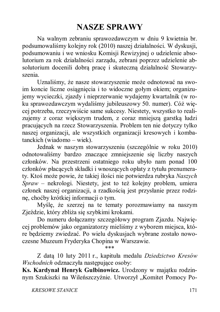 NASZE SPRAWY Na walnym zebraniu sprawozdawczym w dniu 9 kwietnia br. podsumowaliśmy kolejny rok (2010) naszej działalności. W dyskusji, podsumowaniu i we wniosku Komisji Rewizyjnej o udzielenie absolutorium za rok działalności zarządu, zebrani poprzez udzielenie absolutorium docenili dobrą pracę i skuteczną działalność Stowarzyszenia. Uznaliśmy, że nasze stowarzyszenie może odnotować na swoim koncie liczne osiągnięcia i to widoczne gołym okiem; organizujemy wycieczki, zjazdy i nieprzerwanie wydajemy kwartalnik (w roku sprawozdawczym wydaliśmy jubileuszowy 50. numer). Cóż więcej potrzeba, rzeczywiście same sukcesy. Niestety, wszystko to realizujemy z coraz większym trudem, z coraz mniejszą garstką ludzi pracujących na rzecz Stowarzyszenia. Problem ten nie dotyczy tylko naszej organizacji, ale wszystkich organizacji kresowych i kombatanckich (wiadomo – wiek). Jednak w naszym stowarzyszeniu (szczególnie w roku 2010) odnotowaliśmy bardzo znaczące zmniejszenie się liczby naszych członków. Na przestrzeni ostatniego roku ubyło nam ponad 100 członków płacących składki i wnoszących opłaty z tytułu prenumeraty. Ktoś może powie, że takiej ilości nie potwierdza rubryka Naszych Spraw – nekrologi. Niestety, jest to też kolejny problem, umiera członek naszej organizacji, a rzadkością jest przysłanie przez rodzinę, choćby krótkiej informacji o tym. Myślę, że szerzej na te tematy porozmawiamy na naszym Zjeździe, który zbliża się szybkimi krokami. Do numeru dołączamy szczegółowy program Zjazdu. Najwięcej problemów jako organizatorzy mieliśmy z wyborem miejsca, które będziemy zwiedzać. Po wielu dyskusjach wybrane zostało nowoczesne Muzeum Fryderyka Chopina w Warszawie. *** Z datą 10 luty 2011 r., kapituła medalu Dziedzictwo Kresów Wschodnich odznaczyła następujące osoby: Ks. Kardynał Henryk Gulbinowicz. Urodzony w majątku rodzinnym Szukiszki na Wileńszczyźnie. Utworzył „Komitet Pomocy PoKRESOWE STANICE 171 lakom na Wschodzie”. Bibliografia jego dorobku naukowego obejmuje ponad 300 publikacji, z czego znaczna część jest związana z historią Kresów Wschodnich. Autor i inicjator akcji remontu kościoła w Powiewórce, gdzie został ochrzczony późniejszy Marszałek Polski Józef Piłsudski. Za swoją długoletnią działalność dla Kresów został przez Dolnoślązaków nazwany „Kresowym Kardynałem”. Tadeusz Wabiszczewicz. Urodzony w Osowie na Polesiu. Inicjator budowy od podstaw kościoła w Osowie, oraz Domu Miłosierdzia – Hospicjum w Łabiszynie koło Pińska. Niestrudzony działacz i Prezes Wrocławskiego Towarzystwa Miłośników Wołynia i Polesia. Grażyna Elżbieta Orłowska-Sondej. Jest najbardziej zaangażowaną dziennikarką Dolnośląskiej Telewizji w działalności na rzecz Kresów Wschodnich. Jej praca to widoczne efekty odrestaurowania ponad 20 cmentarzy. Realizując ponad 400 reportaży o Kresach, stała się posiadaczką ogromnego archiwum tego rejonu. Helena Romana Dolińska. Wnuczka osadnika wojskowego z osady wojskowej Podleszczówka Wielka pow. Podhajce woj. Tarnopolskie. Wiceprezes Wojewódzkiego Związku Sybiraków w Opolu. Z jej inicjatywy powstało wiele znaków pamięci, jak: Symboliczna Mogiła w wydzielonej kwaterze na cmentarzu, tablica epitafijna w Katedrze Opolskiej i urny z ziemią pochodzącą ze wszystkich cmentarzy polskich żołnierzy z okresu II wojny światowej. Henryka Dobosz. Córka osadnika wojskowego z osady Wola Piłsudskiego na Wołyniu. Aktywny członek Związku Sybiraków, jest sekretarzem Wojewódzkiego Oddziału Związku Sybiraków. Uczestniczka pielgrzymki do Rzymu 17 listopada 1991 na kanonizację o. Rafała Kalinowskiego – patrona Sybiraków. Halina Maria Dedejczyk-Macielińska. Urodzona w Berezie Kartuskiej na Polesiu. Nieprzerwanie od ponad 20 lat jest członkiem Zarządu Oddziału Wojewódzkiego Towarzystwa Miłośników Wołynia i Polesia. Na bieżąco aktywnie współpracuje z organizacjami polskimi na Polesiu. Jej największym sukcesem, jest dostarczenie regionalnych strojów ludowych, dla zespołu „Karolinka” z Brześcia. Antoni Lenkiewicz. Historyk, prawnik, działacz opozycji antykomunistycznej. Redaktor Naczelny Wrocławskiej Gazety Polskiej. Jest autorem wielu biograficznych książek o wielkich Polakach. Stały 172 KRESOWE STANICE wieloletni współpracownik kwartalnika KRESOWE STANICE. Jego kalendarium polskich zmagań z Rosją Sowiecką w latach 1939-1989 nieprzerwanie publikujemy na naszych łamach. *** Wpłaty na działalność Stowarzyszenia w okresie od 1 lutego do 30 kwietnia 2011 r.: Napierała Teresa Spicewicz Barbara Wierzbicki Romuald Walkowiak Janina Szydło Stanisław Bartoszek Elwira Łapiński Tadeusz Dobosz Henryka Niedzielska Leokadia Daniszewska Zofia Mączko Izabella Pawłowska Zofia Babuśka Adam Włodarski Józef Kaczanowska Irena Kołudzki Stobbe Romuald Kozaczuk Leokadia Szewczyk Maria Łysy Łucja Pawłowska-Fiutak Maria Dobek Mieczysław Hensolt Irena Bykowska Filomena Harasimowicz Konrad Kilian Stanisława Ursyn Niemcewicz Witold Panocka Anna Drozdowicz Maria Figlarz Jerzy Krauze Aleksander Szabunio Anna Klęk Stanisław KRESOWE STANICE 24 zł 24 zł 124 zł 24 zł 110 zł 24 zł 24 zł 44 zł 28 zł 24 zł 24 zł 40 zł 44 zł 24 zł 64 zł 100 zł 24 zł 24 zł 74 zł 24 zł 24 zł 30 zł 24 zł 24 zł 100 zł 24 zł 74 zł 100 zł 30 zł 30 zł 56 zł 40 zł Górczak-Mechlińska Maria24 zł Szymański Leon 50 zł Szklarski Wacław 24 zł Wasiewicz Stefania 24 zł Jancz Janina 24 zł Łapińska Helena 24 zł Krzysztofiak Roman 10 zł Pawlak Krystyna 20 zł Herman Mirosława 24 zł Adamus Zbigniew 116 zł Szymański Kazimierz 24 zł Dolińska Romana 28 zł Jankowski Tadeusz 24 zł Kocur Irena 24 zł Abramajtys Zofia 14 zł Kerr Roman 300 zł Zielonka Kazimiera 24 zł Polkowski Tadeusz 24 zł Maziarz Maria 74 zł Wołocznik Zbigniew 24 zł Bonikowska Zofia 24 zł Żarczyński Romuald 74 zł Misztak Mirosław 12
