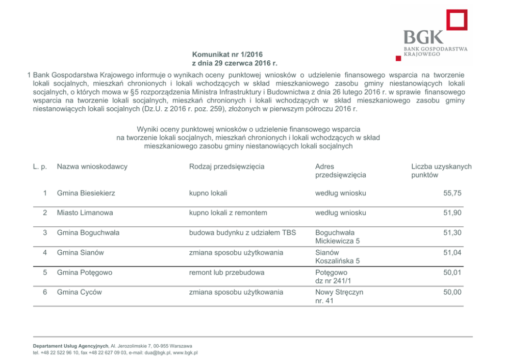 Komunikat nr 1/2016 z dnia 29 czerwca 2016 r. 1 Bank Gospodarstwa Krajowego informuje o wynikach oceny punktowej wniosków o udzielenie finansowego wsparcia na tworzenie lokali socjalnych, mieszkań chronionych i lokali wchodzących w skład mieszkaniowego zasobu gminy niestanowiących lokali socjalnych, o których mowa w § 5 rozporządzenia Ministra Infrastruktury i Budownictwa z dnia 26 lutego 2016 r. w sprawie finansowego wsparcia na tworzenie lokali socjalnych, mieszkań chronionych i lokali wchodzących w skład mieszkaniowego zasobu gminy niestanowiących lokali socjalnych (Dz.U. z 2016 r. poz. 259), złożonych w pierwszym półroczu 2016 r. Wyniki oceny punktowej wniosków o udzielenie finansowego wsparcia na tworzenie lokali socjalnych, mieszkań chronionych i lokali wchodzących w skład mieszkaniowego zasobu gminy niestanowiących lokali socjalnych L. p. Nazwa wnioskodawcy Rodzaj przedsięwzięcia Adres przedsięwzięcia 1 Gmina Biesiekierz kupno lokali według wniosku 55,75 2 Miasto Limanowa kupno lokali z remontem według wniosku 51,90 3 Gmina Boguchwała budowa budynku z udziałem TBS Boguchwała Mickiewicza 5 51,30 4 Gmina Sianów zmiana sposobu użytkowania Sianów Koszalińska 5 51,04 5 Gmina Potęgowo remont lub przebudowa Potęgowo dz nr 241/1 50,01 6 Gmina Cyców zmiana sposobu użytkowania Nowy Stręczyn nr. 41 50,00 Departament Usług Agencyjnych, Al. Jerozolimskie 7, 00-955 Warszawa tel. +48 22 522 96 10, fax +48 22 627 09 03, e-mail: [email protected], www.bgk.pl Liczba uzyskanych punktów L. p. Nazwa wnioskodawcy Rodzaj przedsięwzięcia Adres przedsięwzięcia 7 Gmina Miasto Lębork budowa budynku Lębork Marusarzówny/ Czecha 49,41 8 GMINA CIECHOCINEK budowa budynku z udziałem TBS Ciechocinek Nieszawska 149b 48,64 9 GMINA CIECHOCINEK budowa budynku z udziałem TBS Ciechocinek Nieszawska 149b 48,64 10 Zarząd Komunalnych Lokalowych Sp. z o.o. Poznań ul. Dymka 48,40 11 GMINA DRAWNO remont lub przebudowa Drawno Kiełpino 18 46,50 12 Gmina Miechów zmiana sposobu użytkowania Miechów Falniów 59 46,44 13 Gmina Żelechów budowa budynku Żelechów Pałacowa 1 45,55 14 Zarząd Komunalnych Lokalowych Sp. z o.o. Poznań ul. Bolka 45,24 15 Miasto Ostrów Mazowiecka budowa budynku Ostrów Mazowiecka Wołodyjowskiego 23A 44,73 16 Miasto Ostrów Mazowiecka budowa budynku Ostrów Mazowiecka Wołodyjowskiego 23B 44,73 17 Gmina Sępólno Krajeńskie zmiana sposobu użytkowania Sępólno Krajeńskie Zalesie 37 44,67 18 Gmina Miastko zmiana sposobu użytkowania Miastko Mickiewicza 2 44,60 19 Gmina Nowogród Bobrzański remont lub przebudowa Nowogród Bobrzański ul. Żymierskiego 2 43,88 Zasobów budowa budynku Zasobów budowa budynku 2/9 Liczba uzyskanych punktów L. p. Nazwa wnioskodawcy Rodzaj przedsięwzięcia Adres przedsięwzięcia 20 Gmina Miejska Zabrze remont lub przebudowa Zabrze 3 Maja 27/8 42,76 21 Gmina Lipno remont lub przebudowa Kłokock dz nr 200 /1 41,24 22 Gmina Milanówek zmiana sposobu użytkowania Milanówek Wojska Polskiego 85 41,06 23 Gmina Kępice kupno lokali według wniosku 40,81 24 Gmina Brody zmiana sposobu użytkowania Zasieki nr. 27 40,35 25 Gmina Kępice kupno lokali według wniosku 39,06 26 Gmina Olecko budowa budynku Imionki obręb Możne dz.171 37,27 27 Gmina Miasto Świdnica budowa budynku z udziałem TBS Świdnica ul. Spółdzielcza 2 37,01 28 Gmina Miasta Gdańska budowa budynku z udziałem TBS Gdańsk Unruga bud 1A i 2A 36,47 29 Miasto Ostrów Mazowiecka budowa budynku Ostrów Mazowiecka Wołodyjowskiego 23 36,13 30 Gmina Człopa budowa budynku Człopa Brzozowa 35,86 31 Gmina Milanówek remont lub przebudowa Milanówek Wojska Polskiego 85 35,31 32 Gmina Krosno remont lub przebudowa Krosno Tysiąclecia 11 35,03 3/9 Liczba uzyskanych punktów L. p. Nazwa wnioskodawcy Rodzaj przedsięwzięcia Adres przedsięwzięcia 33 Gmina Komorniki budowa budynku Plewiska ul. Szkolna 35,03 34 GMINA MIASTA TORUŃ budowa budynku Toruń Guliwera 13-15 34,56 35 Gmina Miejska Zabrze remont lub przebudowa Zabrze Sikorskiego 128 m 7, 9 33,77 36 Gmina Miejska Zabrze remont lub przebudowa Zabrze gen. J. Dąbrowskiego 23 33,77 37 Gmina Miejska Zabrze remont lub przebudowa Zabrze J. Chojnickiego 19/3 33,77 38 Gmina Miejska Zabrze zmiana sposobu użytkowania Zabrze 3 Maja 55/6 33,77 39 Gmina Miejska Zabrze remont lub przebudowa Zabrze Nocznickiego 6/7 33,61 40 Gmina Sulechów zmiana sposobu użytkowania Sulechów ul. Przemysłowa 33,23 41 Gmina Stare Miasto budowa budynku Kazimierów Kazimierów 31 32,68 42 MIASTO BYDGOSZCZ remont lub przebudowa Bydgoszcz różne adresy 31,86 43 Gmina Miejska Zabrze remont lub przebudowa Zabrze H. Sienkiewicza 10A/4 31,78 44 Gmina Strzegowo budowa budynku Strzegowo Słowackiego 31,41 45 Gmina Miasto Radomsko remont lub przebudowa Radomsko Fabianiego 24 31,15 4/9 Liczba uzyskanych punktów L. p. Nazwa wnioskodawcy Rodzaj przedsięwzięcia Adres przedsięwzięcia 46 Miasto Gorzów Wielkopolski remont lub przebudowa Gorzów Wielkopolski wg wniosku 30,58 47 Gmina Sosnowiec zmiana sposobu użytkowania Sosnowiec Mikołajczyka 25 30,41 48 Gmina-Miasto Płock budowa budynku z udziałem TBS Płock Franciszka Kleeberga 30,40 49 Gmina Miejska Zabrze remont lub przebudowa Zabrze ks. J Badestinusa 26/3 30,21 50 Gmina Swarzędz budowa budynku Swarzędz dz. 169/7 30,00 51 Miasto Piastów budowa budynku Piastów Sułkowskiego 30,00 52 Gmina Skarszewy zmiana sposobu użytkowania Pogódki dz nr 414 29,96 53 Gmina Miejska Iława kupno lokali według wniosku 27,99 54 Gmina Kielce budowa budynku Kielce Tartaczna 27,91 55 Gmina Myślibórz kupno lokali z remontem według wniosku 27,64 56 GMINA SŁUPSK budowa budynku z udziałem TBS Lubuczewo Gmina Słupsk 25,98 57 Przedsiębiorstwo Gospodarki remont lub przebudowa Mieszkaniowej Żyrardów Sp. z o.o. Żyrardów 1-go Maja 33A 25,57 58 Przedsiębiorstwo Gospodarki remont lub przebudowa Mieszkaniowej Żyrardów Sp zoo Żyrardów Słowackiego 12 25,57 5/9 Liczba uzyskanych punktów L. p. Nazwa wnioskodawcy R