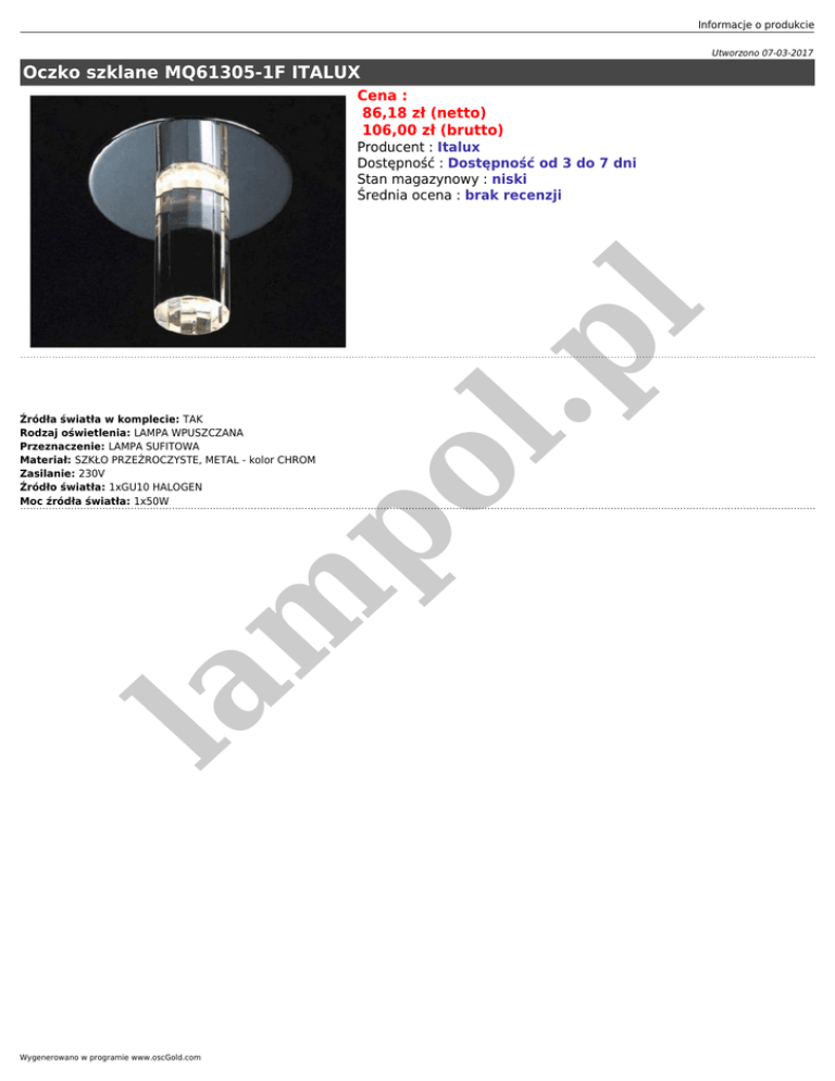 Informacje o produkcie Utworzono 07-03-2017 Oczko szklane MQ61305-1F ITALUX Cena : 86,18 zł (netto) 106,00 zł (brutto) la m po Źródła światła w komplecie: TAK Rodzaj oświetlenia: LAMPA WPUSZCZANA Przeznaczenie: LAMPA SUFITOWA Materiał: SZKŁO PRZEŹROCZYSTE, METAL - kolor CHROM Zasilanie: 230V Źródło światła: 1xGU10 HALOGEN Moc źródła światła: 1x50W l.p l Producent : Italux Dostępność : Dostępność od 3 do 7 dni Stan magazynowy : niski Średnia ocena : brak recenzji Wygenerowano w programie www.oscGold.com