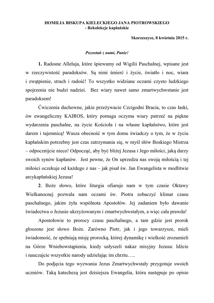 HOMILIA BISKUPA KIELECKIEGO JANA PIOTROWSKIEGO - Rekolekcje kapłańskie Skorzeszyce, 8 kwietnia 2015 r. Pozostań z nami, Panie! 1. Radosne Alleluja, które śpiewamy od Wigilii Paschalnej, wpisane jest w rzeczywistość paradoksów. Są nimi śmierć i życie, światło i noc, wiara i zwątpienie, strach i radość! To wszystko widziane oczami czysto ludzkiego spojrzenia nie budzi nadziei. Bez wiary nawet samo zmartwychwstanie jest paradoksem! Ćwiczenia duchowne, jakie przeżywacie Czcigodni Bracia, to czas łaski, ów ewangeliczny KAIROS, który pomaga oczyma wiary patrzeć na piękne wydarzenia paschalne, na życie Kościoła i na własne kapłaństwo, które jest darem i tajemnicą! Wasza obecność w tym domu świadczy o tym, że w życiu kapłańskim potrzebny jest czas zatrzymania się, w myśl słów Boskiego Mistrza – odpocznijcie nieco! Odpocząć, aby być bliżej Jezusa i Jego miłości, jaką darzy swoich synów kapłanów. Jest pewne, że On uprzedza nas swoją miłością i tej miłości oczekuje od każdego z nas – jak pisał św. Jan Ewangelista w modlitwie arcykapłańskiej Jezusa! 2. Boże słowo, które liturgia ofiaruje nam w tym czasie Oktawy Wielkanocnej pozwala nam oczami św. Piotra zobaczyć klimat czasu paschalnego, jakim żyła wspólnota Apostołów. Jej zadaniem było dawanie świadectwa o Jezusie ukrzyżowanym i zmartwychwstałym, a więc cała prawda! Apostołowie to prorocy czasu paschalnego, a tam gdzie jest prorok głoszone jest słowo Boże. Zarówno Piotr, jak i jego towarzysze, mieli świadomość, że spełniają misję prorocką, której dynamikę i wielkość zrozumieli na Górze Wniebowstąpienia, kiedy usłyszeli nakaz misyjny Jezusa: Idźcie i nauczajcie wszystkie narody udzielając im chrztu….. Do podjęcia tego wyzwania Jezus Zmartwychwstały przygotuje swoich uczniów. Taką katechezą jest dzisiejsza Ewangelia, która następuje po opisie spotkania uczniów z Jezusem na drodze do Emaus. Ci, którzy tego doznali byli pierwszymi misjonarzami, ponieważ mimo nocy wrócili do Jerozolimy i mówili: „Widzieliśmy Pana”. Jednak cała reszta uczniów była pełna wątpliwości, dopiero ponowna obecność Zmartwychwstałego z przesłaniem „Pokój wam” miała im dać odwagę wiary, oczyścić z wątpliwości i dać doświadczenie rzeczywistej obecności Jezusa Zmartwychwstałego. Miejsce spotkania z Jezusem staje się laboratorium wiary tak, jak w wieczerniku przy spotkaniu z niewiernym Tomaszem Apostołem. Nawet Zmartwychwstały Jezus musi przejść przez drogę pokory, kiedy wątpiącym uczniom mówi: „Dotknijcie Mnie i przekonajcie się…” 3. Ta pokora Jezusa wciąż trwa w darze Eucharystii, kiedy mówi nam „Bierzcie i jedzcie”, „Bierzcie i pijcie”. To kolejny paradoks paschalnych wydarzeń! Dlatego w naszym życiu nie domagajmy się pokory od Jezusa, ale sami bądźmy pokorni. Darem Eucharystii, tym skarbem powierzonym Kościołowi i nam, jako jego sługom napełniajmy nasze serca, aby jak uczniowie z Emaus iść do świata nawet pośród niechęci, krytyki i niewiary. Mówić mamy z przekonaniem: „Widzieliśmy Pana” i wciąż głosimy wam to, czego sami doświadczyliśmy, jak pisał św. Jan Apostoł w swoim pierwszym liście! Rzeczywistość paradoksów nadal trwa, jak widzimy to w pokornym wręcz świętym życiu abp. Dom Helder Camary z Brazylii! Pełni nadziei paschalnej oraz ewangelicznie bogaci miłością i nadzieją, która sięga dalej niż nasze spojrzenie, idźmy do świata z darem Ewangelii, jako współcześni prorocy. Swoim uczyńcie przesłanie Ojca Świętego Franciszka z Wielkiego Czwartku, aby odczytywać Ewangelię w świetle znaków współczesności, a wtedy zrozumiecie głębiej dzieło ewangelizacji, jaką Chrystus powierza nam w Kościele. Niech Eucharystia, która jest codziennym aktem konsekracji nas samych i świata wokół nas neutralizuje zło, które wciąż jest tak agresywne! Niech na tej drodze towarzyszy nam Maryja, której opiece was powierzam. Amen.