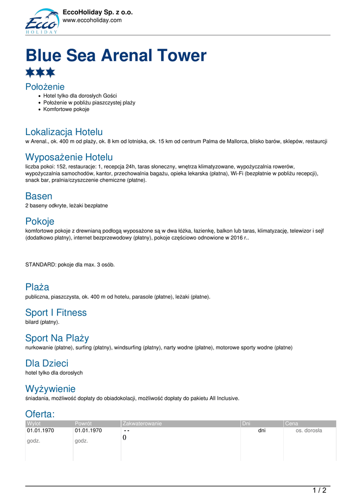EccoHoliday Sp. z o.o. www.eccoholiday.com Blue Sea Arenal Tower Położenie Hotel tylko dla dorosłych Gości Położenie w pobliżu piaszczystej plaży Komfortowe pokoje Lokalizacja Hotelu w Arenal., ok. 400 m od plaży, ok. 8 km od lotniska, ok. 15 km od centrum Palma de Mallorca, blisko barów, sklepów, restaurcji Wyposażenie Hotelu liczba pokoi: 152, restauracje: 1, recepcja 24h, taras słoneczny, wnętrza klimatyzowane, wypożyczalnia rowerów, wypożyczalnia samochodów, kantor, przechowalnia bagażu, opieka lekarska (płatna), Wi-Fi (bezpłatnie w pobliżu recepcji), snack bar, pralnia/czyszczenie chemiczne (płatne). Basen 2 baseny odkryte, leżaki bezpłatne Pokoje komfortowe pokoje z drewnianą podłogą wyposażone są w dwa łóżka, łazienkę, balkon lub taras, klimatyzację, telewizor i sejf (dodatkowo płatny), internet bezprzewodowy (płatny), pokoje częściowo odnowione w 2016 r.. STANDARD: pokoje dla max. 3 osób. Plaża publiczna, piaszczysta, ok. 400 m od hotelu, parasole (płatne), leżaki (płatne). Sport I Fitness bilard (płatny). Sport Na Plaży nurkowanie (płatne), surfing (płatny), windsurfing (płatny), narty wodne (płatne), motorowe sporty wodne (płatne) Dla Dzieci hotel tylko dla dorosłych Wyżywienie śniadania, możliwość dopłaty do obiadokolacji, możliwość dopłaty do pakietu All Inclusive. Oferta: Wylot 01.01.1970 Powrót 01.01.1970 godz. godz. Zakwaterowanie -() Dni dni Cena os. dorosła 1/2 EccoHoliday Sp. z o.o. www.eccoholiday.com 2/2 Powered by TCPDF (www.tcpdf.org)