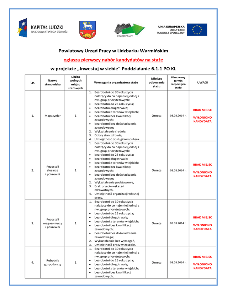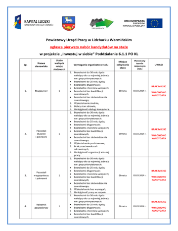 Powiatowy Urząd Pracy w Lidzbarku Warmioskim ogłasza pierwszy nabór kandydatów na staże w projekcie „Inwestuj w siebie” Poddziałanie 6.1.1 PO KL Lp. Nazwa stanowiska 1. Magazynier 2. Pozostali ślusarze i pokrewni 3. Pozostali magazynierzy i pokrewni 4. Robotnik gospodarczy Liczba wolnych miejsc stażowych 1 1 1 1 Wymagania organizatora stażu 1. Bezrobotni do 30 roku życia należący do co najmniej jednej z nw. grup priorytetowych: bezrobotni do 25 roku życia; bezrobotni długotrwale; bezrobotni z terenów wiejskich; bezrobotni bez kwalifikacji zawodowych; bezrobotni bez doświadczenia zawodowego; 2. Wykształcenie średnie, 3. Dobry stan zdrowia, 4. Umiejętnośd obsługi komputera. 1. Bezrobotni do 30 roku życia należący do co najmniej jednej z nw. grup priorytetowych: bezrobotni do 25 roku życia; bezrobotni długotrwale; bezrobotni z terenów wiejskich; bezrobotni bez kwalifikacji zawodowych; bezrobotni bez doświadczenia zawodowego; 2. Wykształcenie podstawowe, 3. Brak przeciwwskazao zdrowotnych, 4. Umiejętnośd organizacji własnej pracy. 1. Bezrobotni do 30 roku życia należący do co najmniej jednej z nw. grup priorytetowych: bezrobotni do 25 roku życia; bezrobotni długotrwale; bezrobotni z terenów wiejskich; bezrobotni bez kwalifikacji zawodowych; bezrobotni bez doświadczenia zawodowego; 2. Wykształcenie bez wymagao, 3. Umiejętnośd pracy w zespole. 1. Bezrobotni do 30 roku życia należący do co najmniej jednej z nw. grup priorytetowych: bezrobotni do 25 roku życia; bezrobotni długotrwale; bezrobotni z terenów wiejskich; bezrobotni bez kwalifikacji zawodowych; Miejsce odbywania stażu Planowany termin rozpoczęcia stażu UWAGI BRAK MIEJSC Orneta 03.03.2014 r. WYŁONIONO KANDYDATA BRAK MIEJSC Orneta 03.03.2014 r. WYŁONIONO KANDYDATA BRAK MIEJSC Orneta 03.03.2014 r. WYŁONIONO KANDYDATA BRAK MIEJSC Orneta 03.03.2014 r. WYŁONIONO KANDYDATA 5. Robotnik budowlany 1 2. 3. 1. 2. 3. 1. 6. Pozostali pracownicy sprzedaży i pokrewni gdzieindziej niesklasyfikow anie 1 2. 3. 4. 1. 7. Pozostali pracownicy sprzedaży i pokrewni gdzieindziej niesklasyfikow anie 1 2. 3. 4. 1. 8. Szlifierz szkła płaskiego 2 2. 3. 4. 5. 1. 9. Przewodnik turystyczny terenowy 1 bezrobotni bez doświadczenia zawodowego; Wykształcenie bez wymagao, Umiejętnośd pracy w zespole. Bezrobotny do 25 roku życia, Długotrwale bezrobotny, Bezrobotny bez doświadczenia zawodowego. Bezrobotni do 30 roku życia należący do co najmniej jednej z nw. grup priorytetowych: bezrobotni do 25 roku życia; bezrobotni długotrwale; bezrobotni z terenów wiejskich; bezrobotni bez kwalifikacji zawodowych; bezrobotni bez doświadczenia zawodowego; Wykształcenie średnie, średnie zawodowe, Umiejętnośd pracy w zespole, Komunikatywnośd. Bezrobotni do 30 roku życia należący do co najmniej jednej z nw. grup priorytetowych: bezrobotni do 25 roku życia; bezrobotni długotrwale; bezrobotni z terenów wiejskich; bezrobotni bez kwalifikacji zawodowych; bezrobotni bez doświadczenia zawodowego; Wykształcenie średnie, średnie zawodowe, Umiejętnośd pracy w zespole, Komunikatywnośd. Bezrobotni do 30 roku życia należący do co najmniej jednej z nw. grup priorytetowych: bezrobotni do 25 roku życia; bezrobotni długotrwale; bezrobotni z terenów wiejskich; bezrobotni bez kwalifikacji zawodowych; bezrobotni bez doświadczenia zawodowego; Wykształcenie średnie – preferowane zawodowe, Odpornośd na stres, Praca w zespole, Umiejętnośd czytania rysunku technicznego. Bezrobotni do 30 roku życia należący do co najmniej jednej z nw. grup priorytetowych: bezrobotni do 25 roku życia; bezrobotni długotrwale; bezrobotni z terenów wiejskich; bezrobotni bez kwalifikacji zawodowych; BRAK MIEJSC Orneta 03.03.2014 r. WYŁONIONO KANDYDATA BRAK MIEJSC Lidzbark Warmioski 01.04.2014 r. WYŁONIONO KANDYDATA BRAK MIEJSC Lidzbark Warmioski 01.04.2014 r. WYŁONIONO KANDYDATA BRAK MIEJSC Lidzbark Warmioski 01.04.2013 r. WYŁONIONO KANDYDATÓW BRAK MIEJSC Lidzbark Warmioski 01.04.2014 r. WYŁONIONO KANDYDATA 2. 3. 4. 5. 6. 7. 8. 9. bezrobotni bez doświadczenia zawodowego; Wykształcenie wyższe, Mobilnośd uwagi (koncentracja), Kultura osobista, Komunikatywnośd, Sprawnosd fizyczna, Odpowiedzialnosd, Biegła znajomośd języka angielskiego, Dobra dykcja. W związku z poszukiwaniem kandydatów na wolne miejsca stażowe prosimy o kontakt z Biurem projektu: Powiatowy Urząd Pracy w Lidzbarku Warmioskim ul. Dębowa 8 11-100 Lidzbark Warmioski pok. 31 w godz. 7.00 - 15.00 tel. 89 767 33 39 wew. 29