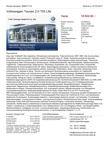 Numer zlecenia: 398817119 Wydruk z: 07.03.2017 Volkswagen Touran 2.0 TDI Life Cena: 18.502,00 Rodzaj nadwozia Kolor Moc Pojemność sko. Pierwsza rejestr. Przebieg Przekładnia Paliwo CO2-Effizenzklasse Liczba drzwi Leergewicht Van/Minibus Szary metalik 103 kW (140 KM) 1.968 ccm 10/2013 65.500 km 6-biegowa Olej napędowy B 4 1.560 kg Wyposażenie Zugr.-lgd. Kraftstoff: Olej napędowy, Klimatyzacja automatyczna, Felgi aluminiowe, ESP, ABS, Hak do przyczepy, Immobilizer, Dach przesuwny, Centralny zamek, Podnośnik szyby el., Radio, Poduszka powietrzna kierowcy, Poduszka powietrzna pasażera, Boczne poduszki powietrzne, Wspomaganie układu kierowniczego, Tempomat, Podgrzewanie foteli, Panoramadach, Bordcomputer, Multifunktionslenkrad, Mp3-Schnittstelle, Nebelscheinwerfer, Tagfahrlicht, Traktionskontrolle, Regensensor, Dachreling, Einparkhilfe vorn, Einparkhilfe hinten, Einparkhilfe (selbstlenkend), Drobnocząsteczkowy filtr sadzy, Wspomaganie parkowania, Lusterko zewnętrzne elektrycznie przestawiane, Kamera do wspomagania cofania, Gwarancja, Polsterfarbe: Szary, Tapicerka: Sitzbezüge Farbe Anthrazit/Titan, Getriebe 6-Gang Technik und Sicherheit Fahrlichtschaltung automatisch mit Tagfahrlicht Coming-home-Funktion und Leaving-home-Funktion, Geschwindigkeitsregelanlage, Mobiltelefonvorbereitung Plus, Kopfairbagsystem für Front- und Fondpassagiere inkl. Seitenairbags vorn (nicht für 3.Sitzreihe), Seitenairbags, Fahrerairbag, Airbag für Fahrer und Beifahrer mit Beifahrerairbag-Deaktivierung, Elektronisches Stabilisierungsprogramm (ESP) mit Gegenlenkunterstuetzung inkl. Komfortbremsassistent ABS EDS und ASR, ESP, Traktionskontrolle, Zentralverriegelung mit Safe-Sicherung Funkfernbedienung und 2 Funkklappschlüsseln, Servolenkung elektromechanisch geschwindigkeitsabhängig geregelt, Berganfahrassistent, Wegfahrsperre elektronisch, Regensensor, Müdigkeitserkennung, Außentemperaturanzeige, Multifunktionsanzeige Plus, Multifunktions-Display, Scheibenwaschdüsen vorn automatisch beheizt, Nebelscheinwerfer und Abbiegelicht, Leuchtweitenregulierung Multimedia Bedienelement für Radio, Radio RCD 510 mit TFT-Touchscreen MP3-Wiedergabefunktion und CD-Wechsler für 6 CDs Komfort Schiebedach, Panorama-Ausstell-/Schiebedach mit Panoramadach hinten, Parklenkassistent, Parklenkassistent Park Assist inkl. ParkPilot für Front- und Heckbereich, Elektrische Fensterheber, Außenspiegel elektrisch, Außenspiegel elektrisch einstell- und beheizbar, Frontscheibe Wärmeschutzglas, Coming-Home-Funktion, Leaving-Home-Funktion, Rückfahrkamera Rear Assist Innenausstattung Sitzbezüge Farbe Anthrazit/Titanschwarz-Anthrazit/ Schwarz/Perlgrau, Vordersitze beheizbar, Klimaanlage Climatronic, Multifunktions-Lederlenkrad (3 Speichen)mit Bedienungsmöglichkeit für Multifunktionsanzeige Radio und Telefon, Lederlenkrad, Lendenwirbelstützen vorn, Mittelarmlehne vorn mit Ablagebox höhen- und längseinstellbar, Beifahrersitzlehne umklappbar mit Tisch- und Durchladefunktion, Gepäckraumabdeckung, Komfortsitze vorn Aussenausstattung Anhängevorrichtung abnehmbar, 4 Leichtmetallräder Oakland 7 J x 17 Zużycie / Emisja CO2* w mieście poza miastem kombinowany Emisja CO2 6,5 L/100 km 4,6 L/100 km 5,3 L/100 km 139 g/km * Dodatkowe oficjalne informacje o zużyciu paliwa i emisji CO2 nowych samochodów osobowych można znaleźć w przewodniku zużycia paliwa i emisji CO2 nowych samochodów osobowych, dostępnym bezpłatnie we wszystkich punktach sprzedaży oraz w Deutschen Automobil Treuhand GmbH pod adresem www.dat.de CO2-Effizenzklasse Dane kontaktowe Auf der Grundlage der gemessenen CO2-Emission unter Berücksichtigung der Masse des Fahrzeugs ermittelt. Fritz Thomas GmbH & Co. KG Lachtehäuser Str. 13 29223 Celle/Altenhagen Tel. 05141 709580 Fax 05141 382599 [email protected] http://autohaus-thomas-celle.de Numer zlecenia: 398817119 Volkswagen Touran 2.0 TDI Life Wydruk z: 07.03.2017