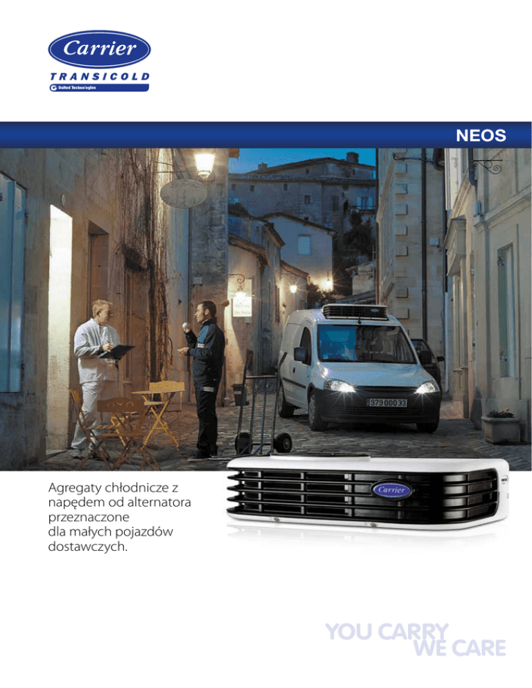 NEOS Agregaty chłodnicze z napędem od alternatora przeznaczone dla małych pojazdów dostawczych. PRAKTYCZNA KONSTRUKCJA Dzięki dwóm sposobom montażu agregat Neos może być montowany wewnątrz lub na zewnątrz pojazdu, co umożliwia dostosowanie go do typu zabudowy izotermicznej (montaż zintegrowany, czołowy, wnękowy lub dachowy), zależnie od indywidualnych potrzeb. Agregat jest również w pełni kompatybilny z układem klimatyzacji pojazdu, dzięki czemu zarówno kierowca jak też ładunek mają zapewnione chłodzenie podczas transportu. Napędzane od alternatora agregaty chłodnicze Neos, łączące w sobie funkcje ciągłego chłodzenia i grzania, mogą być instalowane w pojazdach o kubaturze do 6 m3. Dostępne w 2 wersjach, Slim i Split, stanowią uniwersalny i niezawodny wybór dla klientów wymagających ochrony przewożonego ładunku, niezawodności działania oraz wygody kierowcy. ZACHOWANIE ŁAŃCUCHA CHŁODNICZEGO Dzięki wydajności chłodniczej wynoszącej 1160 W w temperaturze 0°C, agregat Neos zapewnia doskonałe zabezpieczenie ładunku. PIERWSZY POD WZGLĘDEM BEZPIECZEŃSTWA I OCHRONY ŚRODOWISKA - Ochrona kierowcy: niezależnie od sposobu zamontowania agregat Neos nie powoduje pogorszenia bezpieczeństwa pojazdu ani osłabienia jego konstrukcji. - Troska o środowisko: w agregatach Neos stosowany jest bezchlorowy czynnik chłodniczy R134a, niepowodujący degradacji warstwy ozonowej. - Wydajne rozwiązanie: sprężarka agregatu Neos jest napędzana od alternatora, nie zaś bezpośrednio od silnika, w wyniku czego mniej jest przewodów i złączek, mniej czynnika chłodniczego i mniejsze ryzyko nieszczelności. MONTAŻ ZEWNĘTRZNY —DODATKOWA PRZESTRZEŃ Charakteryzująca się bardziej konwencjonalnym rozwiązaniem wersja Split jest montowana zewnętrznie z przodu lub na dachu pojazdu. Ta wersja, nadająca się do montażu we wszystkich typach pojazdów, zapewnia uzyskanie większej przestrzeni ładunkowej wewnątrz pojazdu. Niski parownik może być montowany we wszystkich, nawet najmniejszych, komorach chłodniczych. NEOS 100 S, wersja Split ZINTEGROWANA SPRAWNOŚĆ Estetycznie zaprojektowana wersja Slim charakteryzuje się najniższym profi lem na rynku, umożliwiającym wjazd na każdy parking. Zintegrowana z pojazdem smukła linia agregatu przyczynia się do poprawy aerodynamiki i zmniejszenia zużycia paliwa, zaś jego cicha praca zapewnia lepszy komfort pracy kierowcy. Ponadto agregat jest łatwy w konserwacji i serwisowaniu. Jest dostarczany fabrycznie skonfigurowany i przetestowany. NEOS 100, wersja Slim WYDAJNOŚĆ (W)* 0°C/30°C - 20°C/30°C NEOS 100 1160 NEOS 100 S WYPOSAŻENIE DODATKOWE SKRAPLACZ MASA (Kg) PAROWNIK • Wyłącznik drzwiowy działający przy otwieraniu drzwi Droga Standby Typ Masa (Kg) Wentylacja (m3/h) 63 70 nie dot. nie dot. 570 • Zestaw do montażu skraplacza w otworze w dachu (Neos 100 S) 48 53 MNS 600 15 700 • Wzmocnienie zabudowy izotermicznej (Neos 100) 450 • Zestaw do montażu skraplacza na dachu (Neos 100 S) • Moduł zasilania w trybie STANDBY • DataCOLD SPECYFI KACJA PRODUKTU • Praca w trybie DROGOWYM tylko przy zasilaniu 12 V* • Praca w trybie POSTÓJ przy zasilaniu 230/1/50 Hz-60 Hz • Automatyczne odszranianie gorącym gazem • Czynnik chłodniczy R134a • Kabinowy panel sterowania * Pojazd musi być wyposażony w alternator 125 A i akumulator 90 Ah 600 stacji serwisowych Carrier w Europie, Rosji, na Bliskim Wschodzie i w Afryce Carrier Transicold Europe S.C.S. L’Européen Bâtiment D 4 rue Joseph Monier F-92500 Rueil-Malmaison Phone : +33 (0)1 41 42 28 00 Fax : + 33 (0)1 41 42 28 28 www.carriertransicold.eu © Carrier Corporation – Carrier Transicold Europe S.C.S. au capital de 16 090 700 euros – R.C.S. Nanterre 410 041 776 - Kod APE 4669B – VAT: FR52410041776 – Informacje zawarte w niniejszym dokumencie nie są prawnie wiążące i nie mogą być powielane bez uprzedniej zgody. Wydrukowano we Francji (12-14/POL) 62-61093-141 NEOS