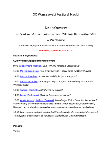 XX Warszawski Festiwal Nauki Dzień Otwarty w Centrum Astronomicznym im. Mikołaja Kopernika, PAN w Warszawie ul. Bartycka 18, dojazd autobusami 108 z Pl. Trzech Krzyży lub 167 z Woli i Ochoty Niedziela, 2 października 2016: Duża Sala Wykładowa: Cykl wykładów popularnonaukowych: 9:00 Włodzimierz Kluźniak, CTA – Wielki Teleskop Czerenkowa 10:00 Marek Demiański, Fale Grawitacyjne – nowe okno na Wszechświat 11:00 Dorota Rosińska, Kosmiczne źródła fal grawitacyjnych 12:00 Michał Różyczka, Uciekający horyzont – jak zmieniała się nasza wizja Wszechświata 13:00 Andrzej Zdziarski, Astrofizyka na palcach 14:00 Janusz Ziółkowski, Skąd się biorą czarne dziury? 15:00 Agata Kurzyk i Kathryn Zazenski, Knowledge Which Does Not Know Itself – artystyczny performance audiowizualny na temat medytacji, świadomości, fizjologii i psychologii związanych z postrzeganiem otaczającego nas świata; 15:15 Wszystko co chciałeś wiedzieć o Wszechświecie ale wstydziłeś się zapytać – na pytania publiczności odpowiadają wykładowcy Dnia Otwartego; Ponadto: Taras: 9:00 – 15:00 pracownicy CAMK i członkowie Polskiego Towarzystwa Miłośników Astronomii - pokazy plam słonecznych (przy bezchmurnej pogodzie); 9:00 – 15:00 – model Układu Słonecznego w skali 1:50 mln.; - układ pokazujący różnice siły ciążenia na powierzchni różnych ciał niebieskich; Biblioteka: 9:00 – 15:00 (pokazy co godzinę) - pokaz Tellurium – mechanicznego modelu Układu Słońce-Ziemia-Księżyc, wyjaśniającego zjawiska dnia i nocy, pór roku, zaćmień Słońca i Księżyca, faz Księżyca; organizator Leszek Zdunik; Sala Seminaryjna: 9:30 – 16:00 Wszechświat w Komputerze - pokazy astronomicznych programów komputerowych, organizator – Paweł Ciecieląg: Hall Główny 12:00 – pokaz eksperymentów fizycznych przygotowany przez PWN; W godzinach 9:00 -16:00 na terenie Centrum Astronomicznego otwarte będą stoiska: - Polskiego Towarzystwa Miłośników Astronomii, prezentujące sprzęt astronomiczny, zdjęcia i oferujące porady dla miłośników astronomii; - Klubu Almukantarat; - firm oferujących amatorski sprzęt optyczny do obserwacji astronomicznych; - wydawnictw z literaturą popularnonaukową ( Prószyński i S-ka, Wydawnictwo Naukowe PWN, oferujące rabaty); Sala Telewizyjna: 9:00 – 14:00 - Astronomiczne warsztaty dla dzieci w wieku 5-15 lat – jak zrobić z kartonu zegar słoneczny, modele statków kosmicznych, planet itp.