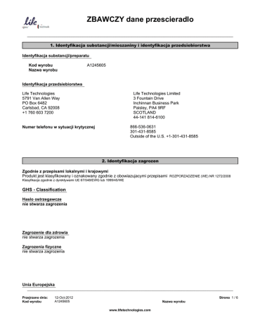 ZBAWCZY dane przescieradlo ________________________________________________________________________________________________________________ 1. Identyfikacja substancji/mieszaniny i identyfikacja przedsiebiorstwa Identyfikacja substancji/preparatu Kod wyrobu Nazwa wyrobu A1245605 Identyfikacja przedsiebiorstwa Life Technologies 5791 Van Allen Way PO Box 6482 Carlsbad, CA 92008 +1 760 603 7200 Life Technologies Limited 3 Fountain Drive Inchinnan Business Park Paisley, PA4 9RF SCOTLAND 44-141 814-6100 866-536-0631 301-431-8585 Outside of the U.S. +1-301-431-8585 Numer telefonu w sytuacji krytycznej 2. Identyfikacja zagrozen Zgodnie z przepisami lokalnymi i krajowymi Produkt jest klasyfikowany i oznakowany zgodnie z obowiazujacymi przepisami ROZPORZADZENIE (WE) NR 1272/2008 Klasyfikacja zgodnie z dyrektywami UE 67/548/EWG lub 1999/45/WE GHS - Classification Haslo ostrzegawcze nie stwarza zagrozenia Zagrozenie dla zdrowia nie stwarza zagrozenia Zagrozenia fizyczne nie stwarza zagrozenia Unia Europejska ________________________________________________________________________________________________________________ Przejrzano dnia: Kod wyrobu 12-Oct-2012 A1245605 Strona 1 / 6 Nazwa wyrobu www.lifetechnologies.com Rekawice ochronne EU Specific Hazard Statements R -zdanie(a) Zaden S -zdanie(a) S22 - Nie wdychac pylu Potencjalne skutki zdrowotne Oczy Skóra Wdychanie Polkniecie Efekty szczególne dzialanie rakotwórcze Dzialanie mutagenne Szkodliwe dzialanie na rozrodczosc Dzialanie uczulajace Skutki dla narazonych organów Moze powodowac podraznienie oczu u osób podatnych. Moze powodowac podraznienie skóry u osób podatnych. May be harmful by inhalation. Substancja moze byc szkodliwa po spozyciu. zaden zaden zaden zaden No known effects under normal use conditions 3. Sklad/informacja o skladnikach Nazwa Chemiczna Ammonium meta-Vanadate Copper compounds, inorganic Zinc compounds, inorganic Nr CAS 7803-55-6 None None Nr EINECS - Procent wagowy <0.01 <0.01 <0.01 Contact with acids or bleach liberates toxic gases. DO NOT ADD acids or bleach to any liquid wastes containing this product. Produkt nie zawiera substancji, które w podanych stezeniach moga byc uwazane za niebezpieczne dla zdrowia. Zalecamy obslugi wszystkich chemikaliów z ostroznoscia. 4. SRODKI PIERWSZEJ POMOCY Kontakt przez skóre Kontakt z oczami Polkniecie Wdychanie Uwagi dla lekarza Przeplukac obficie woda. If symptoms arise, call a physician. Natychmiast przeplukac duza iloscia wody, takze pod powiekami przynajmniej 15 minut Jesli objawy utrzymuja sie, wezwac lekarza Nieprzytomnej osobie nigdy nie podawac nic doustnie Jesli objawy utrzymuja sie, wezwac lekarza Nie wywolywac wymiotów bez konsultacji z lekarzem Przeniesc na swieze powietrze Jesli objawy utrzymuja sie, wezwac lekarza W przypadku braku oddychania zastosowac sztuczne oddychanie Leczenie objawowe. 5. POSTEPOWANIE W PRZYPADKU POZARU ________________________________________________________________________________________________________________ Przejrzano dnia: Kod wyrobu 12-Oct-2012 A1245605 Strona 2 / 6 Nazwa wyrobu www.lifetechnologies.com pyl wodny dwutlenek wegla (CO2) piana Suche proszki gasnicze Zalozyc sprzet do oddychania z obiegiem zamknietym i odziez ochronna. Stosowne srodki gasnicze Specjalne wyposazenie ochronne dla strazaków 6. POSTEPOWANIE W PRZYPADKU NIEZAMIERZONEGO UWOLNIENIA DO SRODOWISKA Indywidualne srodki ostroznosci Uzyc srodków ochrony osobistej Zdjac mechanicznie i zebrac do odpowiedniego pojemnika do czasu usuniecia Metody oczyszczania Srodki ostroznosci w zakresie ochrony srodowiska Zapobiegac dalszemu wyciekowi lub rozlaniu jezeli to bezpieczne See Section 12 for additional information. 7. POSTEPOWANIE Z SUBSTANCJAMI I MIESZANINAMI ORAZ ICH MAGAZYNOWANIE Unikac kontaktu ze skóra, oczami i ubraniem. Stosowac srodki ochrony osobistej. Postepowanie z substancja/preparatem Magazynowanie Przechowywac w suchym, chlodnym i dobrze wentylowanym miejscu 8. Kontrola narazenia/srodki ochrony indywidualnej Limity natezen Nazwa Chemiczna Ammonium meta-Vanadate 7803-55-6 Copper compounds, inorganic None Zinc compounds, inorganic None EU OEL (TWA) Zaden EU OEL (STEL) Zaden EU Skin Notation Zaden Zaden Zaden Zaden Zaden Zaden Zaden Nazwa Chemiczna Ammonium meta-Vanadate 7803-55-6 Copper compounds, inorganic None Zinc compounds, inorganic None Austria Zaden Belgium (TWA) Zaden Denmark (TWA) Zaden Finland OEL (TWA) Zaden Zaden Zaden Zaden Zaden Zaden Zaden Zaden Zaden Nazwa Chemiczna Ammonium meta-Vanadate 7803-55-6 Copper compounds, inorganic None Zinc compounds, inorganic None France OEL (VME) Zaden Germany OEL (TWA) Zaden Ireland (TWA) Zaden Italy OEL (TWA) Zaden Zaden Zaden Zaden Zaden Zaden Zaden Zaden Zaden Netherlands OEL (MAC) Zaden Spain OEL (TWA) Zaden Wielka Brytania Zaden Zaden Zaden Zaden Nazwa Chemiczna Ammonium meta-Vanadate 7803-55-6 Copper compounds, inorganic None ________________________________________________________________________________________________________________ Przejrzano dnia: Kod wyrobu 12-Oct-2012 A1245605 Strona 3 / 6 Nazwa wyrobu www.lifetechnologies.com Zinc compounds, inorganic None Zaden Zaden Zaden Nazwa Chemiczna Ammonium meta-Vanadate 7803-55-6 Copper compounds, inorganic None Zinc compounds, inorganic None Unia Europejska Zaden Wielka Brytania Zaden France OEL (VME) Zaden Germany OEL (TWA) Zaden Zaden Zaden Zaden Zaden Zaden Zaden Zaden Zaden Nazwa Chemiczna Ammonium meta-Vanadate 7803-55-6 Copper compounds, inorganic None Zinc compounds, inorganic None Italy OEL (TWA) Zaden Portugalia Zaden Netherlands OEL (MAC) Zaden Finland OEL (TWA) Zaden Zaden Zaden Zaden Zaden Zaden Zaden Zaden Zaden Nazwa Chemiczna Ammonium meta-Vanadate 7803-55-6 Copper compounds, inorganic None Zinc compounds, inorganic None Austria Zaden Dania Zaden Polska Zaden Szwajcaria Zaden Zaden Zaden Zaden Zaden Zaden Zaden Zaden Zaden Nazwa Chemiczna Ammonium meta-Vanadate 7803-55-6 Copper compounds, inorganic None Zinc compounds, inorganic None Sr