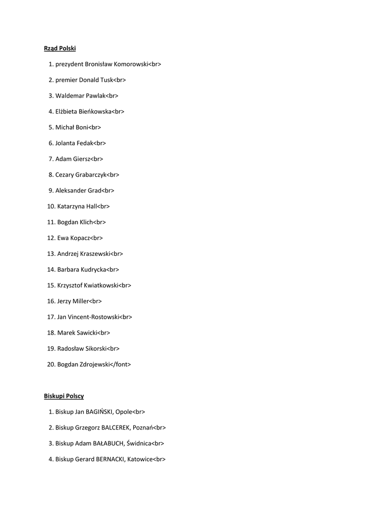 Rząd Polski 1. prezydent Bronisław Komorowski<br> 2. premier Donald Tusk<br> 3. Waldemar Pawlak<br> 4. Elżbieta Bieokowska<br> 5. Michał Boni<br> 6. Jolanta Fedak<br> 7. Adam Giersz<br> 8. Cezary Grabarczyk<br> 9. Aleksander Grad<br> 10. Katarzyna Hall<br> 11. Bogdan Klich<br> 12. Ewa Kopacz<br> 13. Andrzej Kraszewski<br> 14. Barbara Kudrycka<br> 15. Krzysztof Kwiatkowski<br> 16. Jerzy Miller<br> 17. Jan Vincent-Rostowski<br> 18. Marek Sawicki<br> 19. Radosław Sikorski<br> 20. Bogdan Zdrojewski</font> Biskupi Polscy 1. Biskup Jan BAGIOSKI, Opole<br> 2. Biskup Grzegorz BALCEREK, Poznao<br> 3. Biskup Adam BAŁABUCH, Świdnica<br> 4. Biskup Gerard BERNACKI, Katowice<br> 5. Biskup Edward BIAŁOGŁOWSKI, Rzeszów<br> 6. Biskup Władysław BOBOWSKI, Tarnów<br> 7. Biskup Tadeusz BRONAKOWSKI, Łomża<br> 8. Biskup Stanisław BUDZIK, Tarnów<br> 9. Biskup Stefan CICHY, Legnica<br> 10. Biskup Paweł CIEŚLIK, Koszalin - Kołobrzeg<br> 11. Biskup Mieczysław CISŁO, Lublin<br> 12. Biskup Andrzej CZAJA, Opole<br> 13. Biskup Edward DAJCZAK, Koszalin - Kołobrzeg<br> 14. Biskup Ignacy DEC, Świdnica<br> 15. Biskup Bronisław DEMBOWSKI, Włocławek<br> 16. Biskup Wacław DEPO, Zamośd - Lubaczów<br> 17. Biskup Antoni DŁUGOSZ, Częstochowa<br> 18. Biskup Marian DUŚ, Warszawa<br> 19. Biskup Adam DYCZKOWSKI, Zielona Góra - Gorzów<br> 20. Biskup Antoni DYDYCZ, Drohiczyn<br> 21. Arcybiskup Andrzej DZIĘGA, Szczecin - Kamieo<br> 22. Biskup Andrzej DZIUBA, Łowicz<br> 23. Kardynał Stanisław DZIWISZ, Kraków<br> 24. Biskup Marian FLORCZYK, Kielce<br> 25. Biskup Zdzisław FORTUNIAK, Poznao<br> 26. Biskup Edward FRANKOWSKI, Sandomierz<br> 27. Biskup Jan GAŁECKI, Szczecin - Kamieo<br> 28. Arcybiskup Stanisław GĄDECKI, Poznao<br> 29. Biskup Stanisław GĘBICKI, Włocławek<br> 30. Kardynał Józef GLEMP, Warszawa<br> 31. Arcybiskup Sławoj Leszek GŁÓDŹ, Gdaosk<br> 32. Arcybiskup Tadeusz GOCŁOWSKI, Gdaosk<br> 33. Arcybiskup Marian GOŁĘBIEWSKI, Wrocław<br> 34. Biskup Kazimierz GÓRNY, Rzeszów<br> 35. Kardynał Henryk GULBINOWICZ, Wrocław<br> 36. Biskup Kazimierz GURDA, Kielce<br> 37. Biskup Józef GUZDEK, Kraków<br> 38. Arcybiskup Henryk HOSER, Warszawa - Praga<br> 39. Biskup Edward JANIAK, Wrocław<br> 40. Biskup Piotr JARECKI, Warszawa<br> 41. Biskup Jacek JEZIERSKI, Olsztyn<br> 42. Biskup Andrzej JEŻ, Tarnów<br> 43. Biskup Marek JĘDRASZEWSKI, Poznao<br> 44. Biskup Włodzimierz JUSZCZAK, Wrocław - Gdaosk<br> 45. Biskup Romuald KAMIOSKI, Ełk<br> 46. Biskup Ryszard KARPIOSKI, Lublin<br> 47. Biskup Ryszard KASYNA, Gdaosk<br> 48. Biskup Grzegorz KASZAK, Sosnowiec<br> 49. Biskup Stanisław KĘDZIORA, Warszawa - Praga<br> 50. Biskup Zbigniew KIERNIKOWSKI, Siedlce<br> 51. Biskup Jan KOPIEC, Opole<br> 52. Biskup Piotr KRUPA, Pelplin<br> 53. Biskup Marian KRUSZYŁOWICZ, Szczecin - Kamieo<br> 54. Biskup Józef KUPNY, Katowice<br> 55. Biskup Gerard KUSZ, Gliwice<br> 56. Biskup Wiesław LECHOWICZ, Tarnów<br> 57. Biskup Adam LEPA, Łódź<br> 58. Biskup Mariusz LESZCZYOSKI, Zamośd - Lubaczów<br> 59. Biskup Piotr LIBERA, Płock<br> 60. Kardynał Franciszek MACHARSKI, Kraków<br> 61. Biskup Albin MAŁYSIAK, Kraków<br> 62. Biskup Roman MARCINKOWSKI, Płock<br> 63. Arcybiskup Jan MARTYNIAK, Przemyśl - Warszawa<br> 64. Biskup Edward MATERSKI, Radom<br> 65. Biskup Jerzy MAZUR, Ełk<br></font> 66. Biskup Marek MENDYK, Legnica<br> 67. Biskup Wiesław MERING, Włocławek<br> 68. Arcybiskup Józef MICHALIK, Przemyśl<br> 69. Biskup Artur MIZIOSKI, Lublin<br> 70. Arcybiskup Henryk MUSZYOSKI, Gniezno<br> 71. Kardynał Stanisław NAGY, Kraków<br> 72. Biskup Stanisław NAPIERAŁA, Kalisz<br> 73. Biskup Krzysztof NITKIEWICZ, Sandomierz<br> 74. Arcybiskup Alfons NOSSOL, Opole<br> 75. Arcybiskup Stanisław NOWAK, Częstochowa<br> 76. Arcybiskup Kazimierz NYCZ, Warszawa<br> 77. Biskup Adam ODZIMEK, Radom<br> 78. Biskup Alojzy ORSZULIK, Łowicz<br> 79. Arcybiskup Edward OZOROWSKI, Białystok<br> 80. Arcybiskup Juliusz PAETZ, Poznao<br> 81. Biskup Józef PAZDUR, Wrocław<br> 82. Biskup Ireneusz PĘKALSKI, Łódź<br> 83. Biskup Tadeusz PIERONEK, Kraków (KKK)<br> 84. Biskup Tadeusz PIKUS, Warszawa<br> 85. Arcybiskup Edmund PISZCZ, Olsztyn<br> 86. Biskup Wojciech POLAK, Gniezno<br> 87. Arcybiskup Bolesław PYLAK, Lublin<br> 88. Biskup Tadeusz RAKOCZY, Bielsko - Żywiec<br> 89. Biskup Stefan REGMUNT, Zielona Góra - Gorzów<br> 90. Biskup Marian ROJEK, Przemyśl<br> 91. Biskup Kazimierz ROMANIUK, Warszawa - Praga<br> 92. Biskup Tadeusz RYBAK, Legnica<br> 93. Biskup Kazimierz RYCZAN, Kielce<br> 94. Biskup Stefan SICZEK, Radom<br> 95. Biskup Andrzej SIEMIENIEWSKI, Wrocław<br> 96. Biskup Piotr SKUCHA, Sosnowiec<br> 97. Biskup Wiktor SKWORC, Tarnów<br> 98. Biskup Paweł SOCHA, Zielona Góra - Gorzów<br> 99. Biskup Stanisław STEFANEK, Łomża<br> 100. Biskup Paweł STOBRAWA, Opole<br> 101. Biskup Jan STYRNA, Elbląg<br> 102. Biskup Andrzej SUSKI, Toruo<br> 103. Biskup Adam SZAL, Przemyśl<br> 104. Biskup Józef SZAMOCKI, Toruo<br> 105. Biskup Jan SZKODOO, Kraków<br> 106. Biskup Jan SZLAGA, Pelplin<br> 107. Arcybiskup Stanisław SZYMECKI, Białystok<br> 108. Biskup Jan ŚRUTWA, Zamośd - Lubaczów<br> 109. Biskup Wacław ŚWIERZAWSKI, Sandomierz<br> 110. Arcybiskup Ignacy TOKARCZUK, Przemyśl<br> 111. Biskup Henryk TOMASIK, Radom<br> 112. Biskup Jan TYRAWA, Bydgoszcz<br> 113. Biskup Jan WĄTROBA, Częstochowa<br> 114. Biskup Tadeusz WERNO, Koszalin - Kołobrzeg<br> 115. Arcybiskup Szczepan WESOŁY, Gniezno<br> 116. Biskup Jan WIECZOREK, Gliwice<br> 117. Arcybiskup Stanisław WIELGUS, Warszawa<br> 118. Biskup Teofil WILSKI, Kalisz<br> 119. Biskup Julian WOJTKOWSKI, Olsztyn<br> 120. Biskup Bogdan WOJTUŚ, Gniezno<br> 121. Biskup Józef WRÓBEL, Lublin<br> 122. Biskup Józef WYSOCKI, Elbląg<br> 123. Biskup Krzysztof ZADARKO, Koszalin - Kołobrzeg<br> 124. Biskup Jan ZAJĄC, Kraków<br> 125. Biskup Tadeusz ZAWISTOWSKI, Łomża<br> 126. Biskup Józef ZAWITKOWSKI, Łowicz<br> 127. Arcybiskup Wojciech ZIEMBA, Olsztyn<b