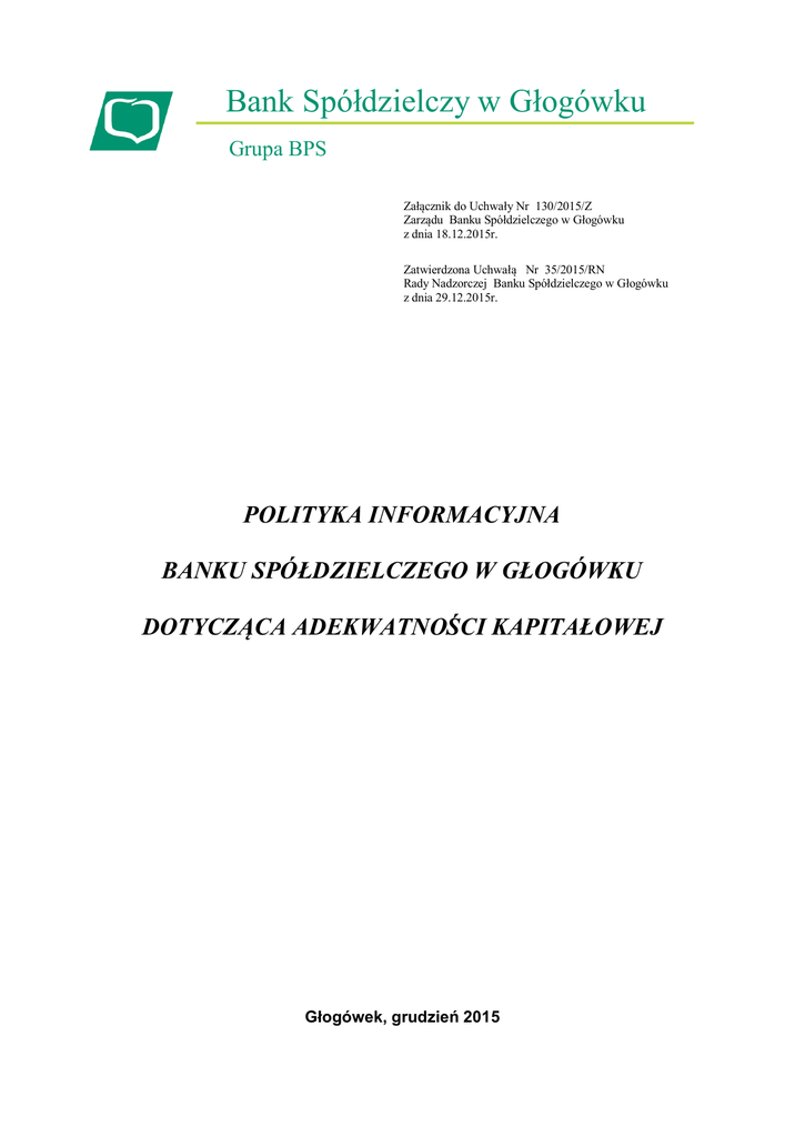 Bank Spółdzielczy w Głogówku Grupa BPS Załącznik do Uchwały Nr 130/2015/Z Zarządu Banku Spółdzielczego w Głogówku z dnia 18.12.2015r. Zatwierdzona Uchwałą Nr 35/2015/RN Rady Nadzorczej Banku Spółdzielczego w Głogówku z dnia 29.12.2015r. POLITYKA INFORMACYJNA BANKU SPÓŁDZIELCZEGO W GŁOGÓWKU DOTYCZĄCA ADEKWATNOŚCI KAPITAŁOWEJ Głogówek, grudzień 2015 „Polityka informacyjna Banku Spółdzielczego w Głogówku dotycząca adekwatności kapitałowej”. 1. Postanowienia ogólne § 1. 1. „Polityka Informacyjna Banku Spółdzielczego w Głogówku dotycząca adekwatności kapitałowej”, zwana dalej „Polityką”, stanowi wykonanie postanowień art. 111a ustawy Prawo bankowe oraz Uchwały Nr 385/2008 Komisji Nadzoru Finansowego z dnia 17 grudnia 2008 roku w sprawie szczegółowych zasad i sposobu ogłaszania przez banki informacji o charakterze jakościowym i ilościowym dotyczących adekwatności kapitałowej oraz zakresu informacji podlegających ogłaszaniu – z późniejszymi zmianami. 2. Polityka wprowadza zestaw wymagań informacyjno-sprawozdawczych, które umożliwią uczestnikom rynku ocenę działalności Banku poprzez ocenę: metod szacowania kapitału, narażenia Banku na ryzyka, technik stosowanych przez Bank w celu identyfikacji, pomiaru, monitorowania i kontroli poszczególnych rodzajów ryzyka, a tym samym ocenę adekwatności kapitałowej Banku. 3. Polityka określa częstotliwość, formę i miejsce ogłaszania informacji o charakterze jakościowym i ilościowym dotyczących adekwatności kapitałowej oraz zasady zatwierdzania i weryfikacji ogłaszanych informacji, a także zakres informacji podlegających ogłaszaniu. 2. Zakres ogłaszanych informacji o charakterze jakościowym i ilościowym § 2. 1. Informacje o charakterze jakościowym podlegające ogłaszaniu obejmują w szczególności: 1) strategie i opis procesów zarządzania poszczególnymi rodzajami ryzyka; 2) przyjęte przez Bank rozwiązania organizacyjne w procesie zarządzania poszczególnymi rodzajami ryzyka; 3) opis systemów raportowania i pomiaru poszczególnych rodzajów ryzyk; 4) zasady polityki stosowania zabezpieczeń i ograniczania ryzyka oraz procesy monitorowania skuteczności zabezpieczeń i metod redukcji ryzyka; 5) stosowane metody wyznaczania wymogów kapitałowych z tytułu poszczególnych rodzajów ryzyka. 6) zasady ustalania wynagrodzeń osób zajmujących stanowiska kierownicze w banku– wyciąg z Regulaminu wynagradzania. 2. Zakres informacji o charakterze jakościowym i ilościowym podlegający ogłaszaniu przez Bank zawarty jest w Załączniku nr 1 do niniejszej Polityki, z zastrzeżeniem ust. 4 i 5. 3. Ujawniane informacje powinny spełniać następujące wymogi: 1) kompleksowość (obszerność), przedstawiająca aktualny obraz ryzyk związanych z działalnością Banku; 2) przydatność i aktualność, pozwalające ocenić bezpieczeństwo i stabilność działań Banku; 3) wiarygodność, odzwierciedlająca ekonomiczną treść zdarzeń i transakcji; 2 „Polityka informacyjna Banku Spółdzielczego w Głogówku dotycząca adekwatności kapitałowej”. 4) porównywalność, umożliwiająca ocenę pozycji finansowej i wyniku finansowego Banku względem innych banków; 5) istotność i przydatność do oceny ryzyka Banku. 4. Zakres ogłaszanych informacji nie obejmuje informacji, których ujawnienie może mieć niekorzystny wpływ na pozycję Banku na rynku w rozumieniu przepisów o ochronie konkurencji i konsumentów, tj. takich informacji, których ujawnienie spowodowałoby spadek wartości dokonanych przez Bank inwestycji, a w konsekwencji osłabiłoby jego pozycję konkurencyjną oraz informacji objętych tajemnicą prawnie chronioną. 5. Bank nie ujawnia informacji nieistotnych w procesie wyznaczania wymogów kapitałowych z tytułu poszczególnych rodzajów ryzyka, tj. takich informacji, których pominięcie nie może zmienić oceny lub decyzji osoby wykorzystującej takie informacje przy podejmowaniu decyzji ekonomicznych, lub wpłynąć na taką ocenę lub decyzję. 3. Częstotliwość ogłaszanych informacji o charakterze jakościowym i ilościowym § 3. 1. Informacje o charakterze jakościowymi ilościowym Bank ogłasza z częstotliwością roczną tj. nie później niż w terminie 30 dni od dnia zatwierdzenia rocznego sprawozdania finansowego Banku przez Zebranie Przedstawicieli. 2. Zasady i terminy sporządzania ogłaszanych informacji regulują przepisy obowiązującej w Banku Instrukcji sporządzania informacji zarządczej. 4. Forma i miejsce ogłaszania informacji § 4. 1. Informacje o charakterze ilościowym i jakościowym dotyczące adekwatności kapitałowej Banku udostępniane są Klientom w formie papierowej w Centrali Banku w Głogówku ul. Rynek 20a w pokoju nr 6 - sekretariat w godzinach od 730 do 1530 , a także w wersji elektronicznej na stronie internetowej Banku. 2. Informacje ogłaszane są w języku polskim. 3. Wszystkie dane ilościowe prezentowane są w tysiącach złotych bez miejsc po przecinku. 5. Zasady zatwierdzania i weryfikacji ogłaszanych informacji § 5. 1. Ogłaszane informacje podlegają zatwierdzeniu przez Zarząd Banku. 2. Informacje, które nie są objęte badaniem sprawozdania finansowego przez biegłego rewidenta podlegają weryfikacji zgodnie z systemem kontroli wewnętrznej obowiązującym w Banku. 3 „Polityka informacyjna Banku Spółdzielczego w Głogówku dotycząca adekwatności kapitałowej”. 6. Zasady weryfikacji Polityki informacyjnej § 6. 1. Polityka informacyjna Banku podlega rocznej weryfikacji w terminie do dnia 31 grudnia każdego roku. 2. Weryfikacji podlega w szczególności częstotliwość publikowania informacji, miejsce ich ogłaszania oraz zakres informacji podlegających ujawnieniom. 3. Zakres ujawnianych informacji może ulec zmianie w przypadku: 1) zmiany strategii Banku; 2) zmiany profilu ryzyka; 3) zmiany metod wyliczania wymogów kapitałowych; 4) zmiany Uchwały Nr 385/2008 Kom