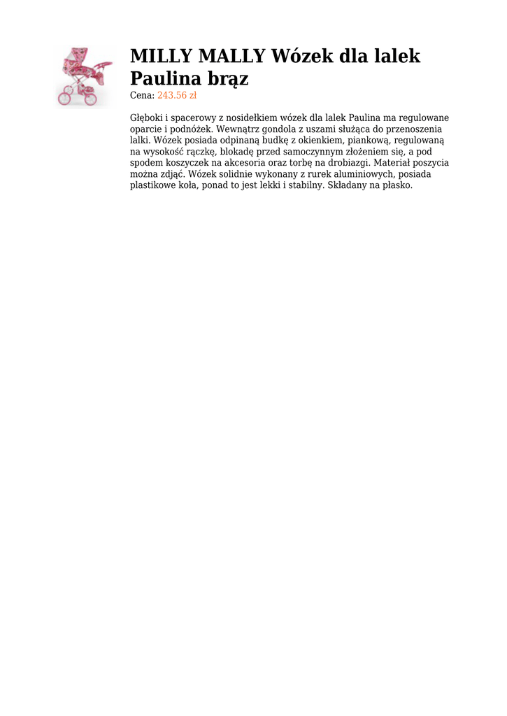 MILLY MALLY Wózek dla lalek Paulina brąz Cena: 243.56 zł Głęboki i spacerowy z nosidełkiem wózek dla lalek Paulina ma regulowane oparcie i podnóżek. Wewnątrz gondola z uszami służąca do przenoszenia lalki. Wózek posiada odpinaną budkę z okienkiem, piankową, regulowaną na wysokość rączkę, blokadę przed samoczynnym złożeniem się, a pod spodem koszyczek na akcesoria oraz torbę na drobiazgi. Materiał poszycia można zdjąć. Wózek solidnie wykonany z rurek aluminiowych, posiada plastikowe koła, ponad to jest lekki i stabilny. Składany na płasko.