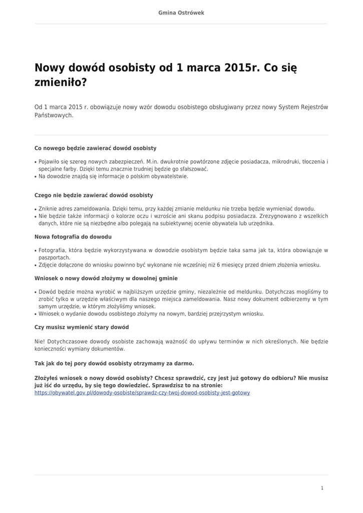 Gmina Ostrówek Nowy dowód osobisty od 1 marca 2015r. Co się zmieniło? Od 1 marca 2015 r. obowiązuje nowy wzór dowodu osobistego obsługiwany przez nowy System Rejestrów Państwowych. Co nowego będzie zawierać dowód osobisty ● ● Pojawiło się szereg nowych zabezpieczeń. M.in. dwukrotnie powtórzone zdjęcie posiadacza, mikrodruki, tłoczenia i specjalne farby. Dzięki temu znacznie trudniej będzie go sfałszować. Na dowodzie znajdą się informacje o polskim obywatelstwie. Czego nie będzie zawierać dowód osobisty ● ● Zniknie adres zameldowania. Dzięki temu, przy każdej zmianie meldunku nie trzeba będzie wymieniać dowodu. Nie będzie także informacji o kolorze oczu i wzroście ani skanu podpisu posiadacza. Zrezygnowano z wszelkich danych, które nie są niezbędne albo polegają na subiektywnej ocenie obywatela lub urzędnika. Nowa fotografia do dowodu ● ● Fotografia, która będzie wykorzystywana w dowodzie osobistym będzie taka sama jak ta, która obowiązuje w paszportach. Zdjęcie dołączone do wniosku powinno być wykonane nie wcześniej niż 6 miesięcy przed dniem złożenia wniosku. Wniosek o nowy dowód złożymy w dowolnej gminie ● ● Dowód będzie można wyrobić w najbliższym urzędzie gminy, niezależnie od meldunku. Dotychczas mogliśmy to zrobić tylko w urzędzie właściwym dla naszego miejsca zameldowania. Nasz nowy dokument odbierzemy w tym samym urzędzie, w którym złożyliśmy wniosek. Wniosek o wydanie dowodu osobistego złożymy na nowym, bardziej przejrzystym wniosku. Czy musisz wymienić stary dowód Nie! Dotychczasowe dowody osobiste zachowają ważność do upływu terminów w nich określonych. Nie będzie konieczności wymiany dokumentów. Tak jak do tej pory dowód osobisty otrzymamy za darmo. Złożyłeś wniosek o nowy dowód osobisty? Chcesz sprawdzić, czy jest już gotowy do odbioru? Nie musisz już iść do urzędu, by się tego dowiedzieć. Sprawdzisz to na stronie: https://obywatel.gov.pl/dowody-osobiste/sprawdz-czy-twoj-dowod-osobisty-jest-gotowy 1