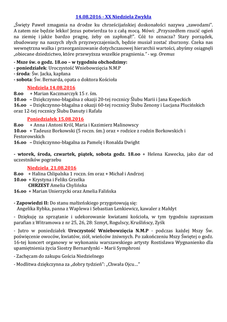 14.08.2016 - XX Niedziela Zwykła „Święty Paweł zmagania na drodze ku chrześcijańskiej doskonałości nazywa „zawodami”. A zatem nie będzie lekko! Jezus potwierdza to z całą mocą. Mówi: „Przyszedłem rzucić ogień na ziemię i jakże bardzo pragnę, żeby on zapłonął!”. Cóż to oznacza? Stary porządek, zbudowany na naszych złych przyzwyczajeniach, będzie musiał zostać zburzony. Czeka nas wewnętrzna walka i przeorganizowanie dotychczasowej hierarchii wartości, abyśmy osiągnęli „obiecane dziedzictwo, które przewyższa wszelkie pragnienia.” - wg. Oremus - Msze św. o godz. 18.oo – w tygodniu obchodzimy: - poniedziałek: Uroczystość Wniebowzięcia N.M.P - środa: Św. Jacka, kapłana - sobota: Św. Bernarda, opata o doktora Kościoła Niedziela 14.08.2016 8.oo + Marian Kaczmarczyk 15 r. śm. 10.oo – Dziękczynno-błagalna z okazji 20-tej rocznicy Ślubu Marii i Jana Kopeckich 16.oo – Dziękczynno-błagalna z okazji 60-tej rocznicy Ślubu Zenony i Lucjana Plucińskich oraz 12-tej rocznicy Ślubu Danuty i Rafała Poniedziałek 15.08.2016 8.oo + Anna i Antoni Król, Maria i Kazimierz Malinowscy 10.oo + Tadeusz Borkowski (5 roczn. śm.) oraz + rodzice z rodzin Borkowskich i Festorowskich 16.oo – Dziękczynno-błagalna za Pamelę i Ronalda Dwight - wtorek, środa, czwartek, piątek, sobota godz. 18.oo + Helena Kawecka, jako dar od uczestników pogrzebu Niedziela 21.08.2016 8.oo + Halina Chlipalska 1 roczn. śm oraz + Michał i Andrzej 10.oo + Krystyna i Feliks Grzelka CHRZEST Amelia Chylińska 16.oo + Marian Unierzycki oraz Amelia Falińska - Zapowiedzi II: Do stanu małżeńskiego przygotowują się: Angelika Rybka, panna z Waplewa i Sebastian Lenkiewicz, kawaler z Małdyt - Dziękuję za sprzątanie i udekorowanie kwiatami kościoła, w tym tygodniu zapraszam parafian z Witramowa z nr 25, 26, 28: Szmyt, Rogulscy, Kruślińscy, Zyśk - Jutro w poniedziałek Uroczystość Wniebowzięcia N.M.P - podczas każdej Mszy Św. poświęcenie owoców, kwiatów, ziół, wieńców żniwnych. Po zakończeniu Mszy Świętej o godz. 16-tej koncert organowy w wykonaniu warszawskiego artysty Rostislawa Wygnanienko dla upamiętnienia życia Siostry Bernardynki – Marii Symphroni - Zachęcam do zakupu Gościa Niedzielnego - Modlitwa dziękczynna za „dobry tydzień”: „Chwała Ojcu…”