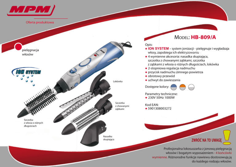Oferta produktowa MODEL: HB-809/A pielęgnacja włosów Lokówka Opis: ● ION SYSTEM - system jonizacji - pielęgnuje i wygładzaja włosy, zapobiega ich elektryzowaniu ● 4 wymienne akcesoria: nasadka skupiająca, szczotka z chowanymi ząbkami, szczotka z ząbkami z włosia o różnych długościach, lokówka ● 2-stopniowa regulacja nadmuchu ● przycisk nadmuchu zimnego powietrza ● obrotowy przewód ● uchwyt do zawieszania Dostępne kolory: Parametry techniczne: ● 230V 50Hz 1000W Szczotka z chowanymi ząbkami Kod EAN: ● 5901308003272 Szczotka z włosia o różnych długościach Nasadka skupiająca Profesjonalna lokosuszarka z jonową pielęgnacją włosów i bogatym wyposażeniem - 4 końcówki wymienne. Różnorodne funkcje nawiewu dostosowują ją do każdego rodzaju włosów.