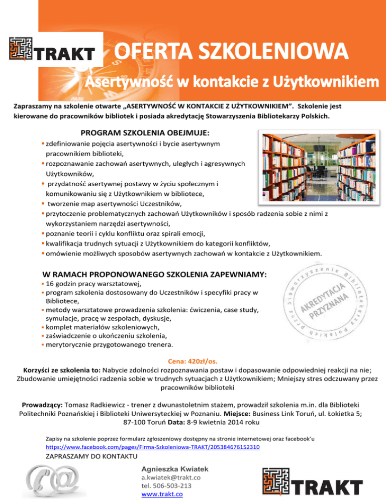 Zapraszamy na szkolenie otwarte „ASERTYWNOŚD W KONTAKCIE Z UŻYTKOWNIKIEM”. Szkolenie jest kierowane do pracowników bibliotek i posiada akredytację Stowarzyszenia Bibliotekarzy Polskich. PROGRAM SZKOLENIA OBEJMUJE: zdefiniowanie pojęcia asertywności i bycie asertywnym pracownikiem biblioteki, rozpoznawanie zachowao asertywnych, uległych i agresywnych Użytkowników, przydatnośd asertywnej postawy w życiu społecznym i komunikowaniu się z Użytkownikiem w bibliotece, tworzenie map asertywności Uczestników, przytoczenie problematycznych zachowao Użytkowników i sposób radzenia sobie z nimi z wykorzystaniem narzędzi asertywności, poznanie teorii i cyklu konfliktu oraz spirali emocji, kwalifikacja trudnych sytuacji z Użytkownikiem do kategorii konfliktów, omówienie możliwych sposobów asertywnych zachowao w kontakcie z Użytkownikiem. W RAMACH PROPONOWANEGO SZKOLENIA ZAPEWNIAMY: 16 godzin pracy warsztatowej, program szkolenia dostosowany do Uczestników i specyfiki pracy w Bibliotece, metody warsztatowe prowadzenia szkolenia: dwiczenia, case study, symulacje, pracę w zespołach, dyskusje, komplet materiałów szkoleniowych, zaświadczenie o ukooczeniu szkolenia, merytorycznie przygotowanego trenera. Cena: 420zł/os. Korzyści ze szkolenia to: Nabycie zdolności rozpoznawania postaw i dopasowanie odpowiedniej reakcji na nie; Zbudowanie umiejętności radzenia sobie w trudnych sytuacjach z Użytkownikiem; Mniejszy stres odczuwany przez pracowników biblioteki Prowadzący: Tomasz Radkiewicz - trener z dwunastoletnim stażem, prowadził szkolenia m.in. dla Biblioteki Politechniki Poznaoskiej i Biblioteki Uniwersyteckiej w Poznaniu. Miejsce: Business Link Toruo, ul. Łokietka 5; 87-100 Toruo Data: 8-9 kwietnia 2014 roku Zapisy na szkolenie poprzez formularz zgłoszeniowy dostępny na stronie internetowej oraz facebook’u https://www.facebook.com/pages/Firma-Szkoleniowa-TRAKT/205384676152310 ZAPRASZAMY DO KONTAKTU Agnieszka Kwiatek [email protected] tel. 506-503-213 www.trakt.co