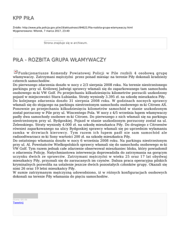 KPP PIŁA Źródło: http://www.pila.policja.gov.pl/w19/aktualnosci/94622,Pila-rozbita-grupa-wlamywaczy.html Wygenerowano: Wtorek, 7 marca 2017, 23:40 Strona znajduje się w archiwum. PIŁA - ROZBITA GRUPA WŁAMYWACZY Funkcjonariusze Komendy Powiatowej Policji w Pile rozbili 4 osobową grupę włamywaczy. Zatrzymani mężczyźni przez ponad miesiąc na terenie Piły dokonali kradzieży czterech samochodów. Do pierwszego zdarzenia doszło w nocy z 2/3 sierpnia 2008 roku. Na terenie niestrzeżonego parkingu przy ul. Królowej Jadwigi sprawcy włamali się do zaparkowanego tam samochodu osobowego m-ki VW Golf. Po przejechaniu kilkudziesięciu kilometrów porzucili uszkodzony pojazd w miejscowości Stara Łubianka. Straty wyniosły 3.395 zł. na szkodę mieszkańca Piły. Do kolejnego zdarzenia doszło 31 sierpnia 2008 roku. W godzinach nocnych sprawcy włamali się do stojącego na parkingu niestrzeżonym samochodu osobowego m-ki Citroen AX. Ponownie po przejechaniu kilkudziesięciu kilometrów samochód w stanie uszkodzonym został porzucony w Pile przy ul. Wincentego Pola. W nocy z 4/5 września łupem włamywaczy padły dwa samochody osobowe m-ki Citroen. Do pierwszego z nich włamali się na parkingu niestrzeżonym przy ul. Bydgoskiej. Pojazd w stanie uszkodzonym porzucony został na ul. Żelenskiego. Straty wyniosły 4.000 zł. na szkodę mieszkańca Piły. Do drugiego z Citroenów również zaparkowanego na ulicy Bydgoskiej sprawcy włamali się po uprzednim wyłamaniu zamka w drzwiach kierowcy. Tym razem ich łupem padł nie sam samochód ale radioodtwarzacz m-ki Sony wartości 200 zł. na szkodę mieszkańca Piły. Do ostatniego włamania doszło w nocy 6 września 2008 roku. Na parkingu niestrzeżonym przy ul. Al. Powstańców Wielkopolskich sprawcy włamali się do samochodu osobowego m-ki VW Golf. Tym razem jednak całe zdarzenie obserwował mieszkaniec bloku, który powiadomił o zdarzeniu Policję. Natychmiastowa interwencja doprowadziła do zatrzymania na gorącym uczynku dwóch ze sprawców. Zatrzymani mężczyźni w wieku 25 oraz 17 lat obydwaj mieszkańcy Piły, przyznali się do zarzucanych im czynów. Dalsza praca operacyjna pilskich kryminalnych pozwoliła na ustalenie jeszcze dwóch pozostałych członków grupy. Okazali się nimi 26 oraz 19 letni mieszkańcy Piły. W sumie zatrzymanym mężczyzną udowodniono, iż w różnych konfiguracjach osobowych dokonali na terenie Piły włamania do pięciu samochodów. Ocena: 0/5 (0) Tweetnij