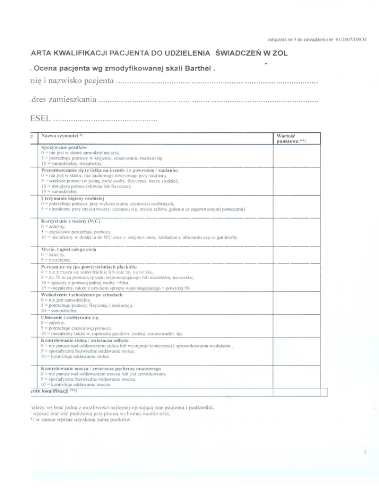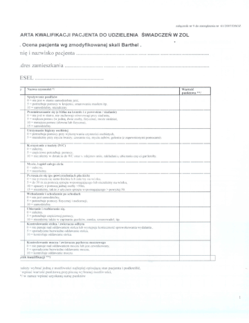 załącznik nr 9 do zarządzenia nr 61/2007IDSOZ ARTA KWALIFIKACJI PACJENTA DO UDZIELENIA ŚWIADCZEŃ W ZOL . Ocena pacjenta wg zmodyfikowanej skali Barthel . .. .k . t TIlę 1naZWlS o pacJen a . .dres zarnieszkani a . E SEL p . ;\azwa czynności °l Wartość punktowa SpożYW'lnie posiłków O = nie jest w stanie samodzielnie jeść. 5 = potrzebuje pomocy w krojeniu. smarowaniu 10 = samodzielny. niezależny. **/ maslem itp. PI'zemieszczanie się (z lóżka na krzesło i z powrotem I siadanie) O .= nie j,:st w stan'e. nie zacho\\ uj,: rówrowagi pr1Y siad miu, 5 = większa pomoc (w jedną, dwie osob). lizyczna). może siedzieć. 10 = mniejsza pomoc (słowna lub fizvczna), 15 = samodzielny. litrzymanie higieny osobistej O = potrzebuje pomocy przy wykon)\\ aniu czynności osobistych. 5 = niezależny przy myciu twarzy. czesaniu się. myciu zębów. goleniu (z zapewnionymi pomocami). --_.- - f--------------------------------------Kllrzyst.lI1ie z toalety (WC) O = zależny. 5 ,= częściowo potrzebuj, pomocy. 10 = nie;:ależny w dotarciu do WC oraz l, zdejmOlaniu. zakładani J, ubić raniu czę; ci gar Jeroby. - f------------------------------:\, vcie. t ąpiel calt go ciała O ., zalej n). 5 = niezl'JeŻl1). - f-------------------------------------P<.rusza_lie się (pu powierzchniaLh pła~kich) O ~ nie p Jrusza się samo,lzielnie IŁb zale 'n\ na \\ć zku. 5 = do 50 m za pomocą sprzętu wspomagającego lub niezależny na wózku, 10 = spacery z pomocąjednej osoby >50m. 15 = niezależny, także z użyciem sprzętu wspomagającego> powyżej 50. ----- --_.--_.- Wchodzenie i schodzenie po schodach O = nie jest samodzielny. 5 = potrzebuje pomocy fizycznej i asekuracji. 10 = samodziel n)'. lIbieranie i rozbieranie się. O = zależny. 5 = potrzebuje częściowej pomoc). 10 = niezależny także w zapinaniu guzików. zamka. sznurowadeł. itp. Kontrolowanie stolca I zwieracza odbytu O = nie panuje nad oddawaniem stolca lub IIystępuje koniecznośĆ sprowokowania 5 = sporadycme bezwiedne oddawanie stolca. 10= kontroluje oddawanie stolca. Kontrolowanie moczu I zwieracza pęcherza wydalania. moczowego O = nie panuje nad oddawaniem moczu lub jest cewnikowany. 5 = sporadyczne bezwiedne oddawanie moczu. 10 = kontroluje oddawanie moczu. ,nik kwalifikacji .**/ 1ależy wybrać jedną z możliwości nąjlepiej opisującą stan pacjenta 'wpisać wartość punl;tową przy pis~ną w;'branej l1lożliv'ości, ~/ w ramce wpisać uzyskaną sumę punktów I i podkreślić. załącznik nr 9 do zarządzenia nr 61/2007/DSOZ Informacje dodatkowe dla L.p. ZOUZPO Nazwa leku przyjmowanego przez pacjenta w schorzeniach przewlekłych Postać leku Dawkowanie 1 2 3 Informacje dodatkowe dla L.p. ZOLlZPO Nazwa świadczeniodawcy udzielającego pacjentowi ambulatoryjnych świadczeń specjalistycznych Nr telefonu świadczeniodawcy 1 2 3 .00 .. oo... oo... ooooooD~i~,o o~~d~i~ Oj o~i~;;~tk~ '~i~i~~o~i;;ki o.o.. o.o.o.o.. o.. oooo 2