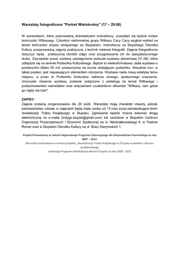 Warsztaty fotograficzne "Portret Wielokrotny" (17 – 29.08) W warsztatach, które poprowadzą doświadczeni instruktorzy, przewijać się będzie motyw twórczości Witkacego. Członkini nieformalnej grupy Witkacy Cacy Cacy wygłosi wykład na temat twórczości artysty związanego ze Słupskiem. Instruktorzy ze Słupskiego Ośrodka Kultury przeprowadzą zajęcia praktyczne z technik robienia fotografii. Zajęcia fotograficzne dotyczyć będą praktycznej obróbki zdjęć oraz przygotowania ich do specjalistycznego druku. Zwycięskie prace zostaną udostępnione podczas wystawy plenerowej (31.08), która odbędzie się na terenie Podwórka Kulturalnego. Będzie to wielkoformatowa, stała wystawa o powierzchni blisko 50 m2 umieszczona na murze okalającym podwórko. Aktualnie mur, w takiej postaci, jest niepasującym elementem otoczenia. Wystawa nada nową estetykę temu miejscu, a przez to Podwórko Kulturalne nabierze nowego, społecznego znaczenia. Uroczyste otwarcie wystawy zostanie połączone z prelekcją na temat Witkacego i podsumowaniem warsztatów oraz wręczeniem uczestnikom albumów "Witkacy...tam gdzie go nigdy nie było". ZAPISY: Zajęcia zostaną zorganizowane dla 20 osób. Warsztaty mają charakter otwarty, jednak pierwszeństwo udziału w zajęciach będą miały osoby od 13 roku życia zamieszkujące teren rewitalizacji Traktu Książęcego w Słupsku. Zgłoszenia będzie można dokonać drogą elektroniczną na emaila ([email protected]) lub osobiście w Słupskim Centrum Organizacji Pozarządowych i Ekonomii Społecznej na ul. Niedziałkowskiego 6, w Teatrze Rondo oraz w Słupskim Ośrodku Kultury na ul. Braci Gierymskich 1. Projekt finansowany w ramach Regionalnego Programu Operacyjnego dla Województwa Pomorskiego na lata 2007 – 2013. Warsztaty realizowane w ramach projektu „Rewitalizacja Traktu Ksią ż ę cego w Sł upsku w obrę bie I obszaru problemowego Lokalnego Programu Rewitalizacji Miasta Sł upska na lata 2009 - 2015