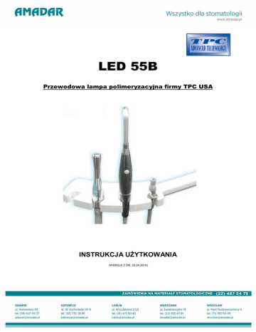 LED 55B Przewodowa lampa polimeryzacyjna firmy TPC USA INSTRUKCJA UŻYTKOWANIA (WERSJA Z DN. 25.04.2016) Witamy! Serdecznie gratulujemy zakupu urządzeń firmy TPC Advanced Technology. Jesteśmy bardzo dumni, że wybrali Państwo nasz produkt. Zalecamy dokładne przeczytanie niniejszej instrukcji. Dobra znajomość charakterystyki technicznej i dostępnych możliwości pracy tego sprzętu zapewni lepszą pracę produktów firmy TPC Advanced Technology, które Państwo właśnie otrzymaliście. W przypadku, gdy uważacie Państwo, że potrzebne są jakiekolwiek dodatkowe informacje, prosimy o bezpośredni kontakt zgodnie z podanymi poniżej danymi: TPC Advanced Technology, INC. Autoryzowany przedstawiciel: 17588 E. ROWLAND ST. CITY OF INDUSTRY, CA 91748 USA Tel.: 001/800/560-8222 Fax.: 001/626/810-4245 e-mail: [email protected] www.tpcadvancedtechnology.com AMADAR Sp. z o.o. ul. Świętokrzyska 14, 00-050 Warszawa Tel. (22) 826-43-81; Fax: 826-91-52 e-mail: [email protected] www.amadar.pl Uwaga: Wszystkie informacje, ilustracje i specyfikacje zwarte w niniejszej instrukcji są oparte na danych aktualnych w czasie jej opublikowania. Firmy TPC Advanced Technology INC. oraz AMADAR Sp. z o.o. rezerwują sobie prawo do wprowadzania zmian w dowolnym czasie bez wcześniejszego uprzedzenia. Warunki gwarancji podane są szczegółowo w karcie gwarancyjnej urządzenia. FUNKCJE Wysokie natężenie światła: dzięki zastosowaniu wysokiego prądu diody LED Czyste niebieskie światło: Pozwala na uniknięcie cieplnych efektów ubocznych promieniowania podczerwonego. Długa żywotność Ten typ urządzeń LED może być użytkowany przez wiele lat. Bezgłośność: W urządzeniu nie zastosowano wentylatora, więc pracuje ono bezgłośnie. Oszczędność energii Urządzenie ma moc mniejszą niż 20W, więc zużywa około jednej piątej energii zużywanej przez tradycyjną lampę halogenową. Ocena siły światła Do pomiaru natężenia światła lampy niezbędny jest odpowiedni miernik radiometryczny (np. używany przez profesjonalnych serwisantów). ZASTOSOWANIE: Urządzenie to służy do utwardzania kompozytów utwardzalnych światłem widzialnym, w zastosowaniu do wypełnień stomatologicznych. SPECYFIKACJA TECHNICZNA Klasa bezpieczeństwa II, typ części aplikacyjnej B 1. 2. 3. 4. 5. 6. 7. Moc wejściowa AC 95~245V lub AC 24V, 50~60 Hz Moc wyjściowa DC 4V Zużycie energii 20W Długość fali 430-490nm Ustawienie czasu pracy – 20 sekund (sygnał dźwiękowy co 10 sekund) Głębokość utwardzania – więcej niż 2mm po 20 sekundach utwardzania. Warunki pracy: a. Temperatura: 5 – 40C b. wilgotność względna 80% 8. Warunki składowania: a. Temperatura: -40 – +55C b. wilgotność względna 80% INSTRUKCJA INSTALACJI Instalację urządzenia w unicie stomatologicznym winien wykonać wyspecjalizowany serwis. Światłowód Schemat lampy Osłonka Włącznik / Wyłącznik Wybór trybu pracy Tryb szybki Tryb pulsacyjny Zasilacz Tryb narastający Przewód Osłona tylna Krążek zabezpieczający Przewód (brązowy) Przewód (żółty) Przewód (niebieski) UŻYTKOWANIE Na rękojeści lampy polimeryzacyjnej znajduje się tylko jeden przycisk. Posiada on jeden dwukolorowy wskaźnik LED w górnej pozycji oraz trzy różnokolorowe wskaźniki LED w dolnej pozycji. Wybór trybu: naciśnij i przytrzymaj przycisk przez co najmniej 2 sekundy aby zmienić tryb pracy, wg. poniższego cyklu Tryb szybki > Tryb impulsowy > Tryb narastający > Tryb szybki 3 kolory diody LED na rękojeści wskazują tryb pracy lampy Kolor wskaźnika zielony niebieski pomarańczowy stan Szybkie utwardzanie: 20 sekund naświetlania, dźwięk co 10 s. Utwardzanie impulsowe: naświetlanie przerywane, dźwięk co 10s. Utwardzanie krokowe: miękki start przez 10 sekund, z mocą narastającą od zera do maksimum, następnie pełna moc przez 10s. 1. Ustawić przycisk wyboru trybu na potrzebny tryb pracy 2. Krótko naciskać przycisk do momentu pojawienia się światła w światłowodzie. Ukierunkować światło na utwardzany materiał. W przypadku ustawienia czasu utwardzania do 20 sekund, po 20 sekundach światło LED wyłączy się automatycznie. Można też nacisnąć przycisk w celu natychmiastowego wyłączenia światła. WAŻNE: 1. W przypadku nie użytkowania lampy przez dłuższy czas proszę odłączyć rękojeść lampy od rękawa unitu. 2. Lampa nie może być eksploatowana w sposób ciągły bez żadnej przerwy. Ograniczać pracę lampy do 10 cykli pod rząd. Prosimy użytkować urządzenie z rozwagą. Kolory diody LED wskazują też status polimeryzacji Kolor wskaźnika zielony żółty żółty migający Stan sygnalizowany Normalny Niskie napięcie końcówki Światło LED zbyt wysokie, lampa znajduje się w stanie ochronnym KONSERWACJA 1. Jeśli światłowód jest pęknięty, może to zmniejszyć skuteczność utwardzania. Należy taki światłowód wymienić. 2. Światłowód może być dezynfekowany w 75% alkoholu lub wysterylizowany w temperaturze maksimum 134°C przez 4 minuty. 3. Powierzchnie obu końców światłowodu muszą być czyste, aby zapewnić właściwą ilość światła. TABELA USTEREK Usterka Światło LED nie jest jasne Światło LED jest niedostateczne Przyczyna i metoda usunięcia usterki A. Uszkodzony główny zasilacz A. Wyczyścić światłowód po obu jego końcach B. Uszkodzony światłowód, wymienić na nowy W przypadku braku możliwości przeprowadzenia samodzielnego usunięcia usterki należy postąpić zgodnie z procedurą przewidzianą w karcie gwarancyjnej urządzenia lub skontaktować się z autoryzowanym serwisem producenta/importera. ZAWARTOŚĆ OPAKOWANIA: 1. Rękojeść lampy polimeryzacyjnej wraz z rękawem - 1 szt. 2. Światłowód z adapterem przyłączeniowym - 1 szt. 3. Główny zasilacz - 1 szt. 4. Osłonka ochronna przed światłem - 1 szt. 5. Instrukcja obsługi w języku polskim - 1 szt. 6. Karta gwarancyjna AMADAR - 1 szt. Autoryzowany przedstawiciel: AMADAR Sp. z o.o. 00-050 Warsz