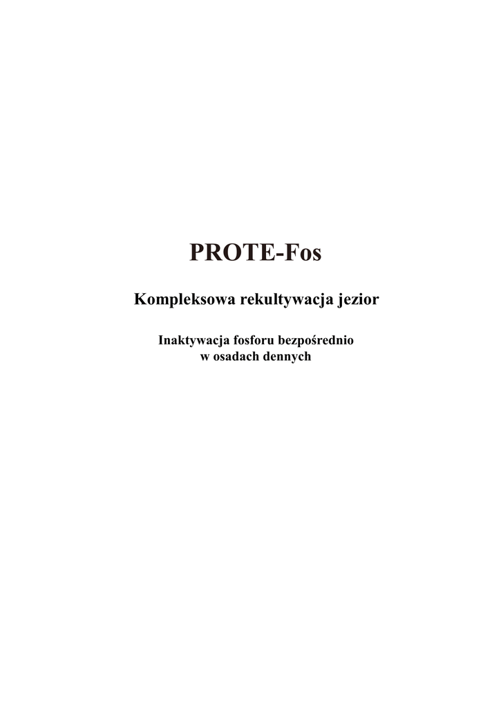 PROTE-Fos Kompleksowa rekultywacja jezior Inaktywacja fosforu bezpośrednio w osadach dennych Spis treści 1. O firmie.................................................................................................................................. 4 2. Wstęp...................................................................................................................................... 5 3. Zjawisko eutrofizacji ............................................................................................................6 4. Schemat kompleksowej rekultywacji...................................................................................7 5. Rozpoznanie...........................................................................................................................7 5.1. Zlewnia..............................................................................................................................7 5.2. Badanie wody i osadów dennych......................................................................................7 6. Projekt prac rekultywacyjnych .......................................................................................... 8 6.1. Wybór metod rekultywacji . .............................................................................................8 6.1.1. Dozowanie substancji chemicznych..........................................................................9 6.1.1.1. PROTE-Fos – innowacyjna metoda inaktywacji fosforu bezpośrednio w osadach dennych ...............................9 6.1.1.2. Dozowanie substacji z powierzchni . ....................................................... 10 6.1.2. Bagrowanie ............................................................................................................. 11 6.1.3. Pozostałe metody uzupełniające ............................................................................. 11 6.2. Dobór dawki oraz substancji chemicznych blokujących fosfor ....................................12 6.3. Uzyskanie niezbędnych decyzji . ...................................................................................13 7. Prace rekultywacyjne .........................................................................................................13 7.1. PROTEUS – Innowacyjna, dwu- modułowa jednostka pływająca do realizacji metody PROTE-Fos ..................................................................................13 7.2. PROTE-Fos – inaktywacji fosforu bezpośrednio w osadach dennych ..........................15 7.3. Inne metody wspomagające ...........................................................................................16 8. Monitoring efektów ............................................................................................................17 9. Osiagane efekty metodą PROTE-Fos ...............................................................................17 10. Podsumowanie .................................................................................................................. 18 Ankieta..................................................................................................................................... 19 1. O firmie PROTE Technologie dla Środowiska Sp. z o.o. jest firmą działającą na rzecz poprawy jakości wody i ochrony środowiska naturalnego w Polsce od 1995 r. Spółka świadczy usługi na najwyższym poziomie realizując projekty związane z ochroną środowiska gruntowego oraz wodnego. Pełne zadowolenie Klientów jest nadrzędnym motywem na drodze budowania marki PROTE, jako sprawdzonego i rzetelnego partnera handlowego oraz oferującego pełen zakres usług danego produktu. Spółka posiada wdrożony Zintegrowany Systemy Zarządzania zgodny z normami: ISO 9001:2008 rozszerzoną o wymagania AQAP 2110, ISO 14001:2004 oraz OHSAS 18001:2007. Naszą działalność rozpoczęliśmy od kompleksowej realizacji projektów likwidacji skażeń środowiska gruntowo-wodnego, wykorzystując m.in. Technologię Intensywnej Bioremediacji (TIB). Posiadamy wykonanych ponad 300 projektów w zakresie badań i likwidacji skażeń, od dużych katastrof po rekultywacje terenów stacji benzynowych. Za rekultywację środowiska gruntowo - wodnego przy wykorzystaniu technologii TIB otrzymaliśmy m.in. w 2001 r. Złoty Medal MTP POLEKO, w 2007 r. nagrodę „TERAZ POLSKA” w kategorii najlepsza usługa oraz wyróżnienie „Lider Polskiej Ekologii” w 2009 r. Dostrzegając pogarszający się stan polskich jezior oraz pojawiający się w wielu zbiornikach problemem związany z powstawaniem zakwitów sinicowych, opracowaliśmy oraz wdrożyliśmy jako jedyni w Polsce efektywną metodę rekultywacji zbiorników wodnych – PROTE-Fos, którą szerzej opisaliśmy w niniejszym opracowaniu. Metoda PROTE-fos otrzymała Złoty Medal na targach POLEKO 2010, wyróżnienie TIWS 2011 oraz jest laureatem Polskiego Godła Promocyjnego TERAZ POLSKA w kategorii najlepsza usługa w 2011 r. W celu utrzymania odpowiedniej jakości wody w sieci, na drodze między stacją uzdatniania, a odbiorcą, wdrożyliśmy usługę przeciwdziałania wtórnemu zanieczyszczaniu oraz kompleksowego nieuciążliwego oczyszczania i utrzymania sieci wodociągowej w należytym stanie sanitarnym. W tym zakresie współpracujemy z kilkudziesięcioma wodociągami w Polsce, osiągając efekt likwidacji wtórnego zanieczyszczenia wody w sieci oraz poprawy jej parametrów organoleptycznych, przy jednoczesnym wydłużeniu okresu eksploatacji sieci wodociągowej. W 2009 r. otrzymaliśmy wyróżnienie w Konkursie „TERAZ POLSKA” w kategorii najlepsza usługa – kompleksowe oczyszczanie sieci wodociągowej a w 2013 r. zostaliśmy jego laureatem. W zakresie poprawy bezpieczeństwa ujęcia wody oferujemy System Biomonitoringu SYMBIO – układ wczesnego ostrzegania przed nagłym zanieczyszczeniem ujęcia wody pitnej. Oparty na rodzimym gatunku małży słodkowodnych system ten jako jedyny na rynku informu