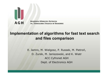 Implementation of algorithms for fast text search and files comparison E. Jamro, M. Wielgosz, P. Russek, M. Pietroń, D. Żurek, M. Janiszewski, and K. Wiatr ACC Cyfronet AGH Dept. of Electronics AGH Agenda About project Synat Hardware acceleration of big data processing Data compression in FPGA Ad hoc text search in FPGA Finding text similarities www.synat.pl ICM Uniwersytet Warszawski/ Politechnika Wrocławska ACK CYFRONET, Akademia Górniczo – Hutnicza Uniwersytet Kardynała Stefana Wyszyńskiego/ Instytut Łączności, Państwowy Instytut Badawczy/ Politechnika Gdańska Polsko Japońska Wyższa Szkoła Technik Komputerowych/ Instytut Podstaw Informatyki, Polska Akademia Nauk PCSS IChB PAN/ Politechnika Warszawska Biblioteka Narodowa Uniwersytet Jagielloński Uczelnia Łazarskiego Naukowa i Akademicka Sieć Komputerowa Wydział Matematyki, Informatyki i Mechaniki, Uniwersytet Warszawski Wydział Cybernetyki, Wojskowa Akademia Techniczna synat.cyfronet.pl Deflate Text compression in FPGA Standard employed in .zip / .gz Combination of two methods: • LZ77 / LZSS dictionary ABCDABCE Î ABCD(length=3, distance=4)E ABABABABA Î AB(length=7, distance=2) - RLE • Huffman Coding (entropy based coding) Huffman coding propability codeword 1 A 1/2 1 0 1 B 1/4 1/2 C D 1/8 10 0 1 1/8 0 1/4 100 0 110 Huffman decoding 16 din conf 9+5= 14 Shift Register 3×16=48 bits 48 shifter 5 15 + address width reduction 4 11 Address Look-Up Table 5 14 Code length 9 FIFO dout 16 Data in Rejestr przesuwny Big data ad hoc search haszowanie B Dane Bloom Filter Throughput: 1.6GB/s – limited by the NUMAlink Strongly Parallel 100 000 patterns simultanously Rejestr przesuwny B Trafieni haszowanie Rejestr przesuwny B haszowanie B B Rejestr przesuwny B B B Trafieni haszowanie Trafieni Speed-up 200 in comparison to Itanium2 1,5GHz and grep – number of patterns=50 B B Rejestr przesuwny haszowanie Rejestr przesuwny B haszowanie B B B B Trafieni B Trafieni B B Trafieni Combination of decompression and text search FPGA implemented decompression practically not limits the throughput, but many independent streams must be used!! Text decompression Text compression ratio: 2-4 times Summing up: Less HDD / memory space is required Much more data can be delievered to FPGA (after decompression) Text search Practical approach to big text search Index search implemented in software Ad hoc search implemented in FPGA Plagiarism Detection Text similarity search Plagiarism Detection www.cyfronet.pl/synat www page T ext C o m p a ris o n e n g in e H a rd w a re a c c e le ra to r D a ta b a s e