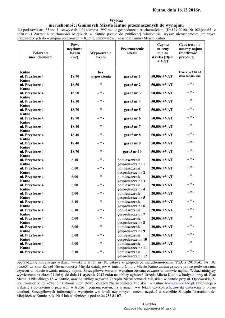Kutno, dnia 16.12.2016r. Wykaz nieruchomości Gminnych Miasta Kutno przeznaczonych do wynajmu Na podstawie art. 35 ust. 1 ustawy z dnia 21 sierpnia 1997 roku o gospodarce nieruchomościami (Dz.U.z 2010r. Nr 102,poz 651 z późn.zm.) Zarząd Nieruchomości Miejskich w Kutnie podaje do publicznej wiadomości wykaz nieruchomości gminnych przeznaczonych do wynajmu położonych w Kutnie, stanowiących własność Gminy Miasto Kutno. Położenie nieruchomości Kutno ul. Przytorze 4 Kutno ul. Przytorze 4 Kutno ul. Przytorze 4 Kutno ul. Przytorze 4 Kutno ul. Przytorze 4 Kutno ul. Przytorze 4 Kutno ul. Przytorze 4 Kutno ul. Przytorze 4 Kutno ul. Przytorze 4 Kutno ul. Przytorze 4 Kutno ul. Przytorze 4 Kutno ul. Przytorze 4 Kutno ul. Przytorze 4 Kutno ul. Przytorze 4 Kutno ul. Przytorze 4 Kutno ul. Przytorze 4 Kutno ul. Przytorze 4 Kutno ul. Przytorze 4 Kutno ul. Przytorze 4 Kutno ul. Przytorze 4 Kutno ul. Przytorze 4 Kutno ul. Przytorze 4 Pow. użytkowa lokalu (m²) Wyposażenie lokalu 18,70 bez wyposażenia garaż nr 1 50,00zł+VAT Okres do 3 lat od dnia podpis. um. 18,50 - // - garaż nr 2 50,00zł+VAT - // - 18,50 - // - garaż nr 3 50,00zł+VAT - // - 18,50 - // - garaż nr 4 50,00zł+VAT - // - 18,70 - // - garaż nr 5 50,00zł+VAT - // - 18,70 - // - garaż nr 6 50,00zł+VAT - // - 18,40 - // - garaż nr 7 50,00zł+VAT - // - 18,40 - // - garaż nr 8 50,00zł+VAT - // - 18,40 - // - garaż nr 9 50,00zł+VAT - // - 18,70 - // - garaż nr 10 50,00zł+VAT - // - 6,10 - // - 20,00zł+VAT - // - 6,00 - // - 20,00zł+VAT - // - 6,00 - // - 20,00zł+VAT - // - 6,00 - // - 20,00zł+VAT - // - 6,00 - // - 20,00zł+VAT - // - 6,10 - // - 20,00zł+VAT - // - 6,10 - // - 20,00zł+VAT - // - 6,00 - // - 20,00zł+VAT - // - 6,00 - // - 20,00zł+VAT - // - 6,00 - // - 20,00zł+VAT - // - 6,00 - // - 20,00zł+VAT - // - 6,10 - // - pomieszczenie gospodarcze nr 1 pomieszczenie gospodarcze nr 2 pomieszczenie gospodarcze nr 3 pomieszczenie gospodarcze nr 4 pomieszczenie gospodarcze nr 5 pomieszczenie gospodarcze nr 6 pomieszczenie gospodarcze nr 7 pomieszczenie gospodarcze nr 8 pomieszczenie gospodarcze nr 9 pomieszczenie gospodarcze nr 10 pomieszczenie gospodarcze nr 11 pomieszczenie gospodarcze nr 12 20,00zł+VAT - // - Przeznaczenie lokalu Czynsz m-czny minim. stawka (zł)/m² + VAT Czas trwania umowy najmu (możliwość przedłuż). Sporządzenie niniejszego wykazu wynika z art.35 ust.1b. ustawy o gospodarce nieruchomościami /Dz.U.z 2010roku Nr 102 poz.651 za zm./ Zarząd Nieruchomości Miejski działający w imieniu Gminy Miasto Kutno zastrzega sobie prawo podwyższania czynszu w trakcie trwania umowy najmu. Szczegółowe warunki wynajmu zostaną zawarte w umowie najmu. Wykaz niniejszy wywieszono na okres 21 dni tj. do dnia 11 stycznia 2017 roku na tablicy ogłoszeń Urzędu Miasta Kutno w budynku przy ul. Plac Marsz. J.Piłsudkiego 18 w Kutnie, oraz na tablicy ogłoszeń Zarządu Nieruchomości Miejskich w Kutnie przy ul. Oporowskiej 5, jak również opublikowano na stronie internetowej Zarządu Nieruchomości Miejskich w Kutnie www.znm.kutno.pl. Informacja o wykazie i ogłoszeniu o przetargu w trybie nieograniczonym, na wynajem ww lokali użytkowych, została ogłoszona w prasie lokalnej. Szczegółowych informacji o wynajmie ww lokali użytkowych, można uzyskać w siedzibie Zarządu Nieruchomości Miejskich w Kutnie, pok. Nr 5 lub telefonicznie pod nr 24 252 81 07. Dyrektor Zarządu Nieruchomości Miejskich w Kutnie