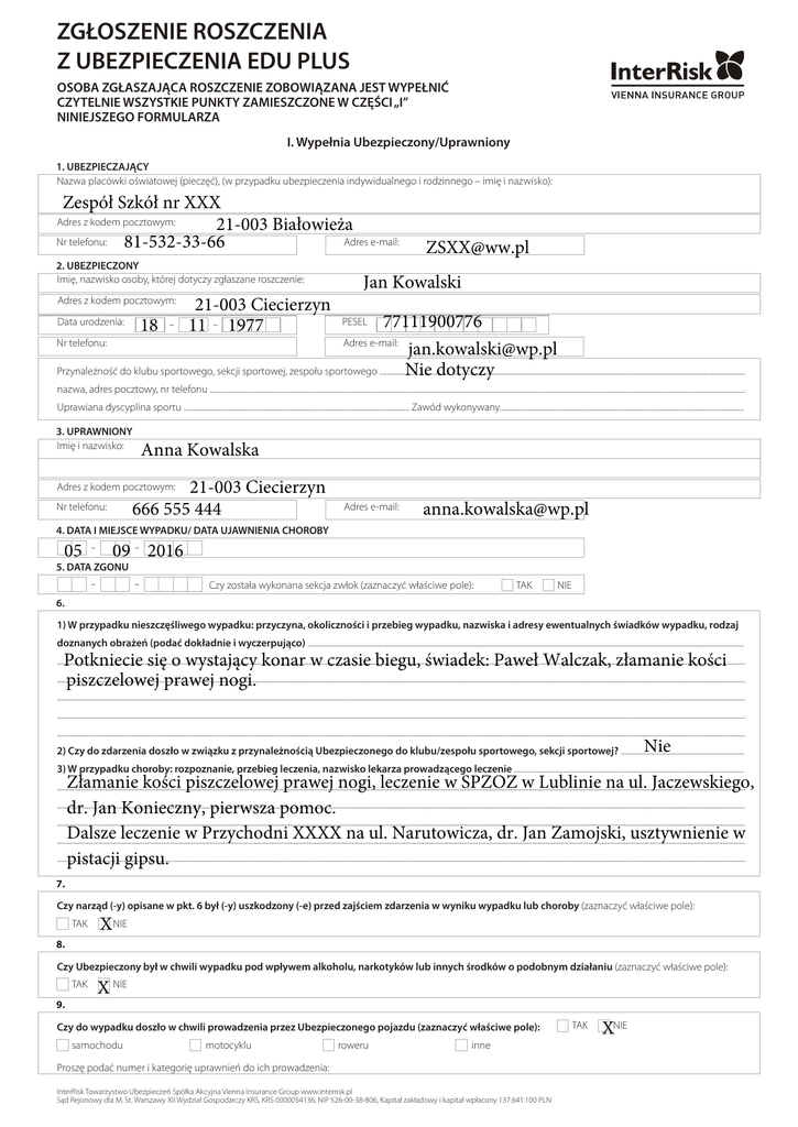 ZGŁOSZENIE ROSZCZENIA Z UBEZPIECZENIA EDU PLUS OSOBA ZGŁASZAJĄCA ROSZCZENIE ZOBOWIĄZANA JEST WYPEŁNIĆ CZYTELNIE WSZYSTKIE PUNKTY ZAMIESZCZONE W CZĘŚCI „I” NINIEJSZEGO FORMULARZA I. Wypełnia Ubezpieczony/Uprawniony 1. UBEZPIECZAJĄCY Nazwa placówki oświatowej (pieczęć), (w przypadku ubezpieczenia indywidualnego i rodzinnego – imię i nazwisko): Zespół Szkół nr XXX Adres z kodem pocztowym: 21-003 Białowieża Adres e-mail: Nr telefonu: 81-532-33-66 2. UBEZPIECZONY Imię, nazwisko osoby, której dotyczy zgłaszane roszczenie: Adres z kodem pocztowym: 21-003 Ciecierzyn 11 1977 [email protected] Jan Kowalski 77111900776 [email protected] Przynależność do klubu sportowego, sekcji sportowej, zespołu sportowego .................................................................................................................................................................................................... Nie dotyczy 18 Data urodzenia: Nr telefonu: PESEL Adres e-mail: nazwa, adres pocztowy, nr telefonu ............................................................................................................................................................................................................................................................................................... Uprawiana dyscyplina sportu ......................................................................................................................... Zawód wykonywany................................................................................................................................... 3. UPRAWNIONY Imię i nazwisko: Anna Kowalska 21-003 Ciecierzyn 666 555 444 Adres z kodem pocztowym: Nr telefonu: Adres e-mail: [email protected] 4. DATA I MIEJSCE WYPADKU/ DATA UJAWNIENIA CHOROBY 05 09 2016 5. DATA ZGONU Czy została wykonana sekcja zwłok (zaznaczyć właściwe pole): TAK NIE 6. 1) W przypadku nieszczęśliwego wypadku: przyczyna, okoliczności i przebieg wypadku, nazwiska i adresy ewentualnych świadków wypadku, rodzaj doznanych obrażeń (podać dokładnie i wyczerpująco) .......................................................................................................................................................................................................................................... Potkniecie się o wystający konar w czasie biegu, świadek: Paweł Walczak, złamanie kości piszczelowej prawej nogi. ................................................................................................................................................................................................................................................................................................................................................................................. ................................................................................................................................................................................................................................................................................................................................................................................. ................................................................................................................................................................................................................................................................................................................................................................................. ................................................................................................................................................................................................................................................................................................................................................................................. ................................................................................................................................................................................................................................................................................................................................................................................. Nie 2) Czy do zdarzenia doszło w związku z przynależnością Ubezpieczonego do klubu/zespołu sportowego, sekcji sportowej? .................................................................. 3) W przypadku choroby: rozpoznanie, przebieg leczenia, nazwisko lekarza prowadzącego leczenie ........................................................................................................................... Złamanie kości piszczelowej prawej nogi, leczenie w SPZOZ w Lublinie na ul. Jaczewskiego, dr. Jan Konieczny, pierwsza pomoc. ................................................................................................................................................................................................................................................................................................................................................................................. Dalsze leczenie w Przychodni XXXX na ul. Narutowicza, dr. Jan Zamojski, usztywnienie w ................................................................................................................................................................................................................................................................................................................................................................................. ................................................................................................................................................................................................................................................................................................................