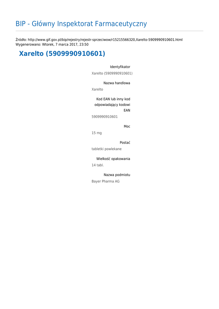 BIP - Główny Inspektorat Farmaceutyczny Źródło: http://www.gif.gov.pl/bip/rejestry/rejestr-sprzeciwow/r15215566320,Xarelto-5909990910601.html Wygenerowano: Wtorek, 7 marca 2017, 23:50 Xarelto (5909990910601) Identyfikator Xarelto (5909990910601) Nazwa handlowa Xarelto Kod EAN lub inny kod odpowiadający kodowi EAN 5909990910601 Moc 15 mg Postać tabletki powlekane Wielkość opakowania 14 tabl. Nazwa podmiotu Bayer Pharma AG