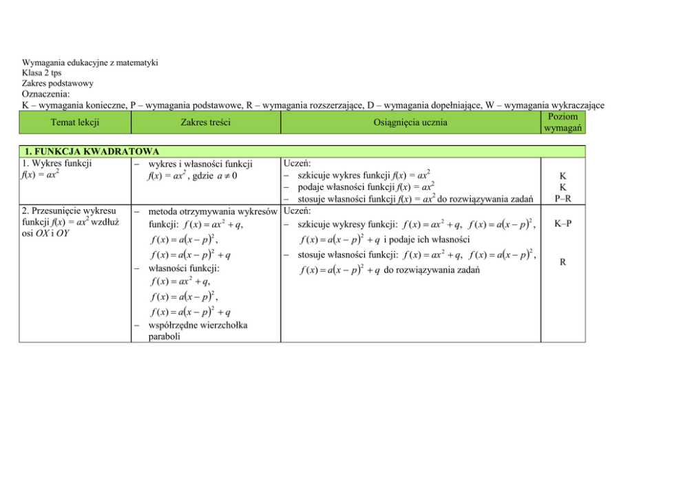 Wymagania edukacyjne z matematyki Klasa 2 tps Zakres podstawowy Oznaczenia: K – wymagania konieczne, P – wymagania podstawowe, R – wymagania rozszerzające, D – wymagania dopełniające, W – wymagania wykraczające Poziom Temat lekcji Zakres treści Osiągnięcia ucznia wymagań 1. FUNKCJA KWADRATOWA 1. Wykres funkcji wykres i własności funkcji f(x) = ax2 f(x) = ax2 , gdzie a 0 2. Przesunięcie wykresu funkcji f(x) = ax2 wzdłuż osi OX i OY Uczeń: szkicuje wykres funkcji f(x) = ax2 podaje własności funkcji f(x) = ax2 stosuje własności funkcji f(x) = ax2 do rozwiązywania zadań metoda otrzymywania wykresów Uczeń: 2 szkicuje wykresy funkcji: f ( x) ax 2 q, f ( x) ax p , funkcji: f ( x) ax 2 q, f ( x) a x p , 2 f ( x) a x p q własności funkcji: f ( x) ax 2 q, 2 f ( x) a x p , 2 f ( x) a x p q współrzędne wierzchołka paraboli 2 K K P–R K–P f ( x) ax p q i podaje ich własności 2 stosuje własności funkcji: f ( x) ax 2 q, f ( x) ax p , 2 f ( x) ax p q do rozwiązywania zadań 2 R 3. Postać kanoniczna i postać ogólna funkcji kwadratowej 4. Równania kwadratowe postać ogólna funkcji kwadratowej postać kanoniczna funkcji kwadratowej trójmian kwadratowy współrzędne wierzchołka paraboli rysowanie wykresu funkcji kwadratowej postaci f ( x) ax 2 bx c wyróżnik trójmianu kwadratowego metoda rozwiązywania równań przez rozkład na czynniki zależność między znakiem wyróżnika a liczbą rozwiązań równania kwadratowego wzory na pierwiastki równania kwadratowego interpretacja geometryczna rozwiązań równania kwadratowego Uczeń: podaje wzór funkcji kwadratowej w postaci ogólnej i kanonicznej oblicza współrzędne wierzchołka paraboli przekształca postać ogólną funkcji kwadratowej do postaci kanonicznej (z zastosowaniem uzupełniania do kwadratu lub wzoru na współrzędne wierzchołka paraboli) i szkicuje jej wykres przekształca postać kanoniczną funkcji kwadratowej do postaci ogólnej wyznacza wzór ogólny funkcji kwadratowej, mając dane współrzędne wierzchołka i innego punktu jej wykresu wyprowadza wzory na współrzędne wierzchołka paraboli Uczeń: stosuje wzory skróconego mnożenia oraz zasadę wyłączania wspólnego czynnika przed nawias do przedstawienia wyrażenia w postaci iloczynu rozwiązuje równanie kwadratowe przez rozkład na czynniki rozwiązuje równania kwadratowe, korzystając z poznanych wzorów interpretuje geometrycznie rozwiązania równania kwadratowego stosuje poznane wzory przy szkicowaniu wykresu funkcji kwadratowej K K P–R P P–R W K K–R K K P–D 2 5. Postać iloczynowa funkcji kwadratowej 6. Nierówności kwadratowe definicja postaci iloczynowej funkcji kwadratowej twierdzenie o postaci iloczynowej funkcji kwadratowej metoda rozwiązywania nierówności kwadratowych 10. Funkcja kwadratowa – najmniejsza i największa zastosowania wartość funkcji kwadratowej w przedziale domkniętym Uczeń: definiuje postać iloczynową funkcji kwadratowej i warunek jej istnienia zapisuje funkcję kwadratową w postaci iloczynowej odczytuje wartości pierwiastków trójmianu podanego w postaci iloczynowej przekształca postać iloczynową funkcji kwadratowej do postaci ogólnej wykorzystuje postać iloczynową funkcji kwadratowej do rozwiązywania zadań Uczeń: rozumie związek między rozwiązaniem nierówności kwadratowej a znakiem wartości odpowiedniego trójmianu kwadratowego rozwiązuje nierówność kwadratową wyznacza na osi liczbowej iloczyn, sumę i różnicę zbiorów rozwiązań kilku nierówności kwadratowych Uczeń: stosuje pojęcie najmniejszej i największej wartości funkcji wyznacza wartość najmniejszą i największą funkcji kwadratowej w przedziale domkniętym stosuje własności funkcji kwadratowej do rozwiązywania zadań optymalizacyjnych K P P P R K K–P R–D K P–D R–D 11. Powtórzenie wiadomości 12. Praca klasowa i jej omówienie 2. PLANIMETRIA 3 1. Miary kątów w trójkącie klasyfikacja trójkątów twierdzenie o sumie miar kątów w trójkącie 2. Trójkąty przystające 3. Trójkąty podobne 4. Wielokąty podobne Uczeń: klasyfikuje trójkąty ze względu na miary ich kątów stosuje twierdzenie o sumie miar kątów wewnętrznych trójkąta do rozwiązywania zadań przeprowadza dowód twierdzenia o sumie miar kątów w trójkącie Uczeń: definicja trójkątów przystających podaje definicję trójkątów przystających oraz cechy przystawania trójkątów cechy przystawania trójkątów wskazuje trójkąty przystające nierówność trójkąta stosuje nierówność trójkąta do rozwiązywania zadań definicja wielokątów podobnych Uczeń: podaje cechy podobieństwa trójkątów cechy podobieństwa trójkątów sprawdza, czy dane trójkąty są podobne skala podobieństwa oblicza długości boków trójkąta podobnego do danego w danej skali układa odpowiednią proporcję, aby wyznaczyć długości brakujących boków trójkątów podobnych wykorzystuje podobieństwo trójkątów do rozwiązywania zadań Uczeń: zależność między polami i obwodami wielokątów rozumie pojęcie figur podobnych podobnych a skalą podobieństwa oblicza długości boków w wielokątach podobnych wykorzystuje zależności między polami i obwodami wielokątów podobnych a skalą podobieństwa do rozwiązywania zadań K K–R D K P–R P–D K K–P K–R P–D R–W K K–R K–D 4 5. Twierdzenie Talesa 6.Trójkąty prostokątne twierdzenie Talesa twierdzenie odwrotne do twierdzenia Talesa twierdzenie Pitagorasa i twierdzenie odwrotne do twierdzenia Pitagorasa wzory na długość przekątnej kwadratu i długość wysokości trójkąta równobocznego Uczeń: podaje twierdzenie Talesa i twierdzenie odwrotne do twierdzenia Talesa wykorzystuje twierdzenie Talesa do rozwiązywania zadań wykorzystuje twierdzenie Talesa do podziału odcinka w podanym stosunku przeprowadza dowód twierdzenia Talesa Uczeń: podaje twierdzenie Pitagorasa i twierdzenie odwrotne do twierdzenia Pitagorasa ora