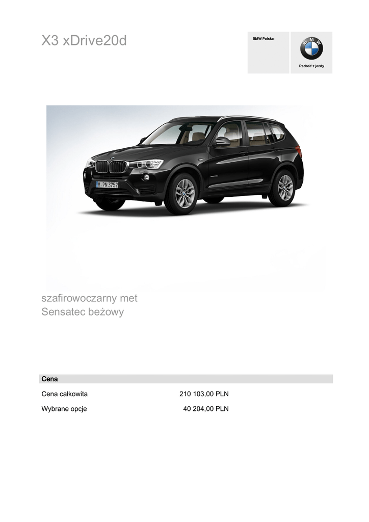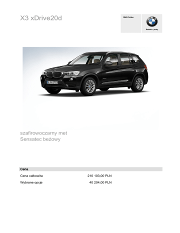 X3 xDrive20d szafirowoczarny met Sensatec beżowy Cena Cena całkowita 210 103,00 PLN Wybrane opcje 40 204,00 PLN Szczegóły konfiguracji Model X3 xDrive20d 169 900,00 PLN Opcje wyposażenia zewnętrznego i tapicerka szafirowoczarny met P0475 3 704,00 PLN Sensatec beżowy FKCB4 1 720,00 PLN Obręcze kół ze stopów lekkich Y-Spoke 305, 17 cali S02EB 663,00 PLN S0205 9 475,00 PLN Eelholzausf. Fineline anthrazit mit Akzentleiste Perlglanz S04FU Chrom 2 248,00 PLN Funkcja Auto Start Stop S01CC Standardowy Odzysk energii hamowania S01CD 0,00 PLN Servotronic S0216 Standardowy Kierownica wielofunkcyjna S0249 0,00 PLN Kierownica sportowa, skórzana S0255 486,00 PLN Opony z funkcją jazdy awaryjnej S0258 Standardowy Śruby zabezpieczające S02PA Standardowy Czujnik ciśnienia w oponach S02VB Standardowy Automatyczne otwieranie/zamykanie klapy bagażnika S0316 2 160,00 PLN Relingi dachowe, aluminium satynowane S03AT 1 455,00 PLN Siatka oddzielająca bagażnik S0413 793,00 PLN Dywaniki welurowe S0423 Standardowy Trójkąt ostrzegawczy S0428 Standardowy Lusterka przyciemniane automatycznie, składane elektrycznie S0430 2 601,00 PLN Wyposażenie dodatkowe Automatyczna skrzynia biegów Szczegóły konfiguracji Wyposażenie dodatkowe Lusterko wsteczne przyciemniane automatycznie S0431 0,00 PLN System załadunkowy S0465 Standardowy Pakiet dodatkowych schowków S0493 1 720,00 PLN Ogrzewanie foteli przednich S0494 1 632,00 PLN Deska rozdzielcza z błyszczącymi czarnymi osłonkami S04NG 0,00 PLN Przełącznik właściwości jezdnych z trybem ECO PRO S04U2 Standardowy Spryskiwacze reflektorów S0502 0,00 PLN Czujniki parkowania z tyłu i z przodu S0508 3 305,00 PLN Światła przeciwmgielne S0520 Standardowy Czujnik deszczu z automatyczną kontrolą S0521 575,00 PLN Reflektory biksenonowe S0522 4 320,00 PLN Klimatyzacja automatyczna S0534 Standardowy Regulator prędkosci z funkcjĚ hamowania S0544 2 026,00 PLN Funkcja dezaktywacji poduszki powietrznej z przodu S05DA Standardowy Radio BMW Professional S0663 Standardowy Zestaw głośnomówiący z interfejsem USB S06NH 1 321,00 PLN Pakiet serwisowy BMW Service Inclusive 5 lat / 100 000 S07NH km 0,00 PLN Polska instrukcja obsługi S08AT 0,00 PLN Rezygnacja z pakietu BMW ConnectedDrive S0ZDX 0,00 PLN Podsumowanie Cena całkowita 210 103,00 PLN Wybrane opcje 40 204,00 PLN Szczegóły konfiguracji 2/06/2014 0.50.00 AM Emisja CO2: 138 g/km. Zalecana cena detaliczna producenta, zawierająca 23% VAT. Firma BMW dołożyła wszelkich starań, aby zagwarantować dokładność informacji podanych w niniejszej witrynie, ale nie przejmuje odpowiedzialności za ewentualne błędy lub przeoczenia. Firma BMW nie przejmuje odpowiedzialności wynikającej z podanych informacji. Szczegółowy opis wyposażenia Czujnik deszczu z automatyczną kontrolą Czujnik deszczu z automatyczną aktywacją świateł mijania: po włączeniu samoczynnie uruchamia wycieraczki i automatycznie reguluje częstotliwość ich działania. Automatyczna aktywacja świateł mijania samoczynnie włącza światła o zmroku czy w tunelach. Czujniki parkowania z tyłu i z przodu Park Distance Control (PDC) z przodu i z tyłu ułatwiają parkowanie oraz manewrowanie na ciasnej przestrzeni, zbliżanie się samochodu do przeszkody sygnalizowane jest akustycznie, a w połączeniu z radiem BMW Professional lub systemem nawigacyjnym również optycznie na monitorze pokładowym. Deska rozdzielcza z błyszczącymi czarnymi osłonkami Maskownice deski rozdzielczej w błyszczącym kolorze czarnym (w połączeniu z opcjonalną listwą wewnętrzną). Kierownica sportowa, skórzana Sportowa kierownica skórzana, trójramienna, z podparciem kciuków (standard w X3 xDrive35i i X3 xDrive35d). Lusterka przyciemniane automatycznie, składane elektrycznie Lusterko wewnętrzne i lusterka zewnętrzne przyciemniane automatycznie z funkcją składania lusterek zewnętrznych. Lusterko wsteczne przyciemniane automatycznie Lusterko wewnętrzne, przyciemniane automatycznie, zwiększa bezpieczeństwo i komfort jazdy w nocy. Ogrzewanie foteli przednich Ogrzewanie foteli przednich (trzystopniowe), ogrzewane jest siedzisko i oparcie wraz z poduszkami bocznymi, pozwala w krótkim czasie uzyskać przyjemne warunki jazdy. Pakiet dodatkowych schowków Pakiet schowków obejmuje chromowane wstawki w uchwytach na napoje, schowek po lewej stronie pod kierownicą, gniazdko pod podłokietnikiem, siatkę w przestrzeni na nogi po stronie pasażera, gniazdko w konsoli środkowej z tyłu, podłokietnik tylny z dwoma uchwytami na napoje, siatki na oparciach foteli przednich i siatkę w bagażniku po lewej stronie. Radio BMW Professional Klimatyzacja automatyczna 2-strefowa klimatyzacja automatyczna z automatycznym zamykaniem obiegu powietrza, filtrem z węglem aktywnym, czujnikiem zaparowania i nasłonecznienia pozwala szybko osiągnąć żądaną temperaturę i utrzymuje ją na stałym poziomie. Regulacja temperatury z przodu (oddzielnie dla prawej i lewej strony), regulowana wentylacja i klimatyzacja z tyłu (standard w X3 xDrive 35i oraz X3 xDrive35d). Radio BMW Professional, zakres funkcji jak w BMW Business CD, ponadto wyświetlacz 6,5-calowy z kontrolerem wielofunkcyjnym do rozszerzonego wyświetlania numerów telefonu, nazwisk/nazw i tytułów utworów. Szczegółowy opis wyposażenia Reflektory biksenonowe Reflektory ksenonowe (światła mijania i drogowe) z diodowymi pierścieniami świetlnymi świateł dziennych i lampami tylnymi z pasami świetlnymi, spryskiwaczami reflektorów i automatyczną regulacją zasięgu oświetlenia, umożliwiają znacznie lepsze oświetlenie drogi w nocy oraz przy złej widoczności. Regulator prędkosci z funkcjĚ hamowania Regulator prędkości z funkcją hamowania zapamiętuje żądaną prędkość (powyżej ok. 30 km/h), wskazuje ją na wyświetlaczu informacyjnym i utrzymuje ją na wybranym poziomie. Użycie hamulca wyłącza regulator oraz jego podfunkcje (standard w X3 xDrive35i i X3 xDrive35d). Relingi 