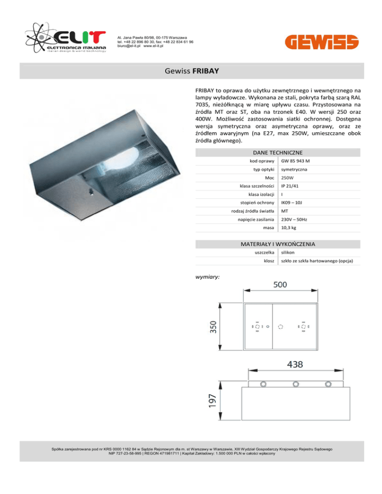 Al. Jana Pawła 80/98, 00-175 Warszawa tel. +48 22 896 80 30, fax: +48 22 834 61 96 [email protected] www.el-it.pl Gewiss FRIBAY FRIBAY to oprawa do użytku zewnętrznego i wewnętrznego na lampy wyładowcze. Wykonana ze stali, pokryta farbą szarą RAL 7035, nieżółknącą w miarę upływu czasu. Przystosowana na źródła MT oraz ST, oba na trzonek E40. W wersji 250 oraz 400W. Możliwość zastosowania siatki ochronnej. Dostępna wersja symetryczna oraz asymetryczna oprawy, oraz ze źródłem awaryjnym (na E27, max 250W, umieszczane obok źródła głównego). DANE TECHNICZNE kod oprawy typ optyki Moc klasa szczelności klasa izolacji stopień ochrony rodzaj źródła światła napięcie zasilania masa GW 85 943 M symetryczna 250W IP 21/41 I IK09 – 10J MT 230V – 50Hz 10,3 kg MATERIAŁY I WYKOŃCZENIA uszczelka klosz silikon szkło ze szkła hartowanego (opcja) wymiary: Spółka zarejestrowana pod nr KRS 0000 1162 84 w Sądzie Rejonowym dla m. st Warszawy w Warszawie, XIII Wydział Gospodarczy Krajowego Rejestru Sądowego NIP 727-23-58-995 | REGON 471981711 | Kapitał Zakładowy: 1.500 000 PLN w całości wpłacony