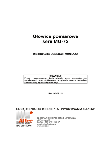 Głowice pomiarowe serii MG-72 INSTRUKCJA OBSŁUGI I MONTAŻU !!!UWAGA!!! Przed rozpoczęciem jakichkolwiek prac montażowych, serwisowych oraz użytkowania urządzenia należy dokładnie zapoznać się z poniższą instrukcją. Rev. MG72.1.5 URZĄDZENIA DO MIERZENIA I WYKRYWANIA GAZÓW ISO 9001: 2001 62-080 TARNOWO PODGÓRNE k/POZNANIA ul. Pocztowa 13 tel./fax. +48 0-61 814 65 57 e-mail: [email protected] www.altersa.pl SPIS TREŚCI OSTRZEŻENIA I ISTOTNE UWAGI ........................................................................................3 PRZEZNACZENIE GŁOWIC....................................................................................................5 OPIS FUNKCJONALNY GŁOWIC ...........................................................................................5 Współpraca głowic z centracą sterującą...............................................................................6 Kalibracja głowic pomiarowych.............................................................................................6 MONTAŻ GŁOWIC POMIAROWYCH......................................................................................7 Lokalizacja i instalowanie głowic ..........................................................................................7 Dokonywanie połączeń z centralą ........................................................................................9 URUCHAMIANIE SYSTEMU Z GŁOWICAMI POMIAROWYMI ..............................................9 KONTROLA OKRESOWA .......................................................................................................9 ZALECENIA EKSPLOATACYJNE .........................................................................................10 PODSTAWOWE PARAMETRY TECHNICZNE .....................................................................11 SPECYFIKACJA CZUJNIKÓW GŁOWIC SERII MG-72 ........................................................12 CZUŁOŚCI WZGLĘDNE CZUJNIKÓW ELEKTROCHEMICZNYCH .....................................12 NAJWYŻSZE DOPUSZCZALNE STĘŻENIA I GRANICE WYBUCHOWOŚCI W POWIETRZU WYBRANYCH GAZÓW I PAR ........................................................................15 TYPOWE USTERKI I SPOSOBY ICH USUWANIA ...............................................................17 WYKAZ CZĘŚĆI ZAMIENNYCH I OPCJONALNYCH ...........................................................17 2 OSTRZEŻENIA I ISTOTNE UWAGI ! ! ! ! ! ! ! ! ! ! ! ! ! ! ! ! ! Dla zachowania bezpieczeństwa urządzenie musi być montowane, obsługiwane i konserwowane wyłącznie przez wykwalifikowany personel oraz zgodnie z obowiązującymi przepisami. Przed podjęciem jakichkolwiek prac montażowych bądź serwisowych należy dokładnie przeczytać w całości poniższą instrukcję. Zabrania się samodzielnego dokonywania jakichkolwiek napraw i zmian w układzie urządzenia. Dokonywanie samodzielnej naprawy lub wymiana jakichkolwiek podzespołów głowic pomiarowych, może doprowadzić do zmniejszenia lub całkowitej utraty budowy przeciwwybuchowej urządzenia. Kategorycznie zabronione jest dokonywanie przeprogramowywania głowicy w strefach zagrożenia wybuchowego. Urządzenie należy używać wyłącznie zgodnie z przeznaczeniem, obowiązującymi przepisami oraz zgodnie z opisami zawartymi w poniższej instrukcji, w przeciwnym razie urządzenie może działać nieprawidłowo i nie gwarantować bezpieczeństwa. Nie należy używać uszkodzonego lub częściowo niesprawnego urządzenia. W przypadku stwierdzenia uszkodzenia, lub nieprawidłowości w pracy urządzenia należy skontaktować się z producentem urządzenia lub jego autoryzowanym serwisem. Jeśli urządzenie jest uszkodzone, lub funkcjonuje nieprawidłowo należy bezwzględnie zaprzestać jego używania i skontaktować się z producentem lub autoryzowanym serwisem. Nagłe zmiany ciśnienia atmosferycznego mogą powodować tymczasowe wahania wskazań czujnika tlenu. W przypadku, gdy głowica pomiarowa MG-72 posiada w konfiguracji czujniki wymagające utrzymywania ciągłego zasilania (z biasem), po wyłączeniu i ponownym załączeniu zasilania czujniki takie mogą generować wysoki sygnał wyjściowy przez czas zależny od czasu trwania wyłączenia systemu. W takim przypadku, po włączeniu należy zaczekać na ustabilizowanie się parametrów tych czujników (zalecane jest także dokonanie sprawdzenia wskazań gazem wzorcowym). Przekroczenia zakresów pomiarowych czujników w głowicach, mogą ujemnie wpływać na parametry czujnika lub być przyczyną jego uszkodzenia. Każdorazowo po przekroczeniu zakresu pomiarowego danego czujnika należy skontrolować jego zdolność pomiarową poprzez sprawdzenie gazem wzorcowym. Głowice pomiarowe nie mogą być stosowany w atmosferze zawierającej więcej niż 21 % v/v O2. Czujniki gazów toksycznych i tlenu, stosowane w głowicach MG-72, są wrażliwe na zakłócenia elektromagnetyczne. W obecności silnych pól elektromagnetycznych wskazania tych czujników mogą być zakłócane (zawyżane lub zaniżane). Bezwzględnie należy przestrzegać terminów przeglądów okresowych i kalibracji zalecanych przez producenta. Przeglądy takie i kalibracje powinien wykonywać wyłącznie autoryzowany serwis producenta lub on sam. Zalecane jest okresowe testowanie głowic pomiarowych poprzez podawanie gazu o znanym stężeniu i kontroli wskazań. Niedozwolone jest testowanie głowic pomiarowych przy pomocy gazu z zapalniczek, nieznanymi gazami, lub gazami o nieznanym stężeniu, gdyż może to spowodować trwałą zmianę czułości czujnika, lub w skrajnych przypadkach doprowadzić do jego uszkodzenia. Żadnego z elementów głowicy nie należy narażać na udary elektryczne, mechaniczne, działanie cieczy, dużej ilości pyłów i innych zanieczyszczeń. 3 Utylizacja zużytego sprzętu elektrycznego i elektronicznego. Symbol ten umieszczony na produkcie, jego instrukcji obsługi lub jego opakowaniu stanowi, że produkt 