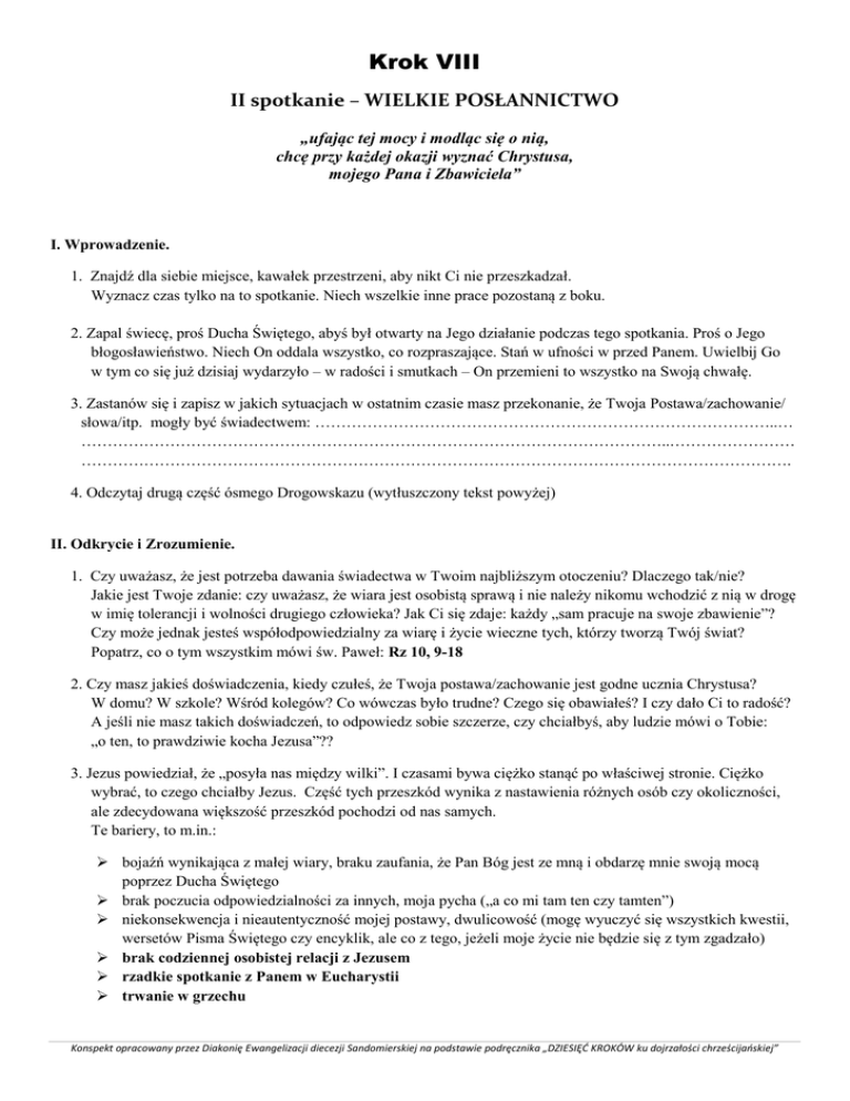 Krok VIII II spotkanie – WIELKIE POSŁANNICTWO „ufając tej mocy i modląc się o nią, chcę przy każdej okazji wyznać Chrystusa, mojego Pana i Zbawiciela” I. Wprowadzenie. 1. Znajdź dla siebie miejsce, kawałek przestrzeni, aby nikt Ci nie przeszkadzał. Wyznacz czas tylko na to spotkanie. Niech wszelkie inne prace pozostaną z boku. 2. Zapal świecę, proś Ducha Świętego, abyś był otwarty na Jego działanie podczas tego spotkania. Proś o Jego błogosławieństwo. Niech On oddala wszystko, co rozpraszające. Stań w ufności w przed Panem. Uwielbij Go w tym co się już dzisiaj wydarzyło – w radości i smutkach – On przemieni to wszystko na Swoją chwałę. 3. Zastanów się i zapisz w jakich sytuacjach w ostatnim czasie masz przekonanie, że Twoja Postawa/zachowanie/ słowa/itp. mogły być świadectwem: ……………………………………………………………………………..… …………………………………………………………………………………………………..…………………… ………………………………………………………………………………………………………………………. 4. Odczytaj drugą część ósmego Drogowskazu (wytłuszczony tekst powyżej) II. Odkrycie i Zrozumienie. 1. Czy uważasz, że jest potrzeba dawania świadectwa w Twoim najbliższym otoczeniu? Dlaczego tak/nie? Jakie jest Twoje zdanie: czy uważasz, że wiara jest osobistą sprawą i nie należy nikomu wchodzić z nią w drogę w imię tolerancji i wolności drugiego człowieka? Jak Ci się zdaje: każdy „sam pracuje na swoje zbawienie”? Czy może jednak jesteś współodpowiedzialny za wiarę i życie wieczne tych, którzy tworzą Twój świat? Popatrz, co o tym wszystkim mówi św. Paweł: Rz 10, 9-18 2. Czy masz jakieś doświadczenia, kiedy czułeś, że Twoja postawa/zachowanie jest godne ucznia Chrystusa? W domu? W szkole? Wśród kolegów? Co wówczas było trudne? Czego się obawiałeś? I czy dało Ci to radość? A jeśli nie masz takich doświadczeń, to odpowiedz sobie szczerze, czy chciałbyś, aby ludzie mówi o Tobie: „o ten, to prawdziwie kocha Jezusa”?? 3. Jezus powiedział, że „posyła nas między wilki”. I czasami bywa ciężko stanąć po właściwej stronie. Ciężko wybrać, to czego chciałby Jezus. Część tych przeszkód wynika z nastawienia różnych osób czy okoliczności, ale zdecydowana większość przeszkód pochodzi od nas samych. Te bariery, to m.in.: bojaźń wynikająca z małej wiary, braku zaufania, że Pan Bóg jest ze mną i obdarzę mnie swoją mocą poprzez Ducha Świętego brak poczucia odpowiedzialności za innych, moja pycha („a co mi tam ten czy tamten”) niekonsekwencja i nieautentyczność mojej postawy, dwulicowość (mogę wyuczyć się wszystkich kwestii, wersetów Pisma Świętego czy encyklik, ale co z tego, jeżeli moje życie nie będzie się z tym zgadzało) brak codziennej osobistej relacji z Jezusem rzadkie spotkanie z Panem w Eucharystii trwanie w grzechu Konspekt opracowany przez Diakonię Ewangelizacji diecezji Sandomierskiej na podstawie podręcznika „DZIESIĘĆ KROKÓW ku dojrzałości chrześcijańskiej” Jakie jeszcze widzisz bariery w świadczeniu? Czy któreś z nich są Twoimi? Dopisz je do powyższej listy. 4. Do kogo ma być adresowane moje świadectwo? Z pomocą przychodzi nam tutaj Papież Franciszek, który wymienia trzy takie grupy: „14. Wsłuchując się w Ducha, pomagającego nam rozpoznawać wspólnotowo znaki czasów, od 7 do 28 października 2012 r. miało miejsce XIII Zwyczajne Zgromadzenie Ogólne Synodu Biskupów na temat Nowa ewangelizacja dla przekazu wiary chrześcijańskiej. Przypomniano tam, że nowa ewangelizacja wzywa wszystkich i urzeczywistnia się zasadniczo w trzech obszarach. W pierwszym rzędzie wymieńmy obszar duszpasterstwa zwyczajnego, «które powinno być w większym stopniu ożywiane ogniem Ducha, aby rozpaliło serca wierzących, którzy regularnie uczestniczą w życiu wspólnoty i gromadzą się w dniu Pańskim, by karmić się Słowem Bożym i Chlebem życia wiecznego». Do tego obszaru należy także zaliczyć wiernych, którzy zachowują żywą i szczerą wiarę katolicką, dając jej wyraz na różny sposób, chociaż nie uczestniczą często w kulcie. Duszpasterstwo to ukierunkowane jest na rozwój wierzących, tak by coraz lepiej całym swoim życiem odpowiadali na miłość Bożą. Na drugim miejscu wspomnijmy o środowisku «osób ochrzczonych, które jednakże nie żyją zgodnie z wymogami chrztu św.», nie przynależą całym sercem do Kościoła, nie doświadczają już pociechy płynącej z wiary. Kościół jako zawsze troskliwa matka stara się, aby przeżyli oni nawrócenie, które przywróciłoby im radość wiary oraz pragnienie zaangażowania się w Ewangelię. W końcu zauważmy, że ewangelizacja jest istotnie związana z głoszeniem Ewangelii tym, którzy nie znają Jezusa Chrystusa lub zawsze Go odrzucali. Wielu z nich, ogarniętych tęsknotą za obliczem Boga, szuka Go w skrytości, również w krajach o starej tradycji chrześcijańskiej. Wszyscy mają prawo przyjąć Ewangelię. Chrześcijanie mają obowiązek głoszenia jej, nie wykluczając nikogo, nie jak ktoś, kto narzuca nowy obowiązek, ale jak ktoś, kto dzieli się radością, ukazuje piękną perspektywę, wydaje upragnioną ucztę. Kościół nie rośnie przez prozelityzm, ale «przez przy-ciąganie»” /Evangelii Gaudium/ Który krąg odbiorców ewangelizacji dotyczy środowiska mojego życia? Za kogo powinienem czuć się najbardziej odpowiedzialny? 5. Jest taka pokusa, że kiedy moje świadectwo jest autentyczne i zaczyna pociągać ludzi zaczniemy myśleć, że „są moi”, „ja ich przyciągnąłem”. Idąc dalej można się zapętlić i powiedzieć, że są moimi uczniami. Cóż…o Ducha Pokory trzeba nam zawsze prosić. Na nic nam nasi uczniowie, jeśli nie będą oni przede wszy