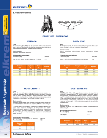 6. Spawanie żeliwa DRUTY LITE I RDZENIOWE F-NiFe 36 F-NiFe 60/40 Opis Drut rdzeniowy Ni- (36%), Fe- do spawania żeliwa oraz łączenia stali z żeliwem. Spoina jest obrabialna, odznacza się ekstremalnie niskim współczynnikiem rozszerzalności cieplnej. Opis Drut rdzeniowy Ni-, Fe- do spawania żeliwa i łączenia stali z żeliwem. Dostępny również w postaci drutu litego. Zastosowanie Żeliwo odlewane odśrodkowo, żeliwo sferoidalne, żeliwo ciągliwe. Właściwości mechaniczne Twardość [HB] 140-160 Właściwości mechaniczne Twardość [HB] 160-190 Gaz I1, M13: Argon lub 99% Argon na 1% tlenu =+ Gaz I1, M13: Argon lub 99% Argon na 1% tlenu =+ Średnica mm Napięcie V Prąd A Kg/opak. Średnica mm Napięcie V Prąd A Kg/opak. 1,6 20-26 160-260 15,0 1,6 20-26 160-260 15,0 2,0 22-27 220-280 15,0 2,0 22-27 220-280 15,0 2,4 24-28 260-340 15,0 2,4 24-28 260-340 15,0 2,8 25-29 300-400 15,0 2,8 25-29 300-400 15,0 MOST Lastek 11 MOST Lastek 415 Opis Pręty do spawania gazowego, przeznaczone do napraw, napawania i spawania żeliwa. Napoina, kolorem i strukturą, zbliżona jest do żeliwa szarego. Spoina i strefa przejściowa jest w pełni obrabialna mechanicznie. Mogą być stosowane do napawania powierzchni narażonych na korozje i zużycie ścierne. Opis MOST Lastek 415 to otulony pręt przeznaczony do uzupełniania ubytków w żeliwie metodą TIG. Topnik zawarty w otulinie zapewnia doskonałe połączenie nawet w przypadku spawania „kłopotliwych” rodzajów żeliwa. Uzyskana napoina charakteryzuje się doskonałymi właściwościami mechanicznymi i jest obrabialna mechanicznie. Doskonale nadaje się do napwania krawędzi narzędzi wykonanych z żeliwa oraz do uzupełniania defektów odlewniczych. Zastosowanie Kolektory wydechowe, bloki silników, obudowy pomp, miski olejowe, koła zębate i łańcuchowe, naprawy defektów odlewniczych. Druty Napawanie i regeneracja Zastosowanie Naprawa elementów żeliwnych Oczyścić uszkodzone miejsce. Zwiększyć powierzchnie styku najlepiej przez żłobienie. Podgrzać do temperatury ok. 400°C. Stosować topnik Lastek 11. Lokalnie podgrzewać materiał do czerwoności. Płomień powinien by nieznacznie utleniający. W celu uniknięcia porów, nie należy jednorazowo nakładać zbyt dużej warstwy. Właściwości mechaniczne Wytrzymałość na rozciąganie Rm [N/mm²] Twardość [HB] 44 Średnica mm Kg/opak. 4,0 5,0 6,0 5,0 6. Spawanie żeliwa 240-330 185 Zastosowanie Naprawy narzędzi i form wykonanych z żeliwa, uzupełnianie wad odlewniczych. Właściwości mechaniczne Twardość [HB] 160-200 Gaz Argon =+ Średnica mm Napięcie V Prąd A Kg/opak. 1,6 20-26 160-260 15,0 © Elkrem – Wszelkie prawa zastrzeżone.