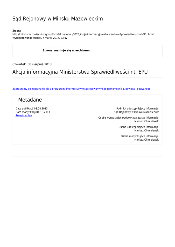 Sąd Rejonowy w Mińsku Mazowieckim Źródło: http://minsk-mazowiecki.sr.gov.pl/srm/aktualnosci/3323,Akcja-informacyjna-Ministerstwa-Sprawiedliwosci-nt-EPU.html Wygenerowano: Wtorek, 7 marca 2017, 23:52 Strona znajduje się w archiwum. Czwartek, 08 sierpnia 2013 Akcja informacyjna Ministerstwa Sprawiedliwości nt. EPU Zapraszamy do zapoznania się z broszurami informacyjnymi adresowanymi do pełnomocnika, powoda i pozwanego Metadane Data publikacji 08.08.2013 Data modyfikacji 04.10.2013 Rejestr zmian Podmiot udostępniający informację: Sąd Rejonowy w Mińsku Mazowieckim Osoba wytwarzająca/odpowiadająca za informację: Mariusz Chmielewski Osoba udostępniająca informację: Mariusz Chmielewski Osoba modyfikująca informację: Mariusz Chmielewski