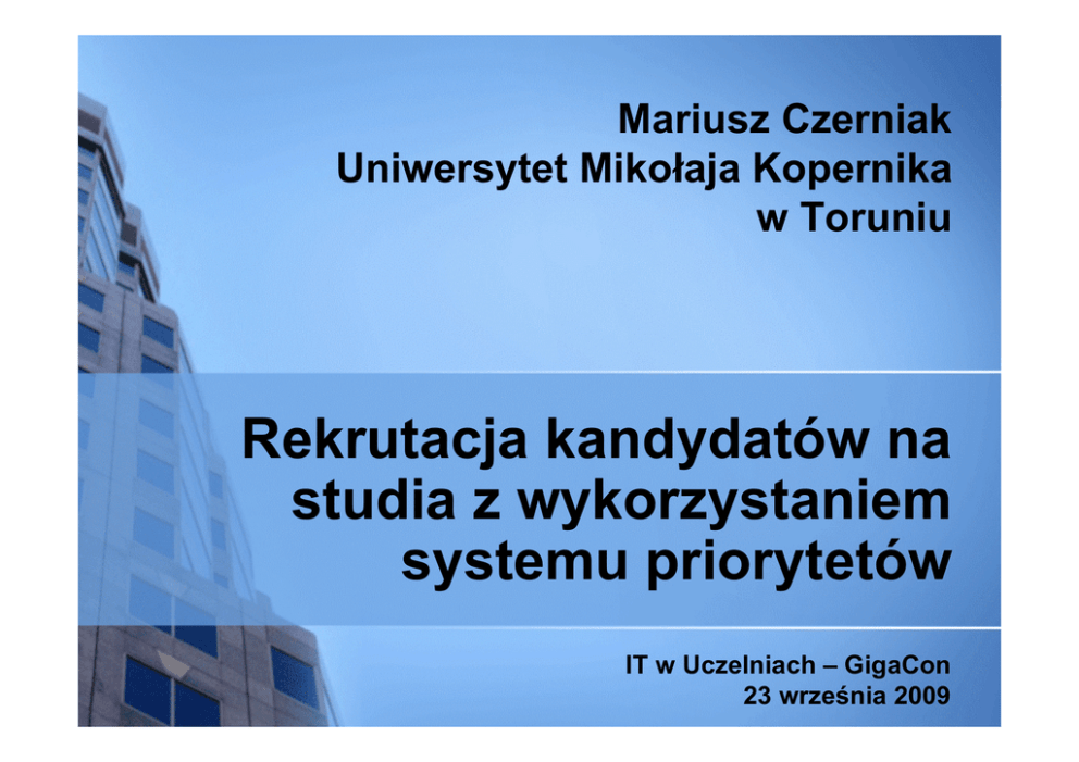 Mariusz Czerniak Uniwersytet Mikołaja Kopernika w Toruniu Rekrutacja kandydatów na studia z wykorzystaniem systemu priorytetów IT w Uczelniach – GigaCon 23 września 2009 Projekt Internetowa Rejestracja Kandydatów (IRK) Realizowany od 2002 roku przez Uniwersytet Warszawski Od 2005 roku włączony do projektu USOS (Uniwersytecki System Obsługi Studiów), który zawiera m.in. takie aplikacje: Informator ECTS Wirtualny dziekanat (USOSweb) Archiwum Prac Dyplomowych biurokarier.edu.pl Strona domowa projektu http://usos.edu.pl/ Strona 2 Projekt Internetowa Rejestracja Kandydatów (IRK) Właścicielem jest Międzyuniwersyteckie Centrum Informatyzacji (MUCI) – konsorcjum zrzeszające 33 polskie uczelnie Stosowany przez 18 uczelni wyższych czołowe uczelnie z rankingu Perspektywy/Rzeczpospolita wg GUS - 20% przyjętych kandydatów przez uczelnie publiczne w 2007 roku Strona domowa projektu http://usos.edu.pl/ Strona 3 Przeznaczenie Informator o oferowanych studiach Źródło informacji dla kandydatów o przebiegu i wynikach postępowania kwalifikacyjnego Strona 4 formularz zgłoszeniowy z kadrowaniem zdjęć do ELS kontrola spełnienia wymagań kwalifikacyjnych ustalenie kolejności kierunków (priorytetów) ewidencja wpłat rekrutacyjnych informacja o dodatkowych elementach postępowania, np. rozmowy kwalifikacyjne, egzaminy sprawnościowe Przeznaczenie, ciąg dalszy Szybki kontakt z kandydatami grupowe emailowe powiadomienia indywidualne wiadomości na konto w systemie Forum dyskusyjne - wymiana informacji, spostrzeżeń, wątpliwości Rok 2007 2008 2009 Strona 5 Lic zby mode ratorów 8 15 7 te matów 10381 8508 4626 pos tów 90427 72007 67163 odpow ie dzi 3494 7637 2911 Przeznaczenie, ciąg dalszy Obsługa komisji rekrutacyjnych Strona 6 obliczanie punktów rankingowych z wykorzystaniem złożonych formuł i dokonanie kwalifikacji kandydatów drukowanie szeregu niezbędnych raportów (listy, protokoły, decyzje) szybkie przyjmowanie dokumentów – kod kreskowy na podaniu Wspomaganie przeprowadzenia postępowania odwoławczego Dostęp dla kadry zarządzającej do licznych statystyk Lokalne modyfikacje systemu Uwzględnienie specyfiki uczelni Dodanie nowych funkcjonalności Strona 7 wygląd aplikacji lub jej elementów zmiany w działaniu wybranych funkcji import masowych płatności odmienne formuły kwalifikacyjne i rankingowe dodatkowe raporty i statystyki Krajowy Rejestr Matur (KReM) Zautomatyzowany import dla uprawnionych kandydatów Strona 8 wyników maturalnych numerów świadectw ukończonych szkół średnich danych o olimpiadach dla finalistów Kontrola poprawności importu Wyższość wyników z KReM nad wprowadzonymi samodzielnie przez kandydatów Koszty osobowe Administracja serwerem i systemem – 0.4 etatu Przygotowanie oferty – 0.3 etatu HelpDesk – 0.3 etatu Strona 9 pisanie i testowanie formuł kwalifikacyjnych i rankingowych import plików z wpłatami wsparcie dla komisji rekrutacyjnych moderowanie forum Zmniejszenie składu komisji rekrutacyjnych (130 osób w 2006 r. -> 30 osób w 2009 r.) Zastosowanie priorytetów Przygotowanie i wdrożenie algorytmu do systemu IRK – programiści z UMK Założenia Strona 10 kandydat może zostać zakwalifikowany tylko na jeden kierunek studiów kandydaci o takiej samej liczbie punktów na danym kierunku otrzymują taki sam status złożenie dokumentów w terminie pozwala kandydatowi na dalszy udział w postępowaniu niezłożenie dokumentów w terminie usuwa kandydata z dalszego postępowania (status nieprzyjęty) Zastosowanie priorytetów, ciąg dalszy Ustalenie harmonogramu odbywania tur rekrutacji z priorytetami Parametry początkowe ustalenie kierunków biorących udział w priorytetach dla każdego kierunku Strona 11 określenie liczby zakwalifikowań w odniesieniu do limitu miejsc oraz długości listy rezerwowej podanie minimalnego progu punktowego, od którego kandydat może zostać zakwalifikowany Wymierne efekty stosowania priorytetów Wype łnie nie limitó w mie js c Os iąg nię ta s atys fakc ja - prz yję c ie na kie rune k o najwyż s z ym prio ryte c ie 100,00% 90,00% 90,64% 87,75% 78,29% 82,21% 80,27% 79,76% 80,00% 70,00% 60,00% 50,00% 40,00% 30,00% 20,00% 10,00% 0,00% Strona 12 2007 2008 2009 Dziękuję za uwagę Strona 13
