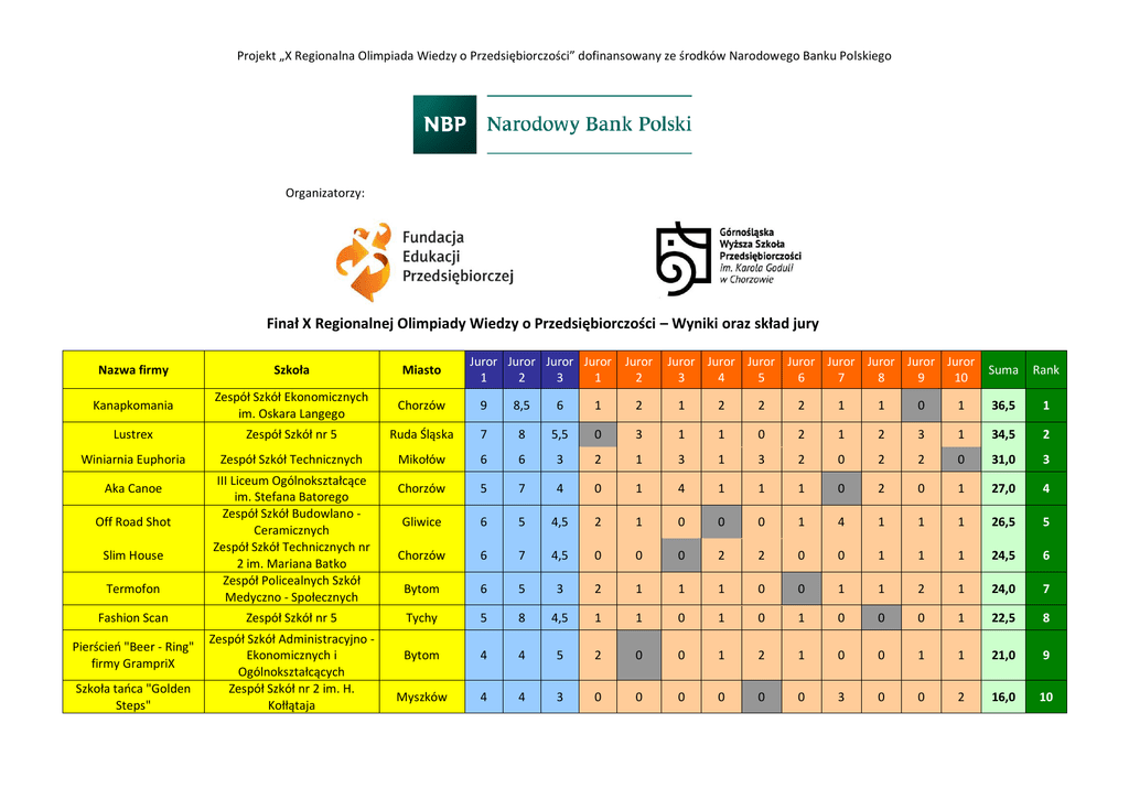 Projekt „X Regionalna Olimpiada Wiedzy o Przedsiębiorczości” dofinansowany ze środków Narodowego Banku Polskiego Organizatorzy: Finał X Regionalnej Olimpiady Wiedzy o Przedsiębiorczości – Wyniki oraz skład jury Juror Juror Juror Juror 1 2 3 1 Juror 2 Juror Juror Juror Juror Juror Juror Juror Juror 3 4 5 6 7 8 9 10 Nazwa firmy Szkoła Miasto Kanapkomania Zespół Szkół Ekonomicznych im. Oskara Langego Chorzów 9 8,5 6 1 2 1 2 2 2 1 1 0 Lustrex Zespół Szkół nr 5 Ruda Śląska 7 8 5,5 0 3 1 1 0 2 1 2 Winiarnia Euphoria Zespół Szkół Technicznych Mikołów 6 6 3 2 1 3 1 3 2 0 Chorzów 5 7 4 0 1 4 1 1 1 Gliwice 6 5 4,5 2 1 0 0 0 Chorzów 6 7 4,5 0 0 0 2 Bytom 6 5 3 2 1 1 Tychy 5 8 4,5 1 1 Bytom 4 4 5 2 Myszków 4 4 3 0 Aka Canoe Off Road Shot Slim House Termofon Fashion Scan Pierścień "Beer - Ring" firmy GrampriX Szkoła tańca "Golden Steps" III Liceum Ogólnokształcące im. Stefana Batorego Zespół Szkół Budowlano Ceramicznych Zespół Szkół Technicznych nr 2 im. Mariana Batko Zespół Policealnych Szkół Medyczno - Społecznych Zespół Szkół nr 5 Zespół Szkół Administracyjno Ekonomicznych i Ogólnokształcących Zespół Szkół nr 2 im. H. Kołłątaja Suma Rank 1 36,5 1 3 1 34,5 2 2 2 0 31,0 3 0 2 0 1 27,0 4 1 4 1 1 1 26,5 5 2 0 0 1 1 1 24,5 6 1 0 0 1 1 2 1 24,0 7 0 1 0 1 0 0 0 1 22,5 8 0 0 1 2 1 0 0 1 1 21,0 9 0 0 0 0 0 3 0 0 2 16,0 10 Projekt „X Regionalna Olimpiada Wiedzy o Przedsiębiorczości” dofinansowany ze środków Narodowego Banku Polskiego Organizatorzy: Oznaczenie Juror 1 Juror 2 Juror 3 Juror 1 Juror 2 Juror 3 Juror 4 Juror 5 Juror 6 Juror 7 Juror 8 Juror 9 Juror 10 Imię i nazwisko/nazwa oceniającego Teresa Kraśnicka Robert Wolny Anna Radzikowska Zespół Szkół nr 5 Zespół Szkół Administracyjno - Ekonomicznych i Ogólnokształcących Zespół Szkół Technicznych nr 2 im. M. Batko Zespół Szkół Budowlano - Ceramicznych Zespół Szkół nr 2 im. H. Kołłątaja Zespół Szkół Medyczno - Społecznych III Liceum Ogólnokształcące im. Stefana Batorego Zespół Szkół nr 5 Zespół Szkół Ekonomicznych Zespół Szkół Technicznych Miasto Ruda Śląska Bytom Chorzów Gliwice Myszków Bytom Chorzów Tychy Chorzów Mikołów
