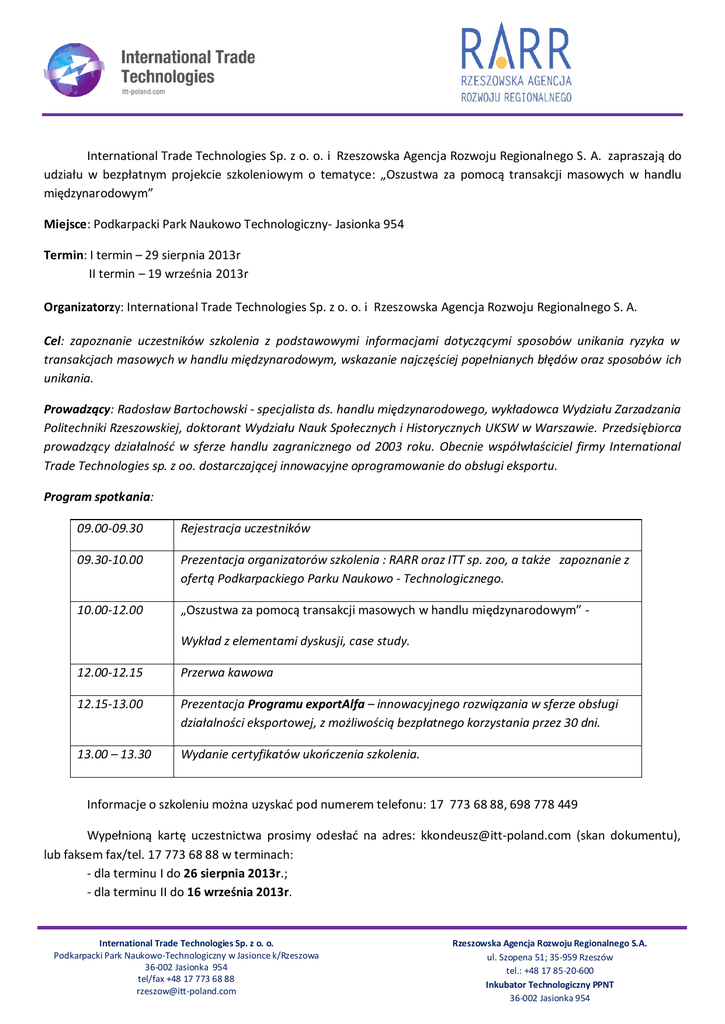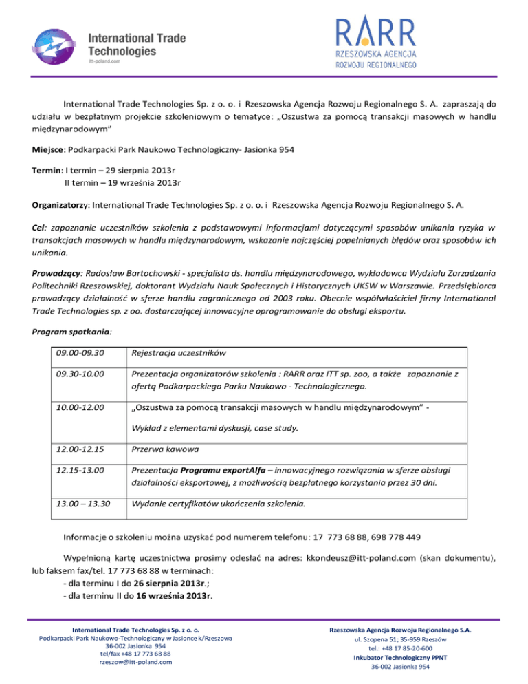 International Trade Technologies Sp. z o. o. i Rzeszowska Agencja Rozwoju Regionalnego S. A. zapraszają do udziału w bezpłatnym projekcie szkoleniowym o tematyce: „Oszustwa za pomocą transakcji masowych w handlu międzynarodowym” Miejsce: Podkarpacki Park Naukowo Technologiczny- Jasionka 954 Termin: I termin – 29 sierpnia 2013r II termin – 19 września 2013r Organizatorzy: International Trade Technologies Sp. z o. o. i Rzeszowska Agencja Rozwoju Regionalnego S. A. Cel: zapoznanie uczestników szkolenia z podstawowymi informacjami dotyczącymi sposobów unikania ryzyka w transakcjach masowych w handlu międzynarodowym, wskazanie najczęściej popełnianych błędów oraz sposobów ich unikania. Prowadzący: Radosław Bartochowski - specjalista ds. handlu międzynarodowego, wykładowca Wydziału Zarzadzania Politechniki Rzeszowskiej, doktorant Wydziału Nauk Społecznych i Historycznych UKSW w Warszawie. Przedsiębiorca prowadzący działalność w sferze handlu zagranicznego od 2003 roku. Obecnie współwłaściciel firmy International Trade Technologies sp. z oo. dostarczającej innowacyjne oprogramowanie do obsługi eksportu. Program spotkania: 09.00-09.30 Rejestracja uczestników 09.30-10.00 Prezentacja organizatorów szkolenia : RARR oraz ITT sp. zoo, a także zapoznanie z ofertą Podkarpackiego Parku Naukowo - Technologicznego. 10.00-12.00 „Oszustwa za pomocą transakcji masowych w handlu międzynarodowym” Wykład z elementami dyskusji, case study. 12.00-12.15 Przerwa kawowa 12.15-13.00 Prezentacja Programu exportAlfa – innowacyjnego rozwiązania w sferze obsługi działalności eksportowej, z możliwością bezpłatnego korzystania przez 30 dni. 13.00 – 13.30 Wydanie certyfikatów ukończenia szkolenia. Informacje o szkoleniu można uzyskać pod numerem telefonu: 17 773 68 88, 698 778 449 Wypełnioną kartę uczestnictwa prosimy odesłać na adres: [email protected] (skan dokumentu), lub faksem fax/tel. 17 773 68 88 w terminach: - dla terminu I do 26 sierpnia 2013r.; - dla terminu II do 16 września 2013r. International Trade Technologies Sp. z o. o. Podkarpacki Park Naukowo-Technologiczny w Jasionce k/Rzeszowa 36-002 Jasionka 954 tel/fax +48 17 773 68 88 [email protected] Rzeszowska Agencja Rozwoju Regionalnego S.A. ul. Szopena 51; 35-959 Rzeszów tel.: +48 17 85-20-600 Inkubator Technologiczny PPNT 36-002 Jasionka 954