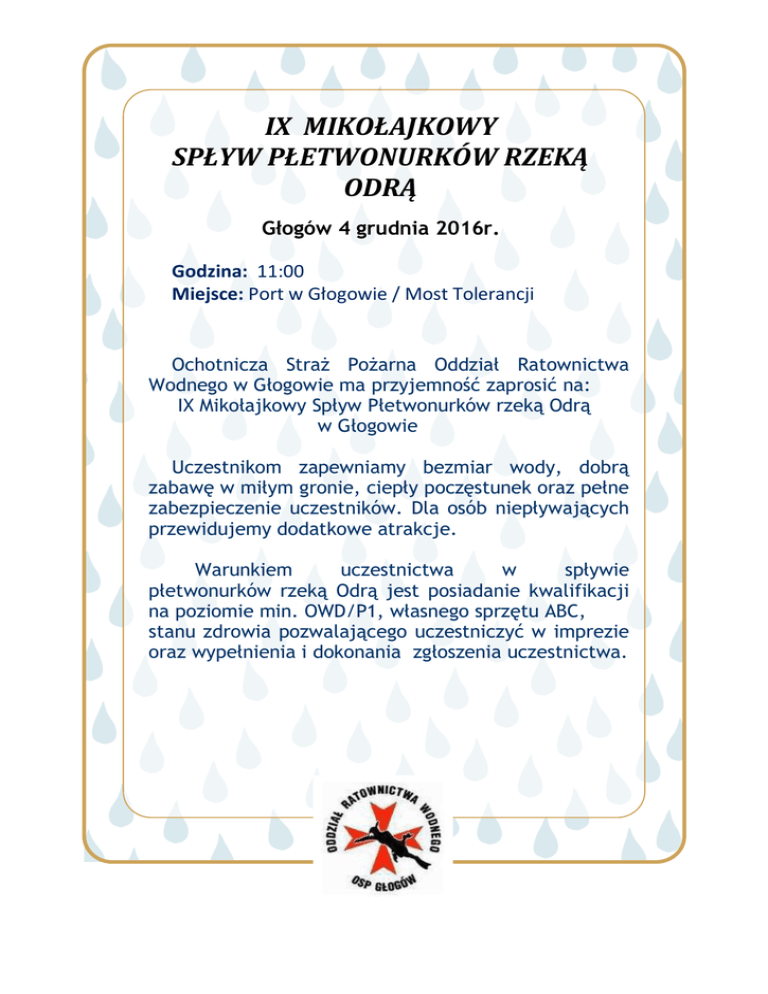 IX MIKOŁAJKOWY SPŁYW PŁETWONURKÓW RZEKĄ ODRĄ Głogów 4 grudnia 2016r. Godzina: 11:00 Miejsce: Port w Głogowie / Most Tolerancji Ochotnicza Straż Pożarna Oddział Ratownictwa Wodnego w Głogowie ma przyjemność zaprosić na: IX Mikołajkowy Spływ Płetwonurków rzeką Odrą w Głogowie Uczestnikom zapewniamy bezmiar wody, dobrą zabawę w miłym gronie, ciepły poczęstunek oraz pełne zabezpieczenie uczestników. Dla osób niepływających przewidujemy dodatkowe atrakcje. Warunkiem uczestnictwa w spływie płetwonurków rzeką Odrą jest posiadanie kwalifikacji na poziomie min. OWD/P1, własnego sprzętu ABC, stanu zdrowia pozwalającego uczestniczyć w imprezie oraz wypełnienia i dokonania zgłoszenia uczestnictwa. Kontakt w sprawach organizacyjnych- telefonicznie z: dh. Dariusz Michalewicz – 600 086 539 Prosimy o potwierdzenie uczestnictwa w spływie w nieprzekraczalnym terminie do dnia 20 listopada 2016r. W zgłoszeniu podać należy imiona i nazwiska uczestników, wiek oraz formację i miejscowość. Zgłoszenie przesłać na adres email: [email protected] PS. Uczestników prosimy o przybycie około godz. 9:30 w celu dopełnienia formalności. Wyjazd autobusu wodnego do miejsca wodowania o godz. 11:00 z miejsca zbiórki Uczestnicy spływu zgłoszeni po terminie będą aprowizowani przez organizatora w miarę możliwości logistycznych. Zgłoszenia przesłane po tym terminie (lub przekazane na miejscu) mogą spowodować jednak brak możliwości zapewnienia pełnego zaopatrzenia. Organizatorzy spływu OSP ORW w Głogowie