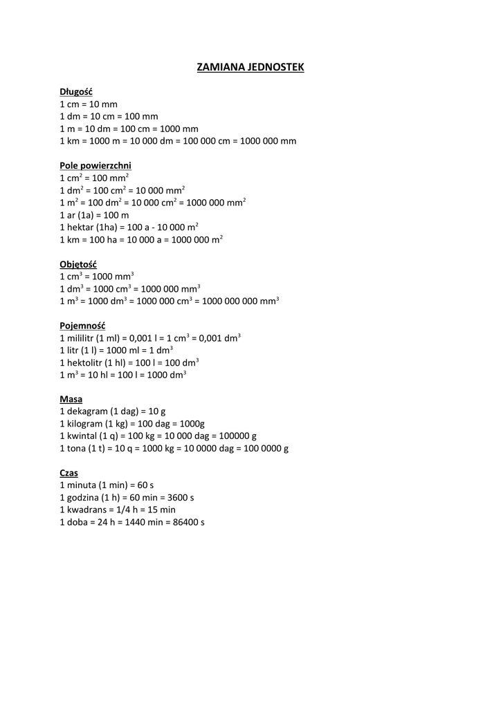 ZAMIANA JEDNOSTEK Długość 1 cm = 10 mm 1 dm = 10 cm = 100 mm 1 m = 10 dm = 100 cm = 1000 mm 1 km = 1000 m = 10 000 dm = 100 000 cm = 1000 000 mm Pole powierzchni 1 cm2 = 100 mm2 1 dm2 = 100 cm2 = 10 000 mm2 1 m2 = 100 dm2 = 10 000 cm2 = 1000 000 mm2 1 ar (1a) = 100 m 1 hektar (1ha) = 100 a - 10 000 m2 1 km = 100 ha = 10 000 a = 1000 000 m2 Objętość 1 cm3 = 1000 mm3 1 dm3 = 1000 cm3 = 1000 000 mm3 1 m3 = 1000 dm3 = 1000 000 cm3 = 1000 000 000 mm3 Pojemność 1 mililitr (1 ml) = 0,001 l = 1 cm3 = 0,001 dm3 1 litr (1 l) = 1000 ml = 1 dm3 1 hektolitr (1 hl) = 100 l = 100 dm3 1 m3 = 10 hl = 100 l = 1000 dm3 Masa 1 dekagram (1 dag) = 10 g 1 kilogram (1 kg) = 100 dag = 1000g 1 kwintal (1 q) = 100 kg = 10 000 dag = 100000 g 1 tona (1 t) = 10 q = 1000 kg = 10 0000 dag = 100 0000 g Czas 1 minuta (1 min) = 60 s 1 godzina (1 h) = 60 min = 3600 s 1 kwadrans = 1/4 h = 15 min 1 doba = 24 h = 1440 min = 86400 s