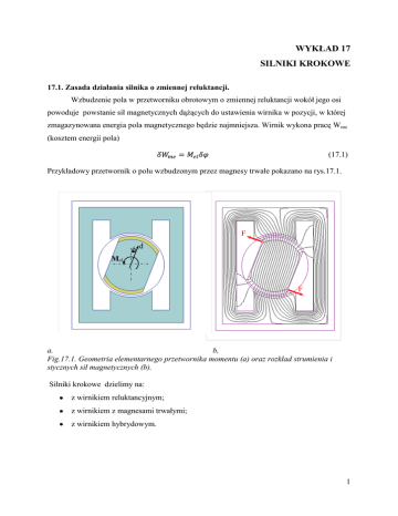 WYKŁAD 17 SILNIKI KROKOWE 17.1. Zasada działania silnika o zmiennej reluktancji. Wzbudzenie pola w przetworniku obrotowym o zmiennej reluktancji wokół jego osi powoduje powstanie sił magnetycznych dążących do ustawienia wirnika w pozycji, w której zmagazynowana energia pola magnetycznego będzie najmniejsza. Wirnik wykona pracę Wme (kosztem energii pola) (17.1) Przykładowy przetwornik o polu wzbudzonym przez magnesy trwałe pokazano na rys.17.1. F d Mel F a. b, Fig.17.1. Geometria elementarnego przetwornika momentu (a) oraz rozkład strumienia i stycznych sił magnetycznych (b). Silniki krokowe dzielimy na: z wirnikiem reluktancyjnym; z wirnikiem z magnesami trwałymi; z wirnikiem hybrydowym. 1 17.2. Silnik krokowy jednosegmentowy o wirniku reluktancyjnym. Najprostsza konstrukcja, kierunek momentu zależy jedynie od wyboru chwili włączenia danej fazy (a nie od kierunku prądu!). Dla uzwojeń oznaczonych jak na rys.17.2 wirowanie w prawo otrzymuje się dla sekwencji załączeń ACBACB... a w lewo dla ABCABC. często spotykana konstrukcja to 2 uzwojenia fazowe na 4 biegunach i 6 zębów wirnika. C B A A B C Rys.17.2. Krokowy silnik reluktancyjny trójfazowy o skoku 30 o - geometria (a) oraz rozkład strumienia po załączeniu fazy A do wirowania w lewo (b). A B N C Fig.17.3. Połączenia uzwojeń w trójfazowym silniku krokowym 2 17.3. Silnik krokowy trójsegmentowy o wirniku reluktancyjnym. Trzy identyczne stojany są przesunięte kątowo o 1/3 podziałki żłobkowej wirnika danym przypadku R=45 R, w o . Wirniki na wspólnym wale nie są przesunięte kątowo. Często spotykana jest sytuacja odwrotna. Kierunek wirowania wymusza sekwencja załączenia segmentów stojana – wszystkie uzwojenia w danym segmencie są włączone. Fig.17.4. Zewnętrzny widok silnika krokowego trójsegmentowego o skoku wirnika 45o. Jeżeli w danej chwili czasowej pracuje tylko jeden segment, to mówimy o tzw. pracy falowej. Wirowanie w lewo dla sekwencji załączeń CBACBA, w prawo dla CABCAB. Położenie równowagi występuje kiedy osie zębów stojana i wirnika w danym segmencie się pokryją. Schemat rzadko używany, ze względu na niski moment. Praca pełno-krokowa polega na jednoczesnym włączeniu dwu segmentów, na przykład dla wirowania w lewo CB, BA, AC, CB, BA, AC. Uzyskuje się znacznie większy moment niż przy pracy falowej. Położenie równowagi występuje pośrodku położeń równowagi przy pracy falowej Praca półkrokowa polega na sekwencyjnym przełączaniu pomiędzy jednoczesną pracą dwóch i jednego segmentu - na przykład dla wirowania w lewo CB, B, BA, A, AC, C. Uzyskuje się dwukrotnie mniejszy krok kosztem pewnej oscylacji momentu w czasie Praca mikro-krokowa polega na umożliwieniu przez odpowiednie sterowanie zasilacza więcej niż jednej ustalonej wartości prądu w danej fazie 3 1.2 1 0.8 C 0.6 A 0.4 B 0.2 0 0 1 2 3 4 5 6 Fig.17.5. Przebiegi prądów w segmentach silnika krokowego trójsegmentowego przy sterowaniu mikrokrokowym – mikrokrok 7.5o. B C A A B C Fig.17.5. Przekroje silnika krokowego trójsegmentowego o skoku wirnika 45o. 4 17.4. Silnik krokowy dwusegmentowy o wirniku hybrydowym. Polaryzacja magnetyczna wirnika wymaga przemiennego pola w biegunach stojana. Rys.17.6. Silnik krokowy dwusegmentowy hybrydowy o skoku wirnika 60o. Rys.17.7. Przekroje segmentów silnika krokowego hybrydowego o skoku wirnika 60o. 5 Wyróżnia się dwa typu uzwojeń: unipolarne – silnik posiada dwa uzwojenia na fazę, w danej chwili tylko jedno z nich wiedzie prąd. bipolarne – zasilacz (najczęściej przekształtnik typu H) pozwala na dwukierunkowy przepływ prądu w uzwojeniach fazowych a. b. Rys.17.8. Uzwojenie fazowe unipolarne (a), bipolarne (b) 6