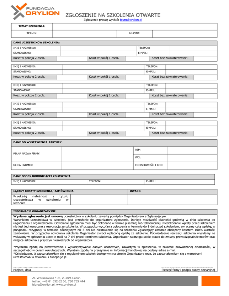 ZGŁOSZENIE NA SZKOLENIA OTWARTE Zgłoszenie proszę wysłać: [email protected] TEMAT SZKOLENIA: TERMIN: MIASTO: DANE UCZESTNIKÓW SZKOLENIA: IMIĘ I NAZWISKO: TELEFON: STANOWISKO: E-MAIL: Koszt w pokoju 2 osob. Koszt w pokój 1 osob. Koszt bez zakwaterowania: IMIĘ I NAZWISKO: TELEFON: STANOWISKO: E-MAIL: Koszt w pokoju 2 osob. Koszt w pokój 1 osob. Koszt bez zakwaterowania: IMIĘ I NAZWISKO: TELEFON: STANOWISKO: E-MAIL: Koszt w pokoju 2 osob. Koszt w pokój 1 osob. Koszt bez zakwaterowania: IMIĘ I NAZWISKO: TELEFON: STANOWISKO: E-MAIL: Koszt w pokoju 2 osob. Koszt w pokój 1 osob. Koszt bez zakwaterowania: IMIĘ I NAZWISKO: TELEFON: STANOWISKO: E-MAIL: Koszt w pokoju 2 osob. Koszt w pokój 1 osob. Koszt bez zakwaterowania: DANE DO WYSTAWIENIA FAKTURY: NIP: PEŁNA NAZWA FIRMY: FAX: ULICA I NUMER: MIEJSCOWOŚĆ I KOD: DANE OSOBY DOKONUJACEJ ZGŁOSZENIA: IMIĘ I NAZWISKO: ŁĄCZNY KOSZTY SZKOLENIA/ ZAMÓWIENIA: TELEFON: E-MAIL: UWAGI: Przekażę należność z tytułu uczestnictwa w szkoleniu w kwocie: INFORMACJE ORGANIZACYJNE: Wysłane zgłoszenie jest umową uczestnictwa w szkoleniu zawartą pomiędzy Organizatorem a Zgłaszającym. Warunkiem uczestnictwa w szkoleniu jest przesłanie do organizatora zgłoszenia. Istnieje możliwość płatności gotówką w dniu szkolenia po uzgodnieniu z organizatorem. Odwołanie zgłoszenia musi być dokonane w formie pisemnej lub telefonicznej. Niedokonanie wpłaty przed szkoleniem nie jest jednoznaczne z rezygnacją ze szkolenia. W przypadku wycofania zgłoszenia w terminie do 8 dni przed szkoleniem, zwracamy całą wpłatę; w przypadku rezygnacji w terminie późniejszym niż 8 dni lub niestawienie się na szkoleniu Zgłaszający zostanie obciążony kosztem 100% wartości zamówienia. W przypadku odwołania szkolenia Organizator zwróci wpłaconą opłatę za szkolenie. Potwierdzenie realizacji szkolenia wysyłamy na wskazany w zgłoszeniu adres e-mail na 7 dni przed terminem szkolenia. Organizator zastrzega sobie prawo do zmiany prowadzących/trenerów oraz miejsca szkolenia z przyczyn niezależnych od organizatora. *Wyrażam zgodę na przetwarzanie i wykorzystywanie danych osobowych, zawartych w zgłoszeniu, w zakresie prowadzonej działalności, w szczególności w celach rekrutacyjnych. Wyrażam zgodę na przesyłanie mi informacji handlowej na podany adres e-mail. *Oświadczam, iż zapoznałem/łam się z regulaminem szkoleń dostępnym na stronie Organizatora oraz, że zapoznałem/łam się z warunkami uczestnictwa w szkoleniu i akceptuje je. ……………………………………… Miejsce, dnia Al. Warszawska 102, 20-824 Lublin tel/fax: +48 81 532 62 06, 730 755 444 [email protected], www.orylion.pl ……………………………………………………………… Pieczęć firmy i podpis osoby decyzyjnej