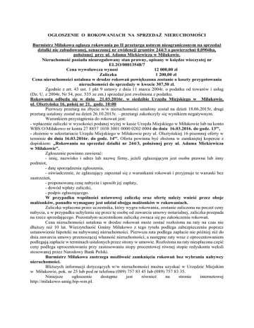 OGŁOSZENIE O ROKOWANIACH NA SPRZEDAŻ NIERUCHOMOŚCI Burmistrz Miłakowa ogłasza rokowania po II przetargu ustnym nieograniczonym na sprzedaż działki nie zabudowanej, oznaczonej nr ewidencji gruntów 244/3 o powierzchni 0,0904ha, położonej przy ul. Adama Mickiewicza w Miłakowie. Nieruchomość posiada nieuregulowany stan prawny, opisany w księdze wieczystej nr EL2O/00013548/7 Cena wywoławcza wynosi 12 000,00 zł Zaliczka 1 200,00 zł Cena nieruchomości ustalona w drodze rokowań powiększona zostanie o koszty przygotowania nieruchomości do sprzedaży w kwocie 307,50 zł. Zgodnie z art. 43 ust. 1 pkt 9 ustawy z dnia 11 marca 2004r. o podatku od towarów i usług (Dz. U. z 2004r, Nr 54, poz. 535 ze zm.) sprzedaż jest zwolniona z podatku. Rokowania odbędą się w dniu 21.03.2016r. w siedzibie Urzędu Miejskiego w Miłakowie, ul. Olsztyńska 16, pokój nr 21, godz. 10:00 Pierwszy przetarg na zbycie w/w nieruchomości ustalony został na dzień 18.06.2015r, drugi przetarg ustalony został na dzień 26.10.2015r. – przetargi zakończyły się wynikiem negatywnym. Warunkiem przystąpienia do rokowań jest: - wpłacenie zaliczki w wysokości podanej wyżej w kasie Urzędu Miejskiego w Miłakowie lub na konto WBS O/Miłakowo nr konta 27 8857 1038 3001 0000 0202 0004 do dnia 16.03.2016. do godz. 13ºº, - złożenie w sekretariacie Urzędu Miejskiego w Miłakowie przy ul. Olsztyńskiej 16 pisemnej oferty w terminie do dnia 16.03.2016r. do godz. 14ºº. Oferta powinna być złożona w zamkniętej kopercie z dopiskiem: „Rokowania na sprzedaż działki nr 244/3, położonej przy ul. Adama Mickiewicza w Miłakowie”. Zgłoszenie powinno zawierać: - imię, nazwisko i adres lub nazwę firmy, jeżeli zgłaszającym jest osoba prawna lub inny podmiot, - datę sporządzenia zgłoszenia, - oświadczenie, że zgłaszający zapoznał się z warunkami rokowań i przyjmuje te warunki bez zastrzeżeń, - proponowaną cenę nabycia i sposób jej zapłaty, - dowód wpłaty zaliczki, - podpis zgłaszającego. W przypadku wspólności ustawowej zaliczkę oraz ofertę należy wnieść przez oboje małżonków, ponadto wymagany jest udział obojga małżonków w rokowaniach. Zaliczka wpłacona przez uczestnika, który wygra rokowania, zostanie zaliczona na poczet ceny nabycia, a w przypadku uchylenia się przez tę osobę od zawarcia umowy notarialnej, zaliczka przepada na rzecz sprzedającego. Pozostałym uczestnikom zaliczkę zwraca się po zakończeniu rokowań. Cena nieruchomości ustalona w drodze rokowań może zostać rozłożona na raty na czas nie dłuższy niż 10 lat. Wierzytelność Gminy Miłakowo z tego tytułu podlega zabezpieczeniu poprzez ustanowienie hipoteki na nabywanej nieruchomości. Pierwsza rata podlega zapłacie nie później niż do dnia zawarcia umowy przenoszącej własność nieruchomości, a następne raty wraz z oprocentowaniem podlegają zapłacie w terminach ustalonych przez strony w umowie. Rozłożona na raty niespłacona część ceny podlega oprocentowaniu przy zastosowaniu stopy procentowej równej stopie redyskonta weksli stosowanej przez Narodowy Bank Polski. Burmistrz Miłakowa zastrzega możliwość zamknięcia rokowań bez wybrania nabywcy nieruchomości. Bliższych informacji dotyczących w/w nieruchomości można uzyskać w Urzędzie Miejskim w Miłakowie, pok. nr 25 lub pod nr telefonu (089) 757 83 45 lub (089) 757 83 35. Niniejsze ogłoszenie dostępne jest również na stronie internetowej http://milakowo-umig.bip-wm.pl.