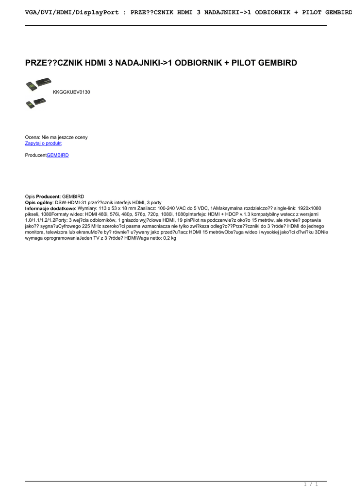 VGA/DVI/HDMI/DisplayPort : PRZE??CZNIK HDMI 3 NADAJNIKI->1 ODBIORNIK + PILOT GEMBIRD PRZE??CZNIK HDMI 3 NADAJNIKI->1 ODBIORNIK + PILOT GEMBIRD KKGGKUEV0130 Ocena: Nie ma jeszcze oceny Zapytaj o produkt ProducentGEMBIRD Opis Producent: GEMBIRD Opis ogólny: DSW-HDMI-31 prze??cznik interfejs HDMI, 3 porty Informacje dodatkowe: Wymiary: 113 x 53 x 18 mm Zasilacz: 100-240 VAC do 5 VDC, 1AMaksymalna rozdzielczo?? single-link: 1920x1080 pikseli, 1080Formaty wideo: HDMI 480i, 576i, 480p, 576p, 720p, 1080i, 1080pInterfejs: HDMI + HDCP v.1.3 kompatybilny wstecz z wersjami 1.0/1.1/1.2/1.2Porty: 3 wej?cia odbiorników, 1 gniazdo wyj?ciowe HDMI, 19 pinPilot na podczerwie?z oko?o 15 metrów, ale równie? poprawia jako?? sygna?uCyfrowego 225 MHz szeroko?ci pasma wzmacniacza nie tylko zwi?ksza odleg?o??Prze??czniki do 3 ?róde? HDMI do jednego monitora, telewizora lub ekranuMo?e by? równie? u?ywany jako przed?u?acz HDMI 15 metrówObs?uga wideo i wysokiej jako?ci d?wi?ku 3DNie wymaga oprogramowaniaJeden TV z 3 ?róde? HDMIWaga netto: 0,2 kg 1 / 1 Powered by TCPDF (www.tcpdf.org)