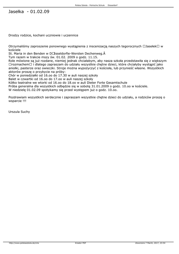 Polska Szkola - Polnische Schule Düsseldorf Jasełka - 01.02.09 Drodzy rodzice, kochani uczniowie i uczennice Otrzymaliśmy zaproszenie ponownego wystąpienia z inscenizacją naszych tegorocznych Jasełek w kościele St. Maria in den Benden w DÃźsseldorfie-Wersten Dechenweg. Tym razem w trakcie mszy św. 01.02. 2009 o godz. 11.15. Role mówione są już rozdane, niemiej jednak chciałabym, aby nasza szkoła przedstawiła się z większym rozmachem i dlatego zapraszam do udziału wszystkie chętne dzieci, które chciałyby wystąpić jako aniołki, pasterze oraz owieczki. Stroje można wypożyczyć z kościoła, lub przynieść własne. Wszystkich aktorów proszę o przybycie na próby: Chór w poniedziałki od 16.oo do 17.30 w auli naszej szkoły Balet w czwartki od 16.oo do 17.oo w auli naszej szkoły Kółko teatralne we wtorki od 16.oo do 18.oo w auli Dieter Forte Gesamtschule Próba generalna dla wszystkich odbędzie się w sobotę 31.01.2009 o godz. 10.oo w kościele. W niedzielę 01.02.09 spotykamy się przed występem już o godz. 10.oo. Pozdrawiam wszystkich serdecznie i zapraszam wszystkie chętne dzieci do udziału, a rodziców proszę o wsparcie !!! Urszula Suchy http://www.polskaszkola.de/cms Kreator PDF Utworzono 7 March, 2017, 23:54