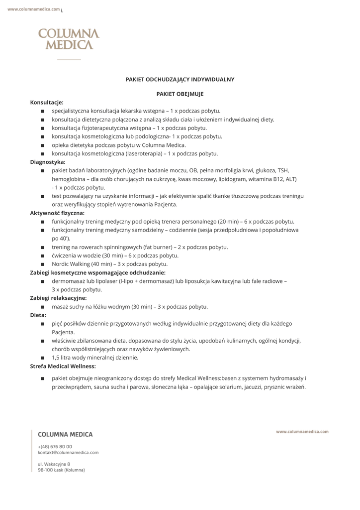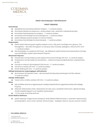 PAKIET ODCHUDZA JĄCY INDYWIDUALNY PAKIET OBEJMUJE Konsultacje: specjalistyczna konsultacja lekarska wstępna – 1 x podczas pobytu. konsultacja dietetyczna połączona z analizą składu ciała i ułożeniem indywidualnej diety. konsultacja fizjoterapeutyczna wstępna – 1 x podczas pobytu. konsultacja kosmetologiczna lub podologiczna- 1 x podczas pobytu. opieka dietetyka podczas pobytu w Columna Medica. konsultacja kosmetologiczna (laseroterapia) – 1 x podczas pobytu. Diagnostyka: pakiet badań laboratoryjnych (ogólne badanie moczu, OB, pełna morfoligia krwi, glukoza, TSH, hemoglobina – dla osób chorujących na cukrzycę, kwas moczowy, lipidogram, witamina B12, ALT) - 1 x podczas pobytu. test pozwalający na uzyskanie informacji – jak efektywnie spalić tkankę tłuszczową podczas treningu oraz weryfikujący stopień wytrenowania Pacjenta. Aktywność fizyczna: funkcjonalny trening medyczny pod opieką trenera personalnego (20 min) – 6 x podczas pobytu. funkcjonalny trening medyczny samodzielny – codziennie (sesja przedpołudniowa i popołudniowa po 40'). trening na rowerach spinningowych (fat burner) – 2 x podczas pobytu. ćwiczenia w wodzie (30 min) – 6 x podczas pobytu. Nordic Walking (40 min) – 3 x podczas pobytu. Zabiegi kosmetyczne wspomagające odchudzanie: dermomasaż lub lipolaser (I-lipo + dermomasaż) lub liposukcja kawitacyjna lub fale radiowe – 3 x podczas pobytu. Zabiegi relaksacyjne: masaż suchy na łóżku wodnym (30 min) – 3 x podczas pobytu. Dieta: pięć posiłków dziennie przygotowanych według indywidualnie przygotowanej diety dla każdego Pacjenta. właściwie zbilansowana dieta, dopasowana do stylu życia, upodobań kulinarnych, ogólnej kondycji, chorób współistniejących oraz nawyków żywieniowych. 1,5 litra wody mineralnej dziennie. Strefa Medical Wellness: pakiet obejmuje nieograniczony dostęp do strefy Medical Wellness:basen z systemem hydromasaży i przeciwprądem, sauna sucha i parowa, słoneczna łąka – opalające solarium, jacuzzi, prysznic wrażeń. Dodatkowe informacje: dostęp do strzeżonego parkingu bezprzewodowy Internet na terenie całego obiektu Cena: 569zł/doba/osoba* *Powyższa kwota dotyczy 1 doby hotelowej w pokoju jednosobowym. Pakiet obejmuje min. 6 dób.Dopłata do apartamentu 409zł/doba. NASZE REKOMENDACJE: Podczas pobytu istnieje możliwość skorzystania z dodatkowych usług za dodatkową opłatą m.in.: zabiegów relaksacyjnych zabiegów z zakresu medycyny estetycznej specjalistycznych zabiegów podologicznych specjalistycznych zabiegów kosmetycznych zakupu kosmetyków celem utrzymania efektów relaksacji