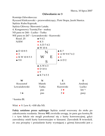 Sława, 10 lipca 2007 Odwołanie nr 3 Komisja Odwoławcza: Ryszard Kiełczewski – przewodniczący, Piotr Stopa, Jacek Stasica. Sędzia: Kuba Kaprzak. Sędzia Główny: Sławomir Latała. 4. Kongresowy Turniej Par - maksy NS para nr 244 – Lućko - Tutka WE para nr 267 – Lewandowski - Kurowski Rozd. 25 ♠942 N/EW ♥K5 ♦AD742 ♣ W 10 4 ♠ D 10 8 5 ♠K7 N ♥3 ♥AW98762 ♦ K W 10 8 5 3 W E ♦6 ♣98 ♣AD2 S ♠AW63 ♥ D 10 4 ♦9 ♣K7653 W Krzysztof Lewandowski 1♠ 1) N Marek Tutka pas pas E Lech Kurowski 1♥ 3♥ S Andrzej Lućko ktr 1) pasy kontra BI. Wist: ♦ 9. Lew 8, +100 dla NS. Fakty ustalone przez sędziego: Sędzia został wezwany do stołu po zakończeniu rozdania. Strona WE zwróciła uwagę, że para gra kontrą Bi i o tym fakcie nie mogli przekonać się z karty konwencyjnej, gdyż zawodnicy mieli karty konwencyjne w kieszeni. Zawodnik S twierdził, że zna przepisy i posiadanie karty wystającej z górnej kieszonki jest z 2 nimi zgodne. Komisja Sędziowska miał jednakże odmienne zdanie. Zawodnik W stwierdził, że gdyby wiedział, że kontra ma odmienny charakter, niż wywoławcza, a w szczególności wskazuje na cztery piki, to zgłoszenie ich nie przyszłoby mu do głowy. Po ewentualnym pasie W, N wywoła młodszy kolor poprzez 2 ♣, a E powtórzy kiery na poziomie dwóch i stanie się rozgrywającym. Taki byłby najbardziej prawdopodobny przebieg wydarzeń. Decyzja Komisji Sędziowskiej: Rezultat rozjemczy 2♥, lew 8, 110 dla WE. NS złożyli odwołanie. Odwołanie rozpatrywano w obecności obu par, sędziego orzekającego i sędziego głównego. Zawodnik S w swoich wyjaśnieniach skupił się na motywie karty konwencyjnej, która wystając z kieszonki na 2-2,5 cm jest wystarczającym dowodem na jej posiadanie. Komisja zwróciła uwagę, że sprawa nie dotyczy posiadania karty konwencyjnej, lecz uprzedzenia przeciwników o stosowaniu nietypowych rozwiązań licytacyjnych. Prawidłowym działaniem takiej pary jest przedłożenie kart konwencyjnych przeciwnikom przed rozpoczęciem gry. Para przeciwników winna mieć możliwość przygotowania obrony przeciwko wzmiankowanym nietypowym rozwiązaniom licytacyjnym. Karta powinna być wypełniona prawidłowo z zaznaczonymi w czołówce karty konwencjami, przeciwko którym należy przygotować obronę. Decyzja Komisji Odwoławczej: 1. Podtrzymać decyzję sędziego. 2. Orzec przepadek kaucji z uwagi na brak zasadności odwołania. Protokół z rozdania: http://www.pzbs.pl/wyniki/2007/krajowe/slawa07/k10/index.html