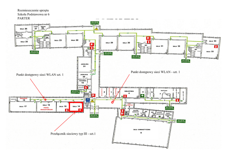 Rozmieszczenie sprzętu Szkoła Podstawowa nr 6 PARTER Punkt dostępowy sieci WLAN szt. 1 Przełącznik sieciowy typ III - szt.1 Punkt dostępowy sieci WLAN - szt. 1