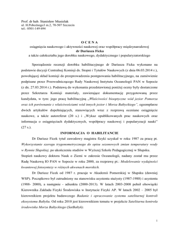 Prof. dr hab. Stanisław Musielak ul. H.Pobożnego3 m.2, 70-507 Szczecin tel.: 0501-149 694 OCENA osiągnięcia naukowego i aktywności naukowej oraz współpracy międzynarodowej dr Dariusza Ficka a także całokształtu jego dorobku naukowego, dydaktycznego i popularyzatorskiego Sporządzenie recenzji dorobku habilitacyjnego dr Dariusza Ficka wykonano na podstawie decyzji Centralnej Komisji ds. Stopni i Tytułów Naukowych (z dnia 06.03.2014 r.), powołującej skład komisji do przeprowadzenia postępowania habilitacyjnego, na zamówienie podpisane przez Przewodniczącego Rady Naukowej Instytutu Oceanologii PAN w Sopocie (z dn. 27.03.2014 r.). Podstawą do wykonania przedstawionej poniżej oceny były dostarczone przez Sekretarza Komisji materiały, zawierające dokumentację przygotowaną przez kandydata, w tym: jego pracę habilitacyjną „Właściwości biooptyczne wód jezior Pomorza oraz ich porównanie z właściwościami wód innych jezior i Morza Bałtyckiego”, egzemplarze dwóch artykułów dopełniających, stanowiących wraz z rozprawą oceniane osiągnięcie naukowe, a także autoreferat (20 s.) i „Wykaz opublikowanych prac naukowych oraz informacja o osiągnięciach dydaktycznych, współpracy naukowej i popularyzacji nauki” (27 s.). INFORMACJA O HABILITANCIE Dr Dariusz Ficek tytuł zawodowy magistra fizyki uzyskał w roku 1987 za pracę pt. Wykorzystanie szeregu trygonometrycznego do opisu sezonowych zmian temperatury wody w Rynnie Słupskiej, po ukończeniu studiów w Wyższej Szkole Pedagogicznej w Słupsku. Stopień naukowy doktora Nauk o Ziemi w zakresie Oceanologii, nadany został mu przez Radę Naukową IO PAN w Sopocie w roku 2000, za rozprawę pt.: Modelowanie wydajności kwantowej fotosyntezy w różnych akwenach morskich. Dr Dariusz Ficek od 1987 r. pracuje w Akademii Pomorskiej w Słupsku (dawniej WSP). Początkowo był zatrudniony na stanowisku asystenta stażysty (1987-1988) i asystenta (1988- 2000), a następnie - adiunkta (2000-2013). W latach 2003-2008 pełnił obowiązki Kierownika Zakładu Fizyki Środowiska w Instytucie Fizyki AP. W latach 2002 – 2005 był kierownikiem projektu badawczego Badanie i opracowanie systemu satelitarnej kontroli ekosystemu Bałtyku. Od roku 2010 jest kierownikiem tematu w projekcie Satelitarna kontrola środowiska Morza Bałtyckiego (SatBałtyk). 1 OCENA OSIĄGNIĘCIA NAUKOWEGO Osiągnięcie naukowe dr Dariusza Ficka stanowiące przedmiot niniejszej oceny zostało przedstawione w rozprawie habilitacyjnej (monografia) pt.: Właściwości biooptyczne jezior Pomorza oraz ich porównanie z właściwościami innych jezior i Morza Bałtyckiego, wydanej w „Rozprawy i Monografie” t. 23/2013, przez Instytut Oceanologii PAN w Sopocie oraz dodatkowo w dwóch następujących artykułach, w których jest on pierwszym współautorem (jego udział w tych publikacjach wynosi 80%, co potwierdzone zostało w załączonych oświadczeniach pozostałych współautorów): 1) Ficek D., Zapadka T., Dera J., 2011, Remote sensing reflectance of Pomeranian lakes and the Baltic, Oceanologia 2011, 53(4), 959-970. 2) Ficek D., Meler J., Zapadka T., Woźniak B., Dera J., 2012, Inherent optical properties and remote sensing reflectance of Pomeranian lakes (Poland), Oceanologia 54(4), 611-630. Rozprawa habilitacyjna dr Dariusza Ficka zawiera 351 stron, w tym 273 strony tekstu z 133 rysunkami i 45 tabelami oraz spis literatury obejmujący 351 pozycji bibliograficznych, z których ponad 85% opublikowana została w języku angielskim, 34 prac w języku polskim i kilka - w rosyjskim oraz niemieckim. W zdecydowanej większości są to prace, które ukazały się w ostatnich kilkunastu latach. Praca skonstruowana jest logicznie i przejrzyście. Jej tekst podzielono na wstęp oraz osiem rozdziałów, z których ostatni zawiera podsumowanie i wnioski końcowe. We „Wstępie” (3, 5 s.) klarownie zarysowana została problematyka badawcza oraz określono zarówno cel pracy, jak i jej zakres. Przedmiotem wieloletnich badań przeprowadzonych przez habilitanta były właściwości optyczne różnych akwenów naturalnych, w tym m.in. rejony przybrzeżne mórz i wody jeziorne. Jak podkreśla to autor pracy, pomimo intensywnych badań właściwości optycznych wód naturalnych i zawartych w nich optycznie aktywnych składników, prowadzonych w wielu ośrodkach naukowych na świecie, problemy te nadal pozostają zbadane jedynie w niewielkim stopniu, przede wszystkim ze względu na niezwykle złożone regionalne zróżnicowanie składu oraz właściwości optycznych wód naturalnych. Pod względem właściwości biooptycznych bardzo słabo poznane są też wody polskich jezior. Z tego też względu, za główny merytoryczny cel pracy habilitant przyjął „zbadanie i opisanie biooptycznych właściwości wód jezior środkowej części Pomorza”. 2 Wszystkie analizowane w rozprawie dr D. Ficka właściwości biooptyczne badanych wód odnoszą się do światła widzialnego i jego bliskiego otoczenia (nadfiolet, podczerwień). Są to zakresy spektralne promieniowania słonecznego, którego energia determinuje większość procesów biologicznych, fizycznych i chemicznych, warunkujących życie na Ziemi. Autor rozprawy uzasadnia tezę, że współczesne badania środowiska wodnego oprócz technik tradycyjnych związanych z pomiarami prowadzonymi bezpośrednio z pokładu jednostek pływających, wymagają stosowania metod zdalnych (teledetekcyjnych), wykorzystujących optyczne urządzenia pomiarowe zainstalowane na samolotach i satelitach. Jednakże zastosowanie tych metod, wymaga opracowania odpowiednich algorytmów teledetekcyjnych, opartych na związkach matematycznych i modelach, opisujących zależności pomiędzy zawartymi w wodzie optycznie aktywnymi składnikami materii a charakterystykami optycznymi tych wód. Dlatego też habilitant sformułował dodatkowy cel praktyczny pracy: „opracowanie algorytmów pozwalających na określanie zawartości optyczn