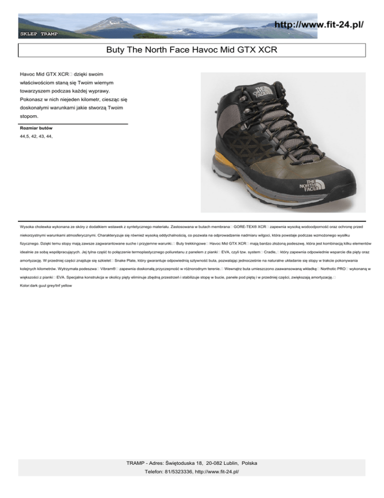 http://www.fit-24.pl/ Buty The North Face Havoc Mid GTX XCR Havoc Mid GTX XCR dzięki swoim właściwościom staną się Twoim wiernym towarzyszem podczas każdej wyprawy. Pokonasz w nich niejeden kilometr, ciesząc się doskonałymi warunkami jakie stworzą Twoim stopom. Rozmiar butów 44,5, 42, 43, 44, Wysoka cholewka wykonana ze skóry z dodatkiem wstawek z syntetycznego materiału. Zastosowana w butach membrana GORE-TEX® XCR zapewnia wysoką wodoodporność oraz ochronę przed niekorzystnymi warunkami atmosferycznymi. Charakteryzuje się również wysoką oddychalnością, co pozwala na odprowadzenie nadmiaru wilgoci, która powstaje podczas wzmożonego wysiłku fizycznego. Dzięki temu stopy mają zawsze zagwarantowane suche i przyjemne warunki. Buty trekkingowe Havoc Mid GTX XCR mają bardzo złożoną podeszwę, która jest kombinacją kilku elementów idealnie ze sobą współpracujących. Jej tylna część to połączenie termoplastycznego poliuretanu z panelem z pianki EVA, czyli tzw. system Cradle, który zapewnia odpowiednie wsparcie dla pięty oraz amortyzację. W przedniej części znajduje się szkielet Snake Plate, który gwarantuje odpowiednią sztywność buta, pozwalając jednocześnie na naturalne układanie się stopy w trakcie pokonywania kolejnych kilometrów. Wytrzymała podeszwa Vibram® zapewnia doskonałą przyczepność w różnorodnym terenie. Wewnątrz buta umieszczono zaawansowaną wkładkę Northotic PRO wykonaną w większości z pianki EVA. Specjalna konstrukcja w okolicy pięty eliminuje zbędną przestrzeń i stabilizuje stopę w bucie, panele pod piętą i w przedniej części, zwiększają amortyzację. Kolor:dark guul grey/tnf yellow TRAMP - Adres: Świętoduska 18, 20-082 Lublin, Polska Telefon: 81/5323336, http://www.fit-24.pl/ http://www.fit-24.pl/ TRAMP - Adres: Świętoduska 18, 20-082 Lublin, Polska Telefon: 81/5323336, http://www.fit-24.pl/