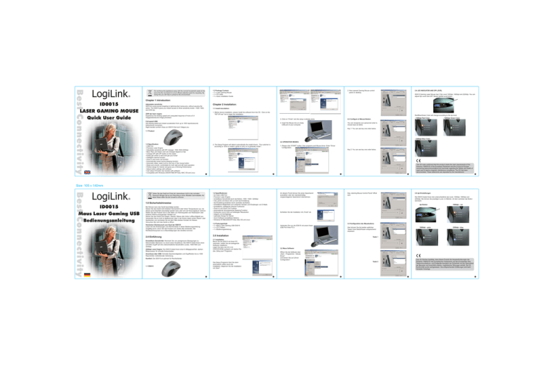 Best Connectivity ID0015 LASER GAMING MOUSE Quick User Guide 1.3 Package Content: • 1 x Laser Gaming Mouse • 1 x CD Utility • 1 x Quick Installation Guide Do not throw the appliance away with the normal household waste at the end of its life, but hand it in at an official collection point for recycling. By doing this you will help to preserve the environment. 2.4 LED INDICATOR AND DPI LEVEL 2. Now opened Gaming Mouse control panel on desktop. ID0015 Gaming Laser Mouse has 3 Dpi Level 1000dpi, 1600dpi and 2200dpi. You can adjust Dpi Level click DPI” Button beside scroll button. Chapter 1 Introduction: Chapter 2 Installation: Adjustable sensitivity: Shift from pixel-precise targeting to lightning-fast maneuvers, without pausing the action. The ID0015 gives you instant access to three sensitivity levels—1000, 1600, and 2200 dpi. 1.1 Install elucidation: 1. Before device installation, please install the software from the CD. Click on the “SETUP exe” link to begin the installation. 2200 dpi laser engine: Experience the blinding speed and unequaled response of more a 6.4 megapixels/second image processor. Red/Blue/Green Color will change according to the dpi level. Full-speed USB: Get blazing speed and instant acceleration from up to 1000 reports/second; bidirectional connection. Right-handed comfort: Enjoy an ID0015 that won’t fatigue you. - 1000dpi Red Color 3. Click on “Finish” and the setup is already done. 2.3 Configure of Mouse Button: 4. Insert the Mouse into an empty USB port of your computer. You can recognize your personnel order to mouse keys as below. - 1600dpi Green Color Key 1: You can see key one order below. 1.1 Product - 2200dpi Blue Color 2.2 OPERATION MODES: 1.2 Specification: • USB Port • Precision Laser Engine • Adjustable sensitivity with DPI changer: 1000-1600-2200dpi • Blue, Red, and Green color are changed depend on Dpi • Change DPI with DPI button on the center • Easily get online to send and get your Email • Intelligent internet function • Zoom in and zoom out function • Automatically power-saving sleeping function • Automatic sleep; wake-it-up by click any of the mouse button • Sleek and smooth, comfortable for both right and left hand operation • Perfect design for Gamer and gives you a Winning Performance • Adjust button settings with software • Can setup 4/5 button any function with software • Compatible with Windows 2000/NT/ME/XP/Vista, MAC OS and Linux 2. The Setup Program will detect automatically the install drivers . The customer is according to "drive to install a guide to carry on to gradually install ". 1. Please click “START” button, then programs and Mouse driver. Enter “Driver Configuration. Key 2: You can see key one order below. The CE mark confirmed that this product meets the main requirements of the Directive 1999/5/CE of the European Parliament and the Council of Europe concerning telecommunications and terminals regarding the Safety and health of users and of electro-magnetic interference compliance. The CE has been demonstrated. These statements are deposited by the manufacturer. 1 2 3 4 5 Size: 105 x 140mm Best Connectivity ID0015 Maus Laser Gaming USB Bedienungsanleitung Geben Sie das Gerät am Ende der Lebensdauer nicht in den normalen Hausmüll. Bringen Sie es zum Recycling zu einer offiziellen Sammelstelle. Auf diese Weise helfen Sie die Umwelt zu schonen. 1.0 Sicherheitshinweise Bei Stürzen kann das Gerät beschädigt werden. Setzen Sie das Gerät nicht direktem Sonnenlicht oder hohen Temperaturen aus, da dieses sonst ebenfalls beschädigt werden kann oder sich die Nutzungsdauer verkürzt. Stellen Sie das Produkt nicht in der Nähe von Wärmequellen wie Heizkörpern oder anderen Wärme erzeugenden Geräten auf. Setzen Sie das Gerät nicht Regen, Wasser, Nässe oder hoher Luftfeuchtigkeit aus. Verwenden Sie es nicht im Badezimmer oder in der Küche neben einem Wasch- oder Spülbecken und vermeiden Sie auf alle Fälle direkten Kontakt mit Wasser. Versuchen Sie nicht das Gerät zu öffnen. Herzlichen Glückwunsch zum Kauf der ID0015! Lesen Sie die Anweisungen und Warnhinweise in dieser Bedienungsanleitung sorgfältig durch, bevor Sie das Produkt zum ersten Mal verwenden. Bei Nichtbeachtung kann es zu Beschädigungen des Gerätes kommen. 1.2 Spezifikationen • ein freier USB Port • Precision Laser Engine • einstellbare Sensitivität durch dpi Button: 1000 / 1600 / 2200dpi • rote, grüne und blaue LED, je nach dpi Einstellung • dpi Einstellung änderbar durch zentralen dpi Button • einstellbare Möglichkeit zum einfachen Senden und Empfangen von E-Mails • einstellbare, intelligente Internet Funktionen • Zoom In und Zoom Out Funktion • automatische stromsparende Sleeping Funktion • Aufwecken durch Klick auf beliebigen Mausbutton • elegant und leichtgängig • optimales Design für Gamer • durch Software einstellbare Buttons • Windows NT/ME/2000/XP/Vista, Mac OS und Linux An diesem Punkt können Sie einen Speicherort auswählen oder den standardmäßig vorgeschlagenen Speicherort übernehmen. Die ID0015 bietet Ihnen drei unterschiedliche dpi Level, 1000dpi, 1600dpi und 2200dpi. Sie können die jeweiligen Level, im Betrieb, mit dem zentralen dpi Button wechseln. 1.3 Packungsinhalt • 1 x Maus Laser Gaming USB ID0015 • 1 x CD (Treiber) • 1 x Bedienungsanleitung 2200dpi Laser Engine: Die ID0015 bietet Ihnen einen 6.4Megapixel/Sek. starken Bildprozessor für schnelle Antwortzeiten. Hier können Sie die beiden seitlichen Tasten Ihren Bedürfnissen entsprechend anpassen. 2200dpi - blau 3.2 Maus Software Öffnen Sie die Software über „Start – Programme – Mouse Driver“ und klicken Sie auf „Driver Configuration“. Komfort: Die ID0015 ist optimiert für Rechtshänder. Das CE-Zeichen bestätigt, dass dieses Produkt die Hauptanforderungen der Richtlinie 1999/5/CE des Europäischen Parlaments und des Europarates über Telekommunikations- und Endgeräte bezügl